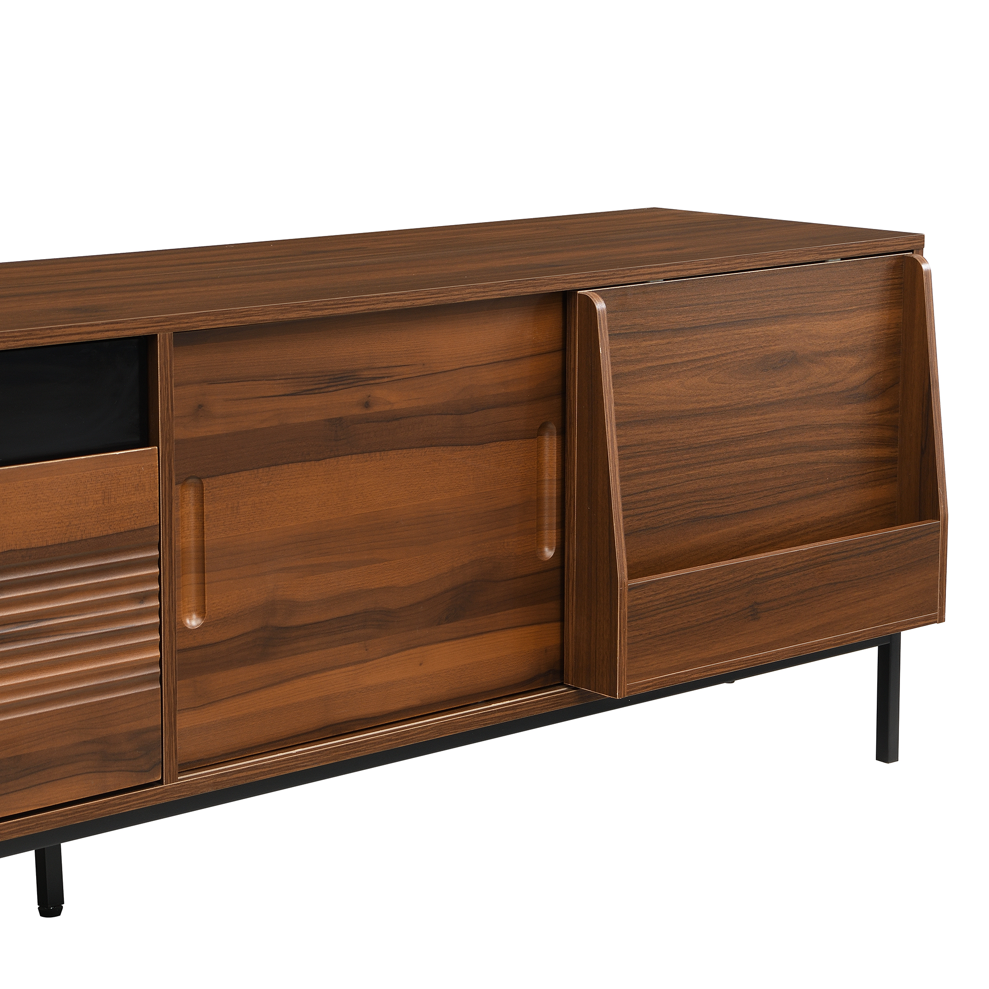 Elevate your living room with this sleek and contemporary TV Cabinet. Designed to combine style, durability, and practicality, this minimalist TV stand features a beautiful walnut wood sticker, complemented by a black metal frame for a sophisticated, modern look. Ideal for organizing your entertainment area, this cabinet provides ample storage while maintaining a clean and tidy aesthetic.