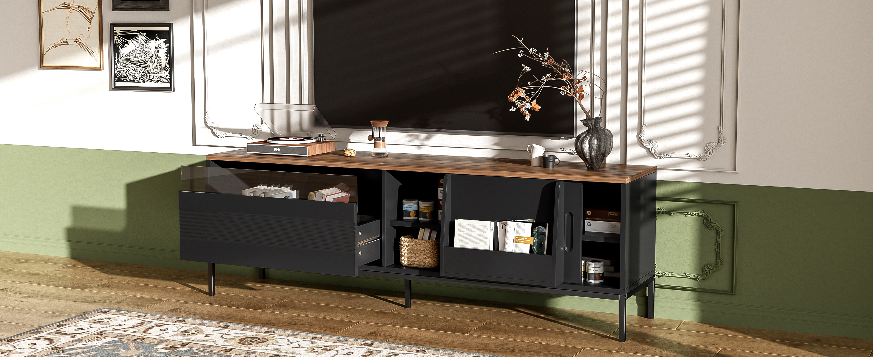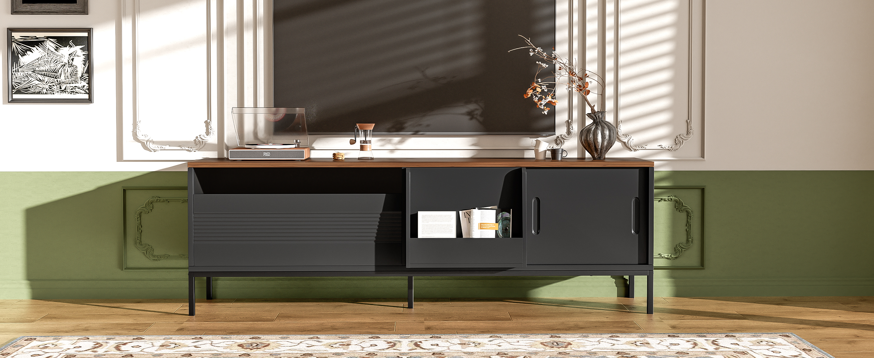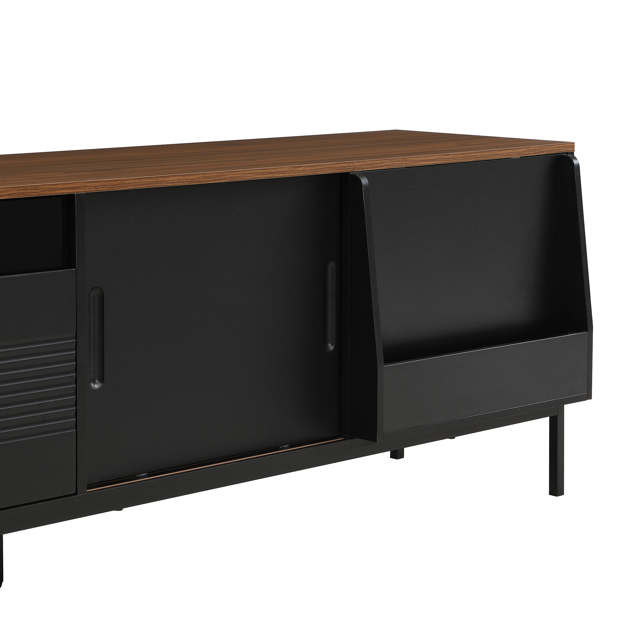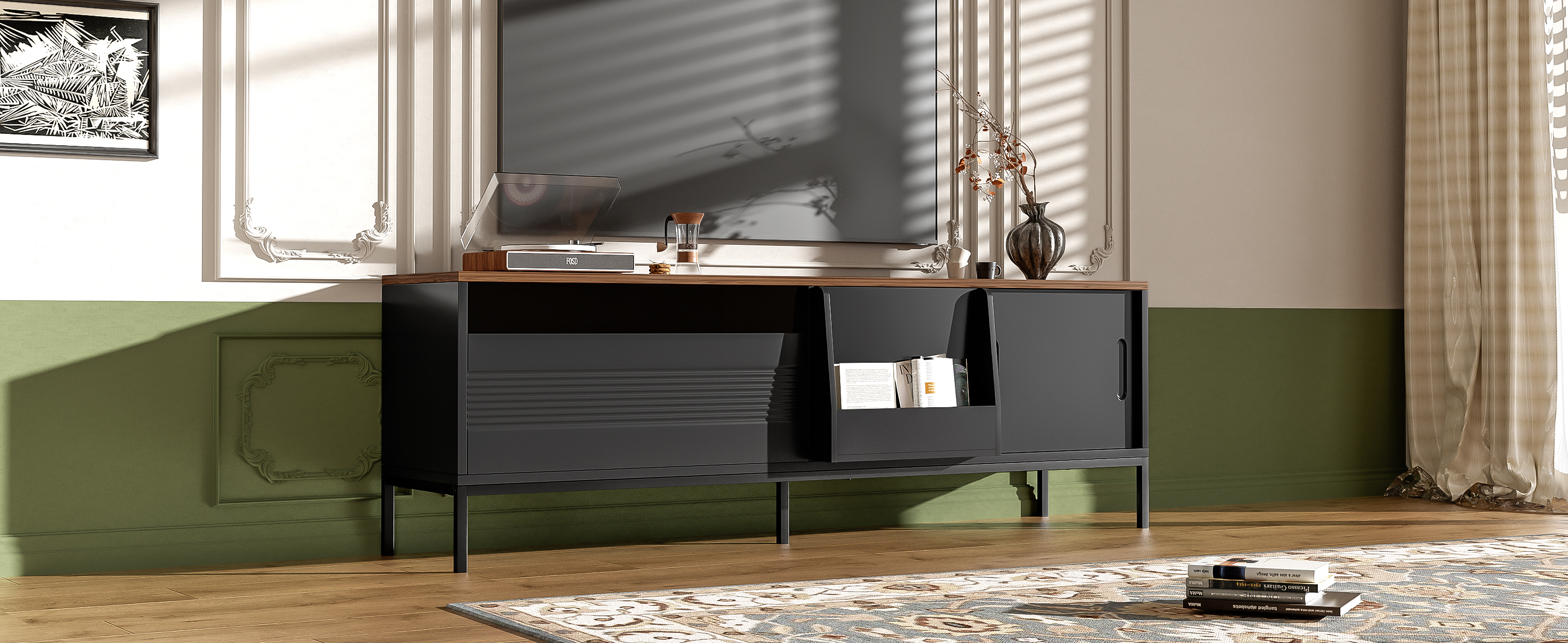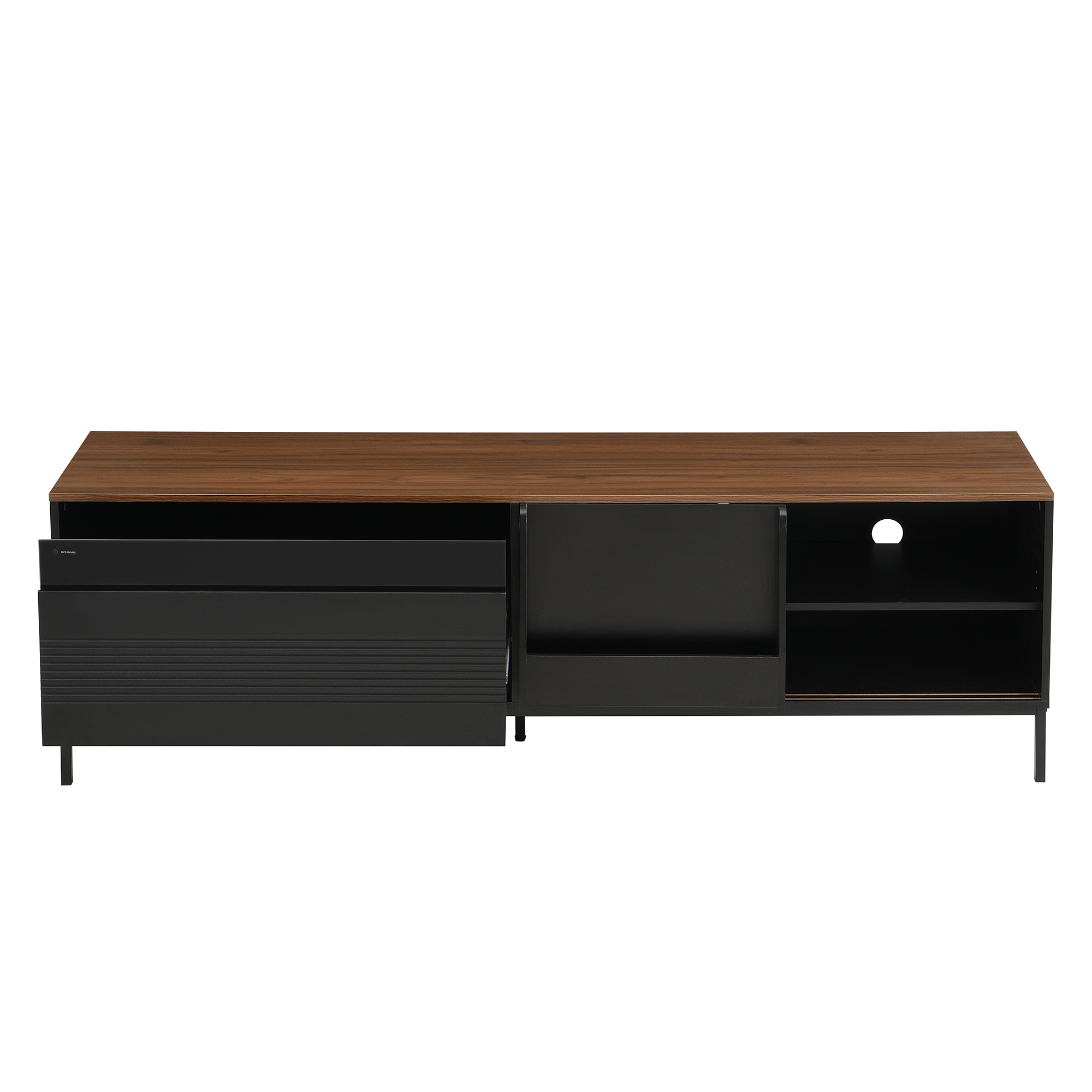 Elevate your living room with this sleek and contemporary TV Cabinet. Designed to combine style, durability, and practicality, the top of this minimalist TV stand features a beautiful walnut wood sticker, complemented by a black body and metal frame for a sophisticated, modern look. Ideal for organizing your entertainment area, this cabinet provides ample storage while maintaining a clean and tidy aesthetic.