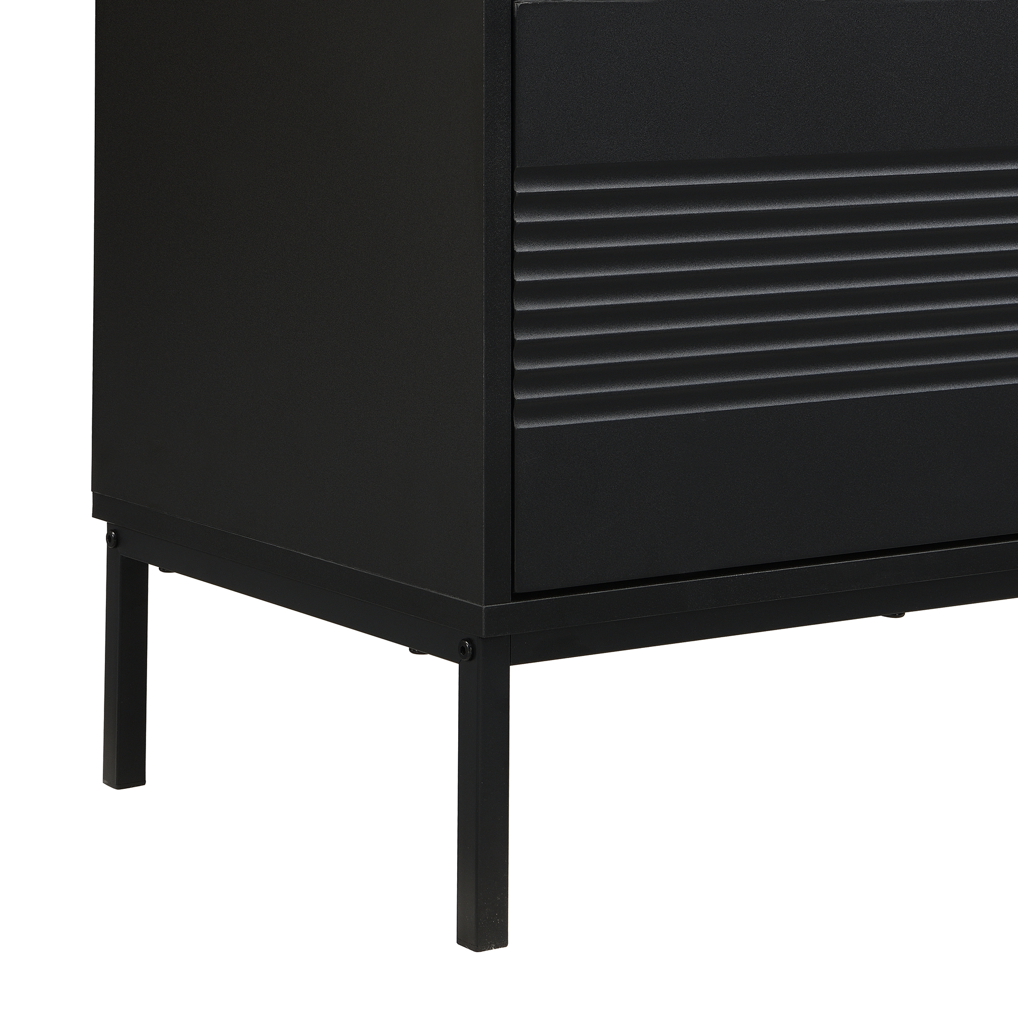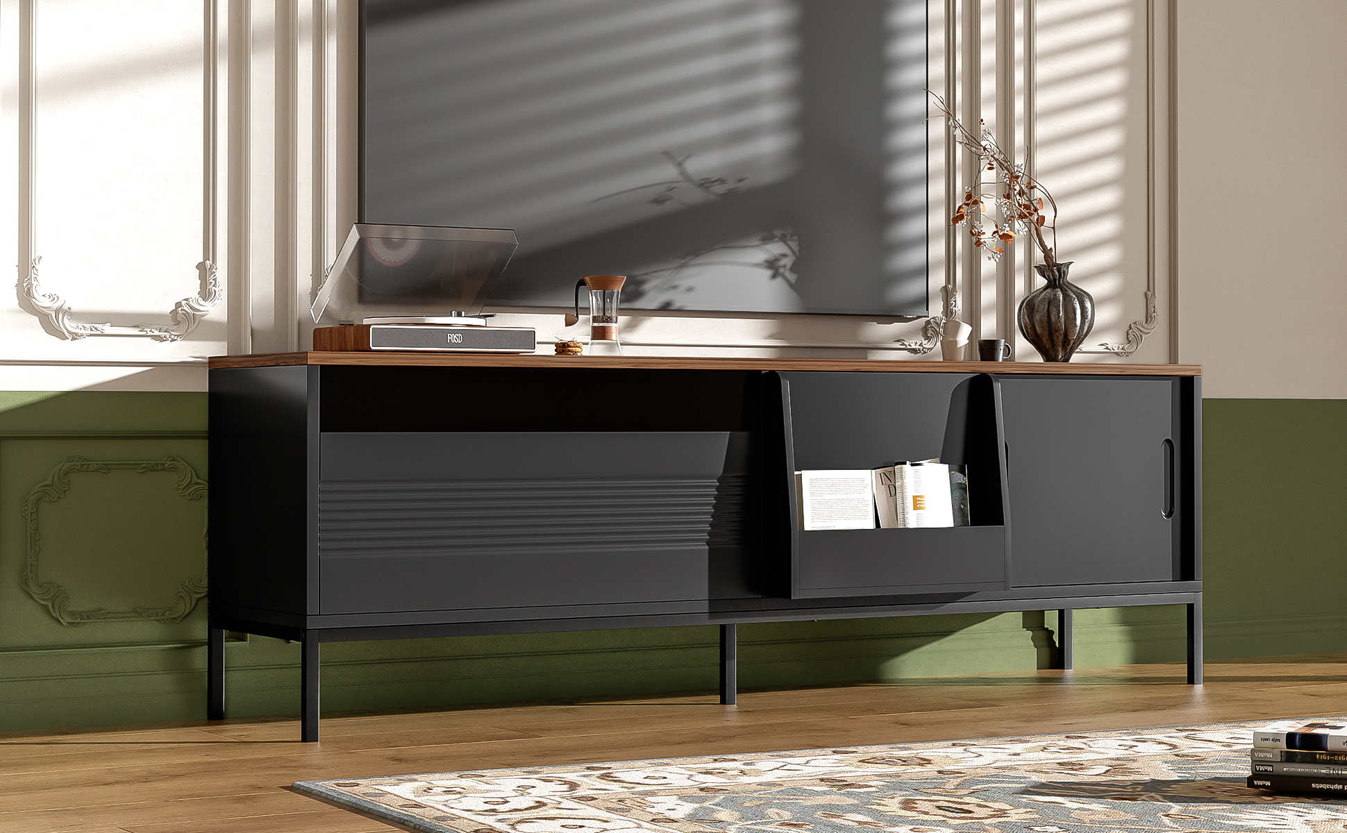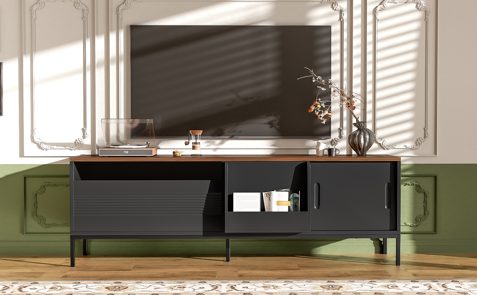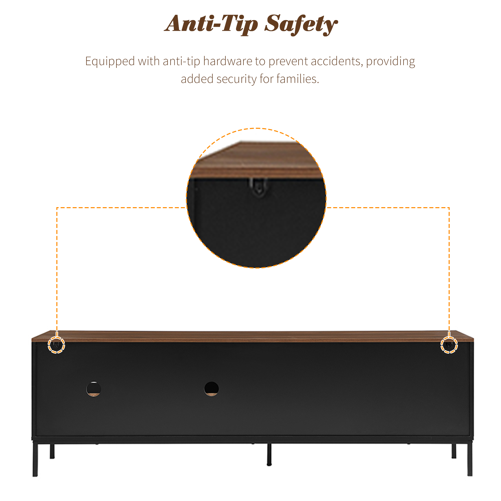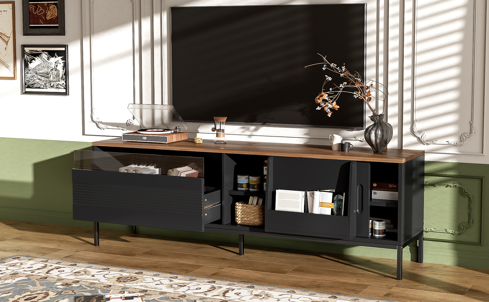 Elevate your living room with this sleek and contemporary TV Cabinet. Designed to combine style, durability, and practicality, the top of this minimalist TV stand features a beautiful walnut wood sticker, complemented by a black body and metal frame for a sophisticated, modern look. Ideal for organizing your entertainment area, this cabinet provides ample storage while maintaining a clean and tidy aesthetic.