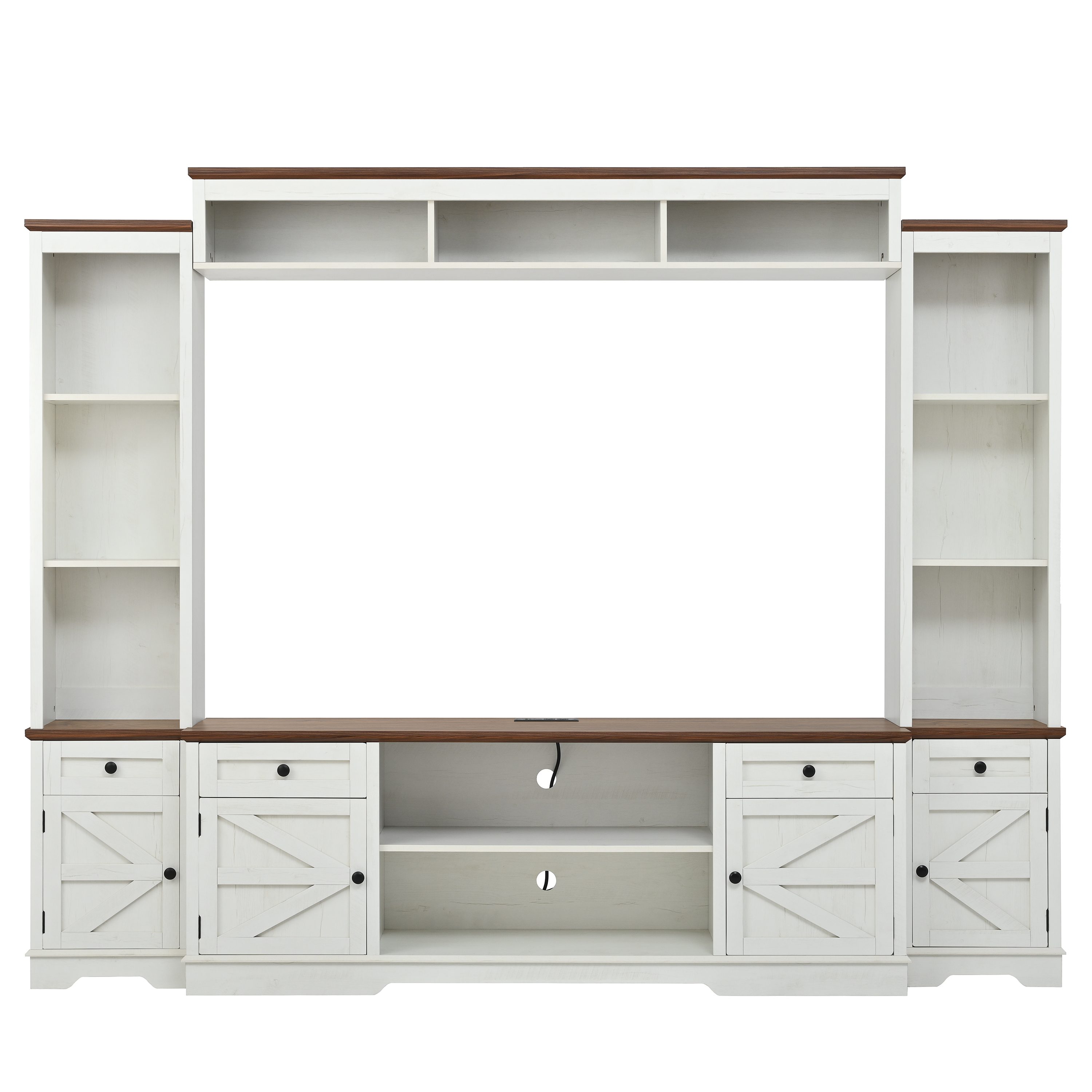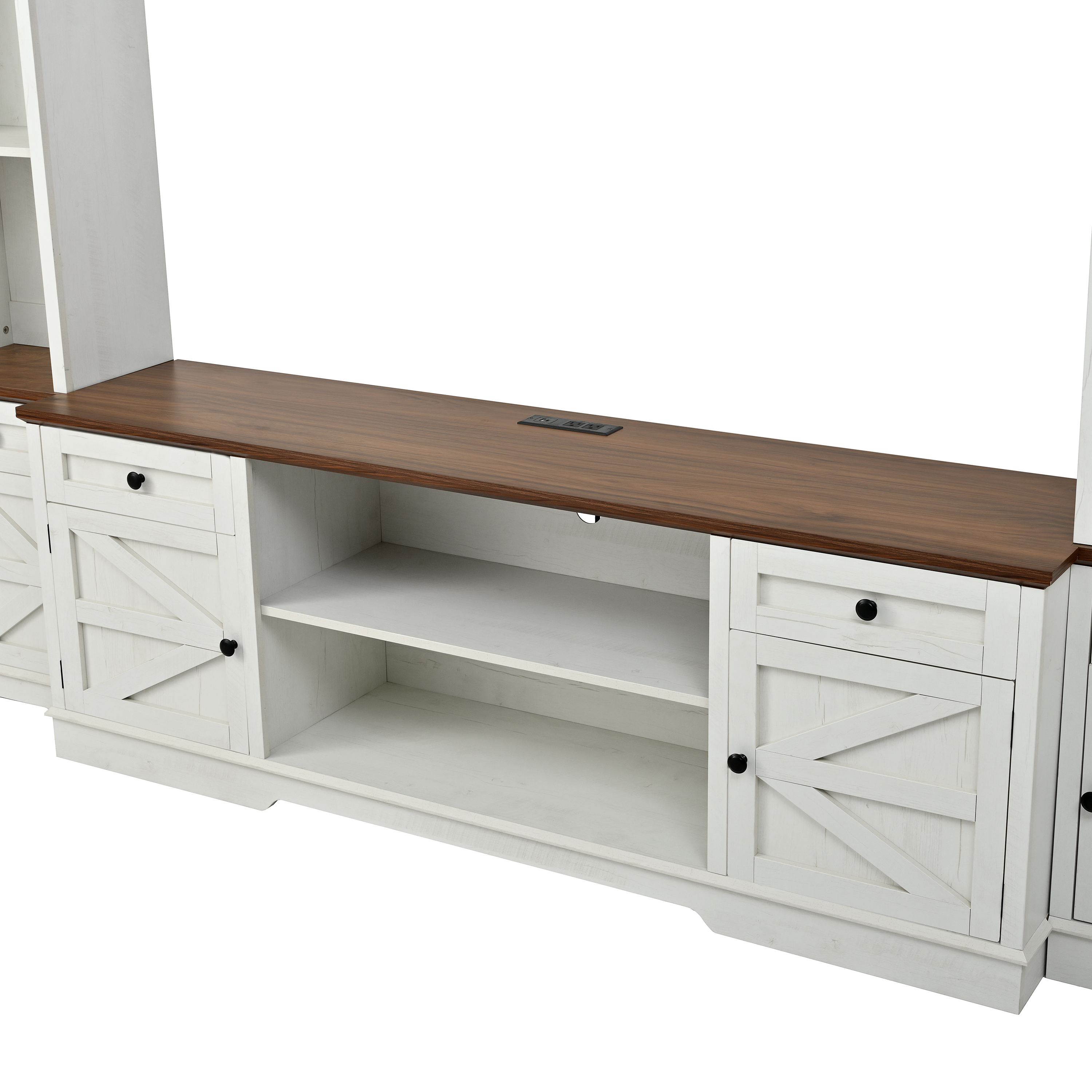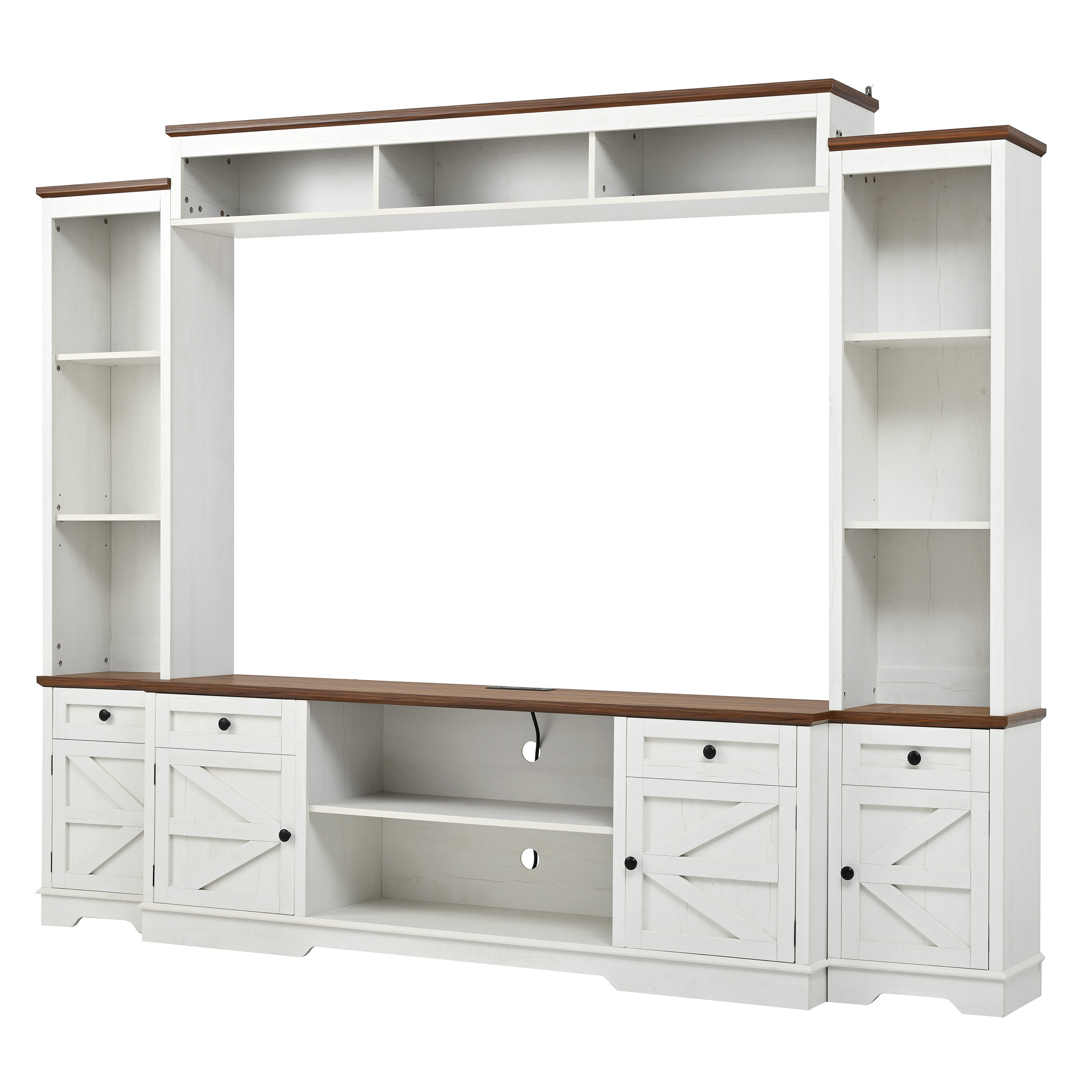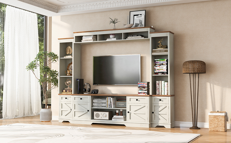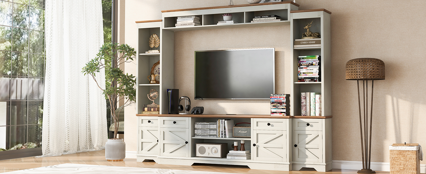 This 98" farmhouse TV stand combines rustic charm with modern functionality, featuring classic barn doors and a wood grain finish. It includes 4 drawers, 9 open compartments, and adjustable shelves for versatile storage. With built-in outlets and USB/Type-C ports, it keeps your devices connected, while anti-tip devices add extra stability—perfect for any living room or entertainment space.