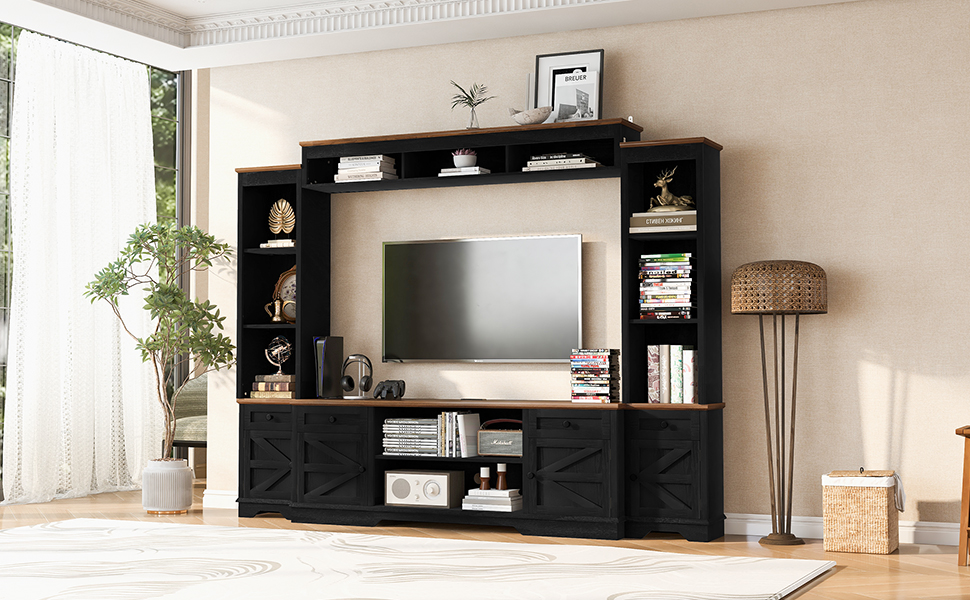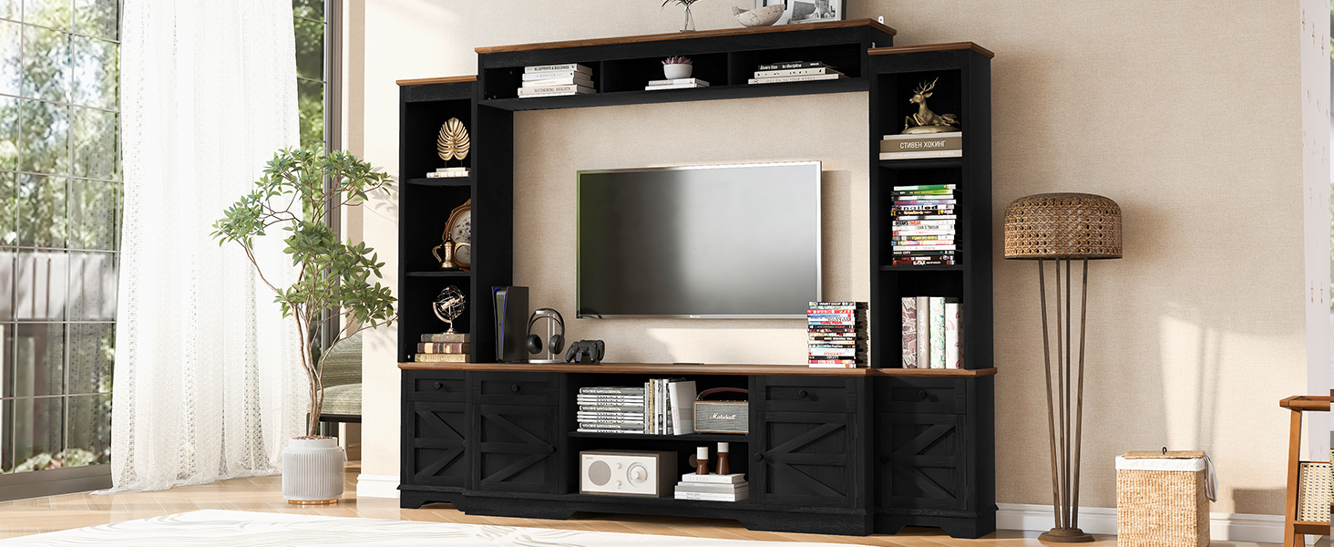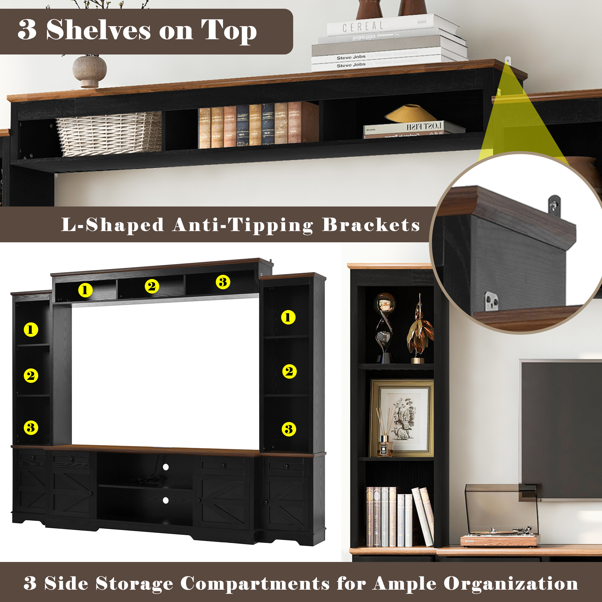 This 98" farmhouse TV stand combines rustic charm with modern functionality, featuring classic barn doors and a wood grain finish. It includes 4 drawers, 9 open compartments, and adjustable shelves for versatile storage. With built-in outlets and USB/Type-C ports, it keeps your devices connected, while anti-tip devices add extra stability—perfect for any living room or entertainment space.