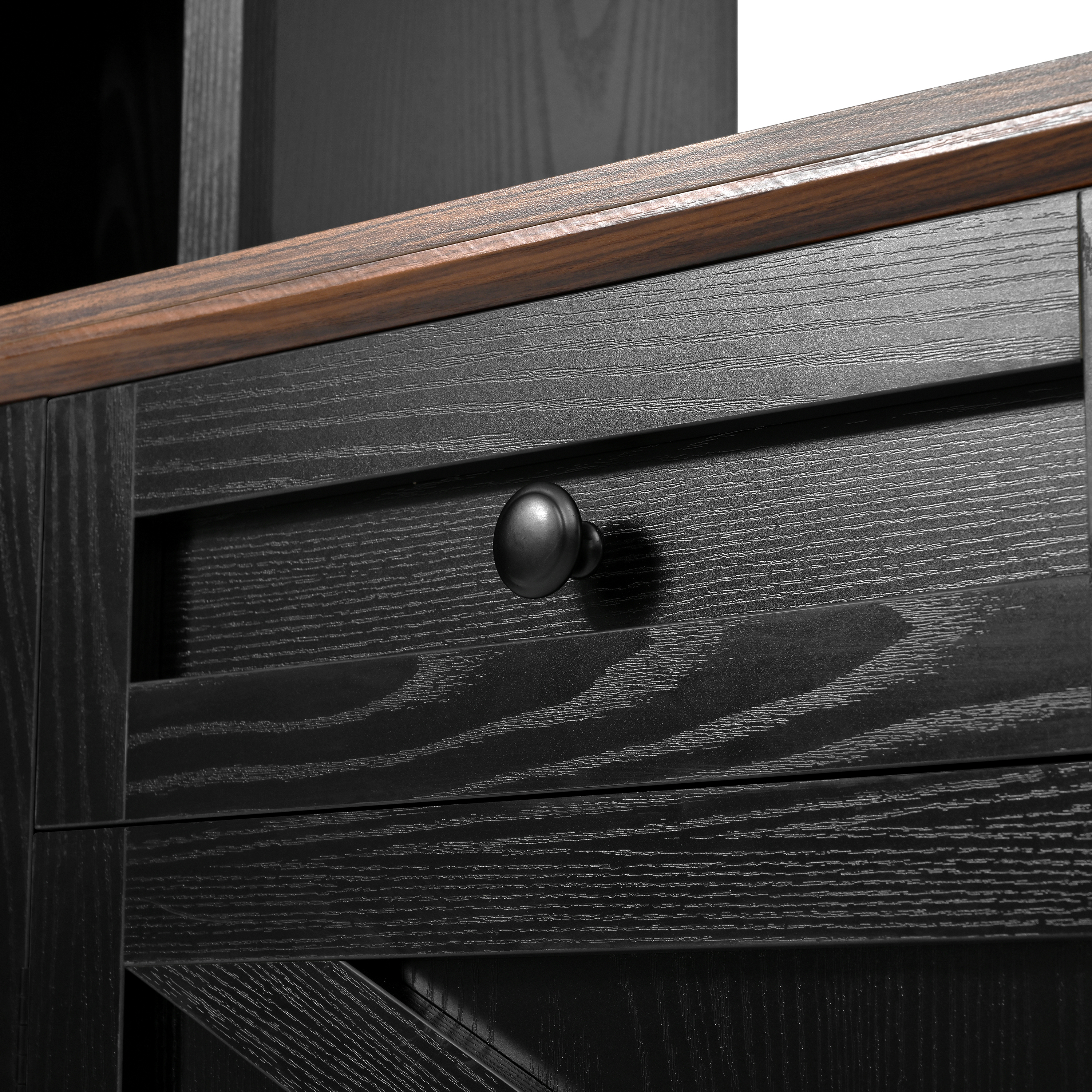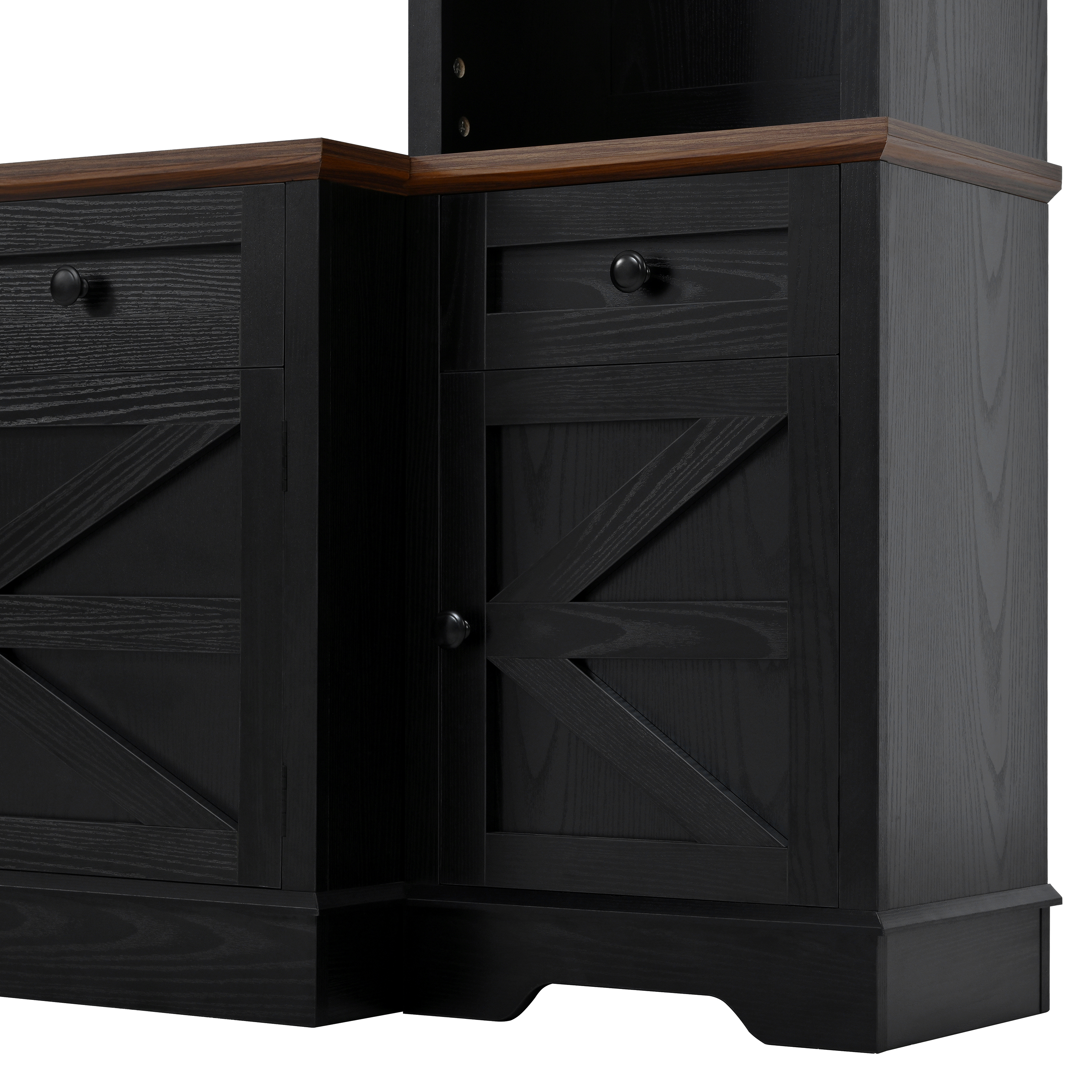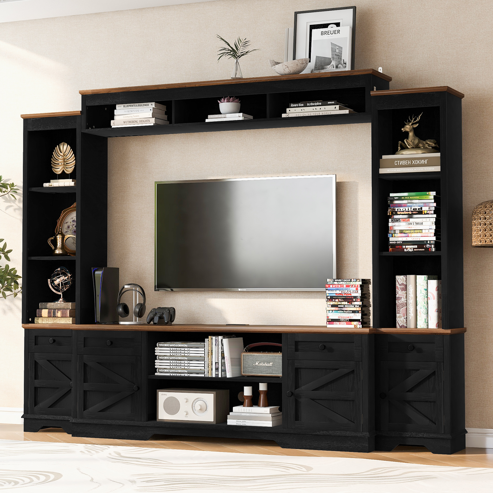 This 98" farmhouse TV stand combines rustic charm with modern functionality, featuring classic barn doors and a wood grain finish. It includes 4 drawers, 9 open compartments, and adjustable shelves for versatile storage. With built-in outlets and USB/Type-C ports, it keeps your devices connected, while anti-tip devices add extra stability—perfect for any living room or entertainment space.