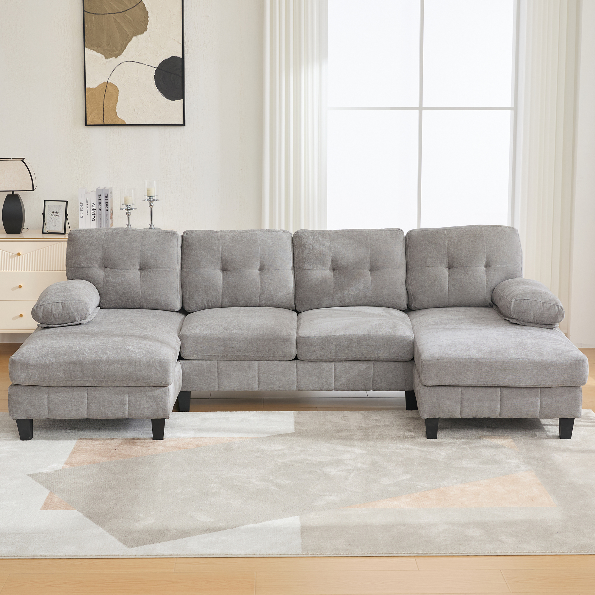 - Spacious U-Shaped Design - This generously sized U-shaped sectional sofa features two chaise lounges, offering ample seating and lounging space for family and guests. The dual-chaise layout is ideal for stretching out on either side, making it perfect for movie nights, social gatherings, or cozy relaxation.
