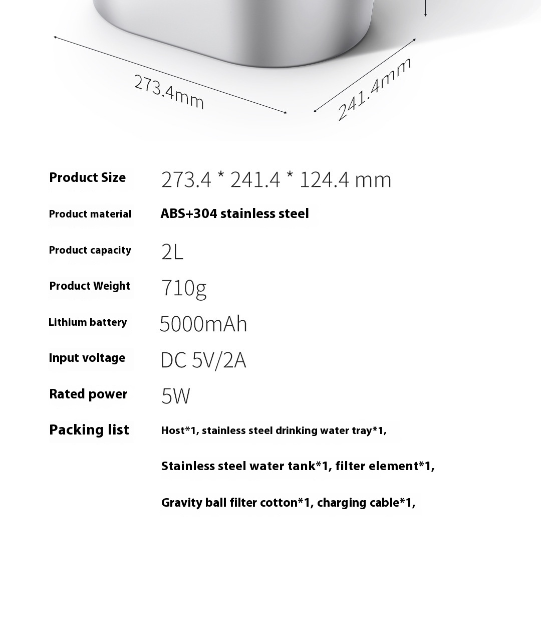 Packing List: Host * 1, stainless steel drinking tray * 1, stainless steel water tank "1, filter element * 1, gravitational ball filter cotton * 1, charging cable * 1