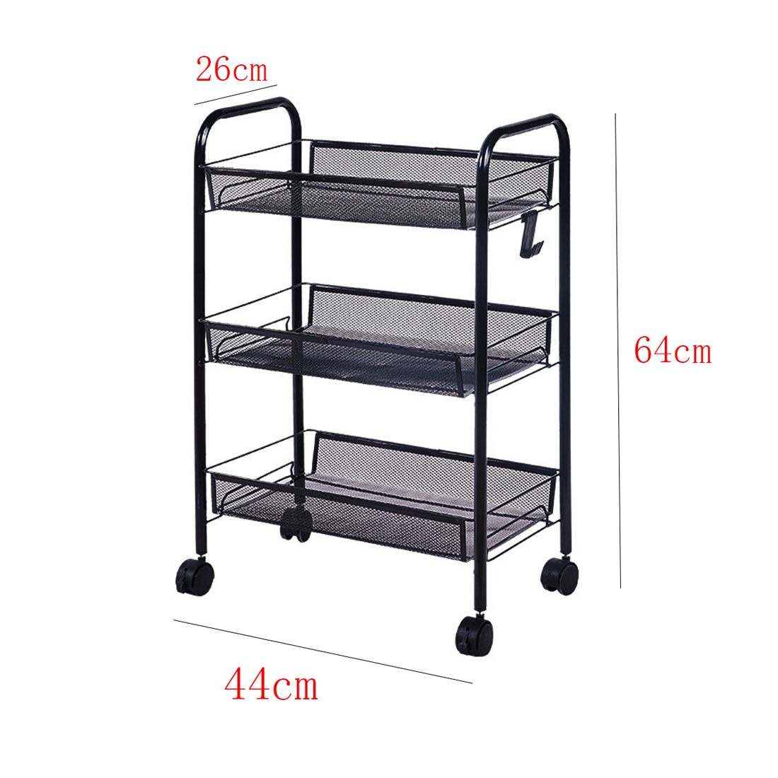 Large Storage Space: This mesh wire cart with 3 deep baskets and 1 hanging side hooks,2.3inch curled edge protection design to prevent objects from falling and provides space for a large number of items to optimize space utilization.Mesh design allows air circulation.