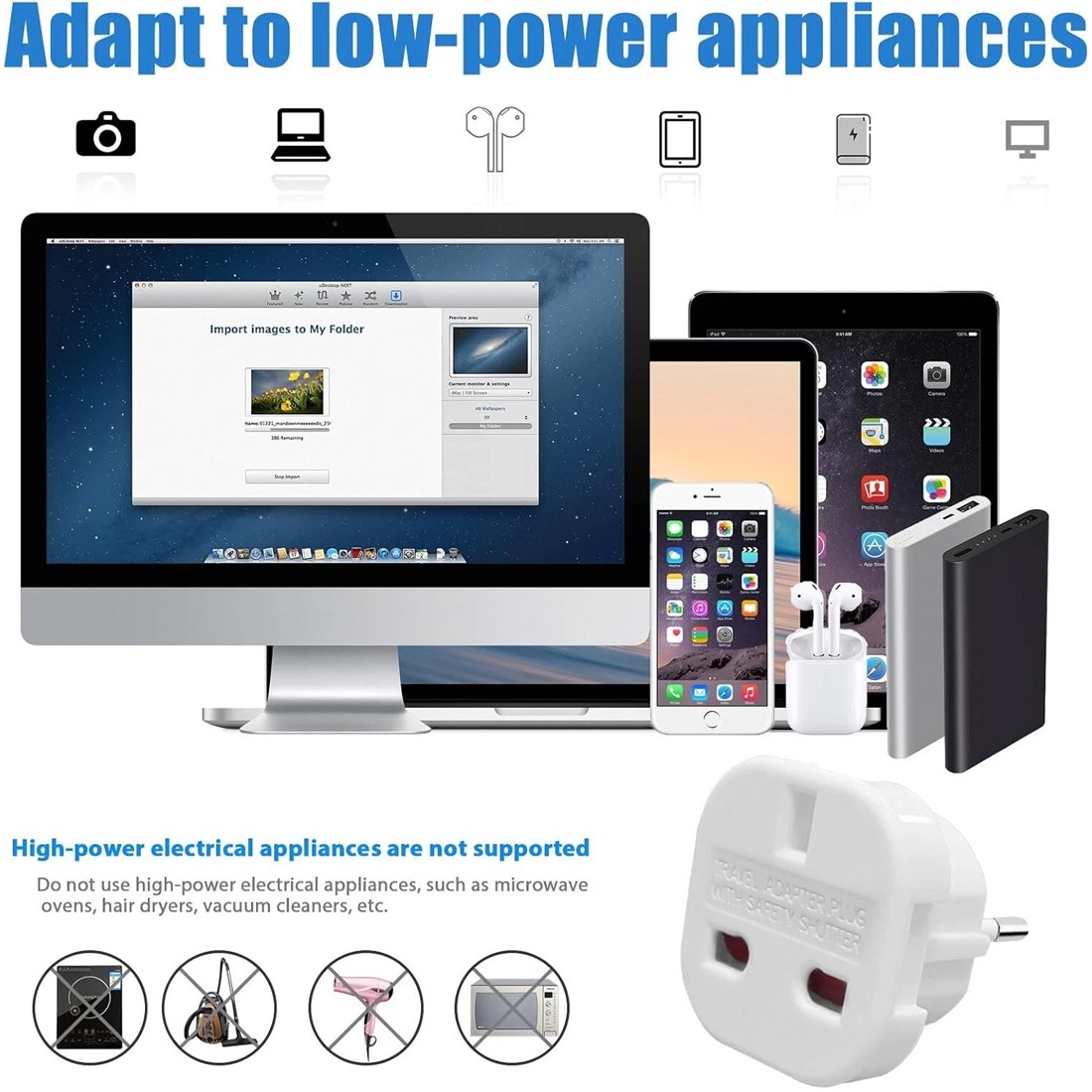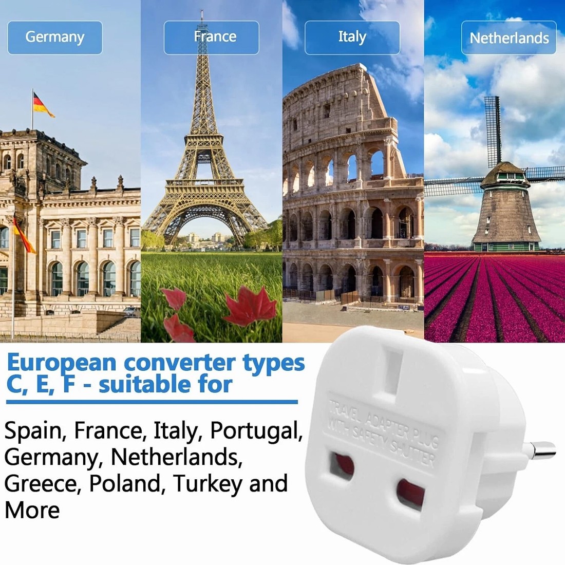1.This Adaptors is to be used in EU,it's the best holidays companion for the whole family.