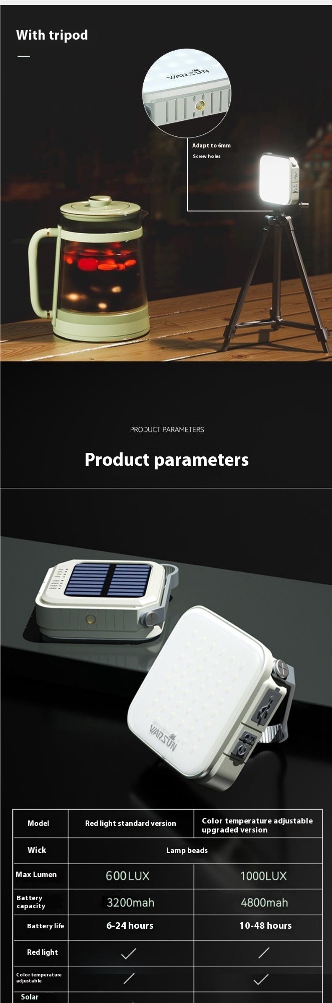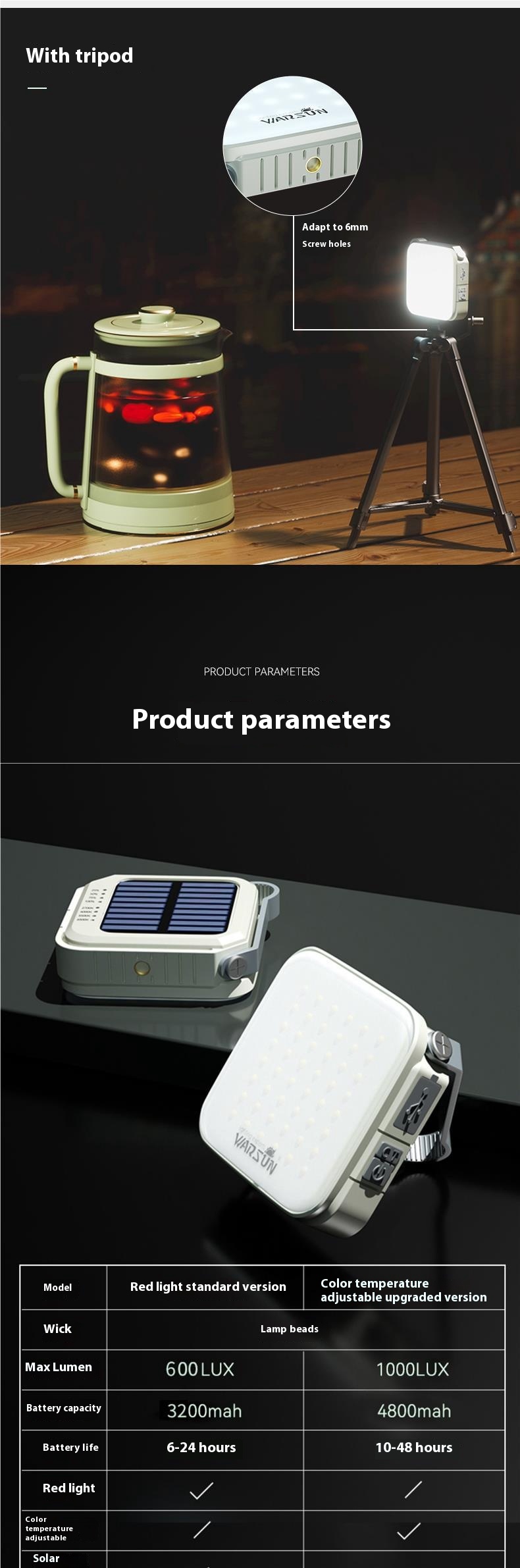 Color: [Standard Edition]/No Solar Energy/Red Light Function/3200mah/600 lumens/Charging, Standard Edition+Handbag+Mountaineering Buckle, [Upgraded Edition]/With Solar Energy/Four Color Temperature/4800mah/1000 lumens/Charging, Upgraded Edition+Handbag+Mountaineering Buckle, Standard Edition+Handbag+Mountaineering Buckle+Triangle Support, Standard Edition+Handbag+Mountaineering Buckle+Double Hook Support (including ground and table clips), Upgraded Edition+Handbag+Mountaineering Buckle+Double Hook Support (including ground and table clips)