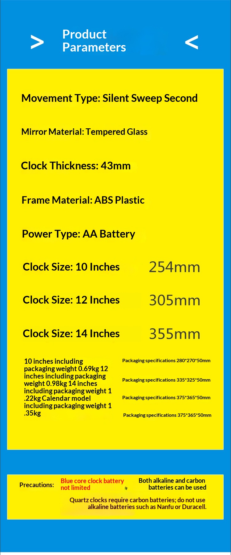 Dimensions: [Ultra-Quiet – Blue-Core Clock] 6510-B black frame; [Basic Model – Quartz Clock] 6510-B black frame; [Ultra-Quiet – Blue-Core Clock] 6518-G gold frame; [Basic Model – Quartz Clock] 6518-G gold frame
