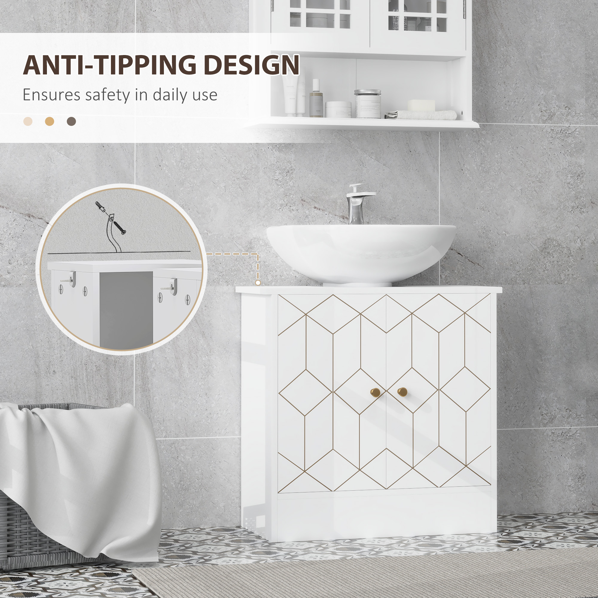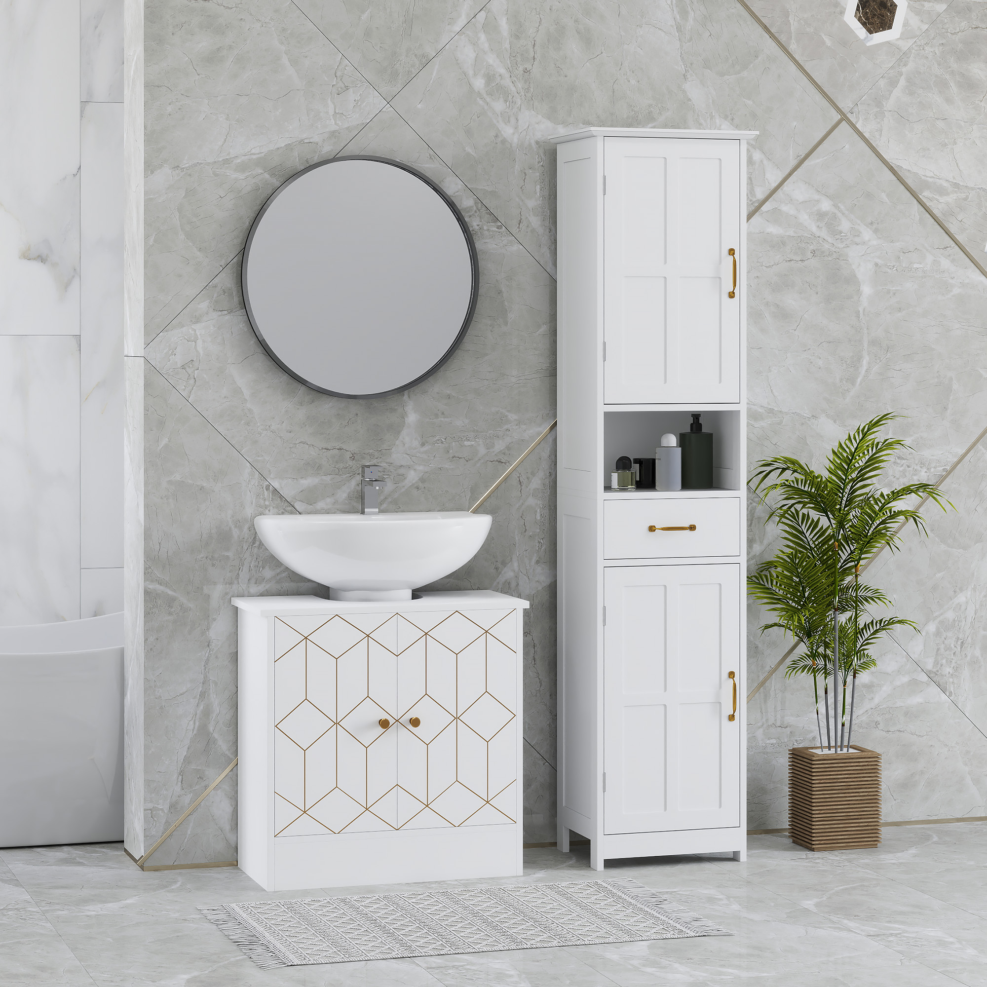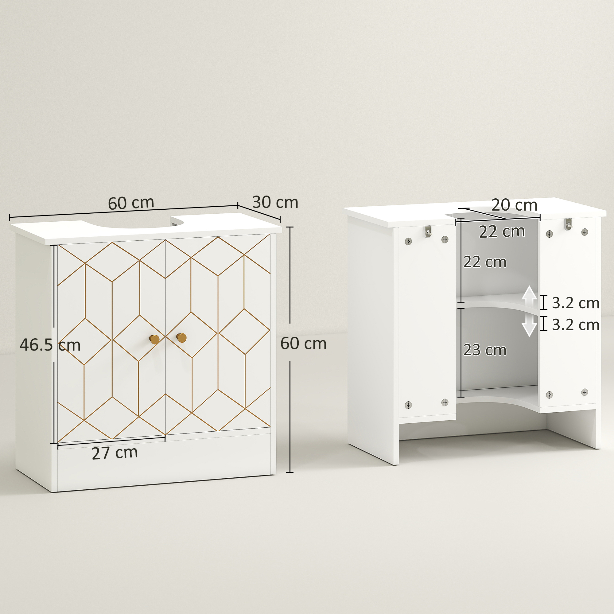Maximise your bathroom's potential with the under basin cabinet. Its clever design features pre-cut U-shaped slots to fit around most basins, instantly tidying up your space. Enjoy easy access with two open compartments and a three-tier adjustable shelf, all styled in a chic white with gold tone accents for a splash of elegance. A smart solution for any stylish bathroom!