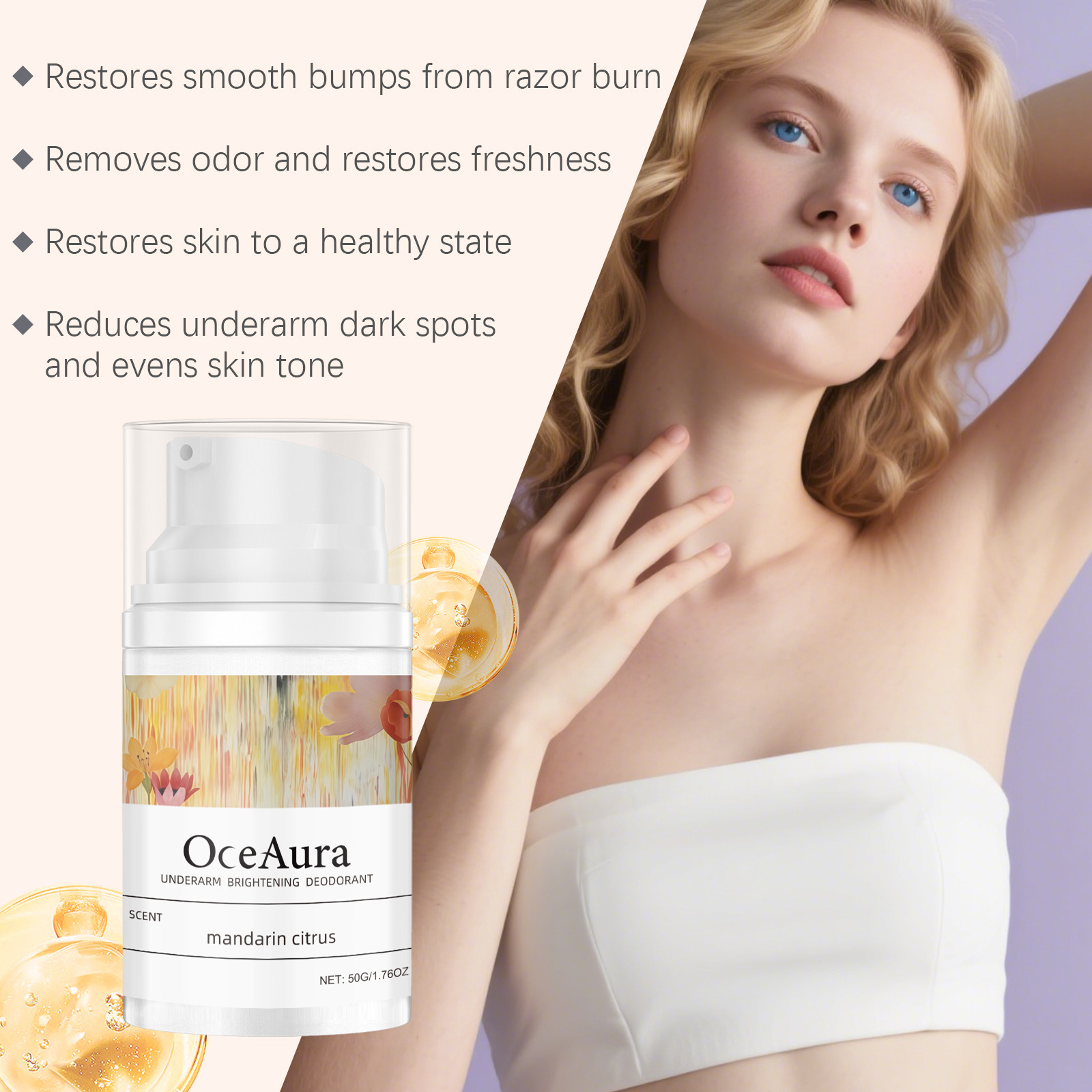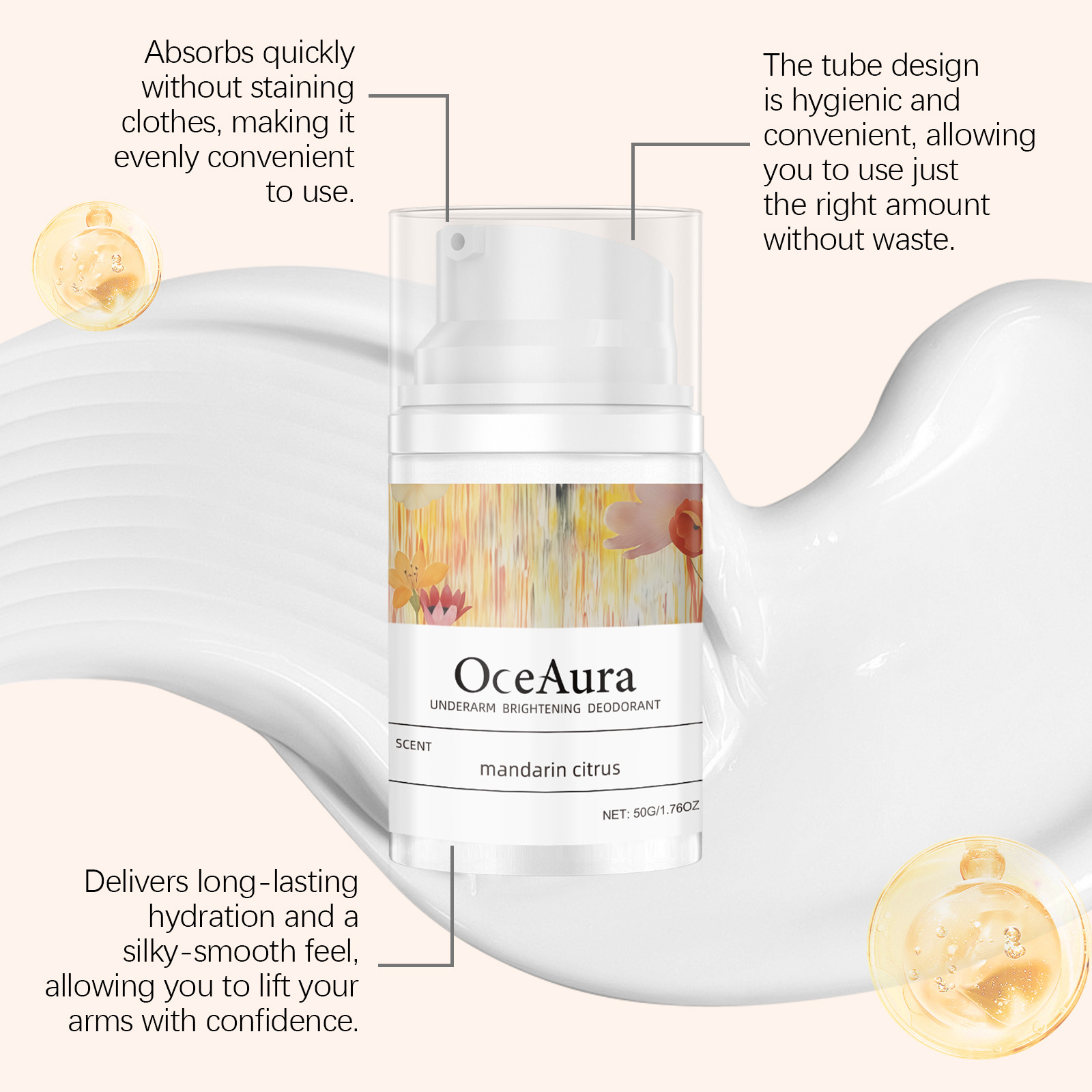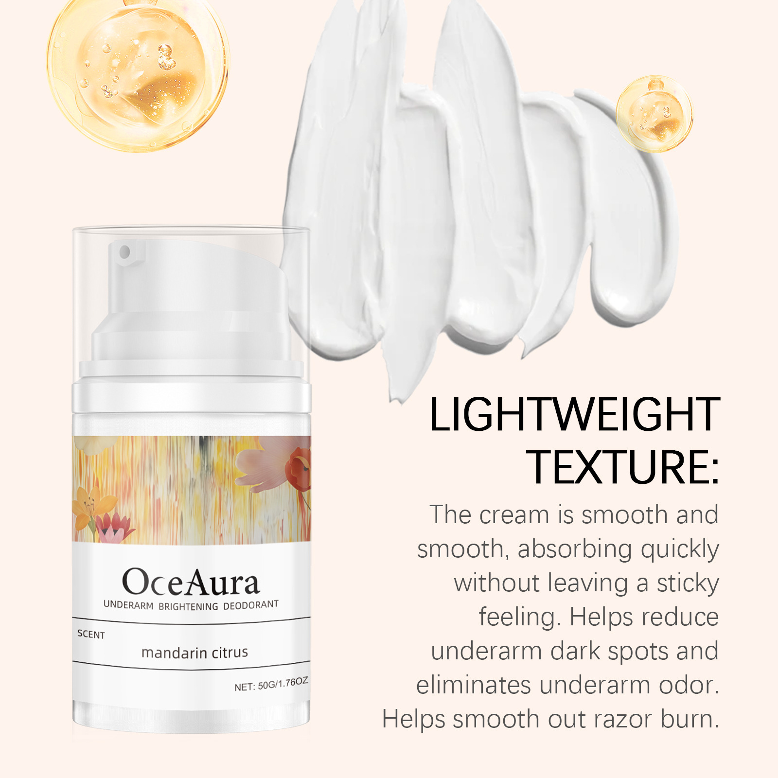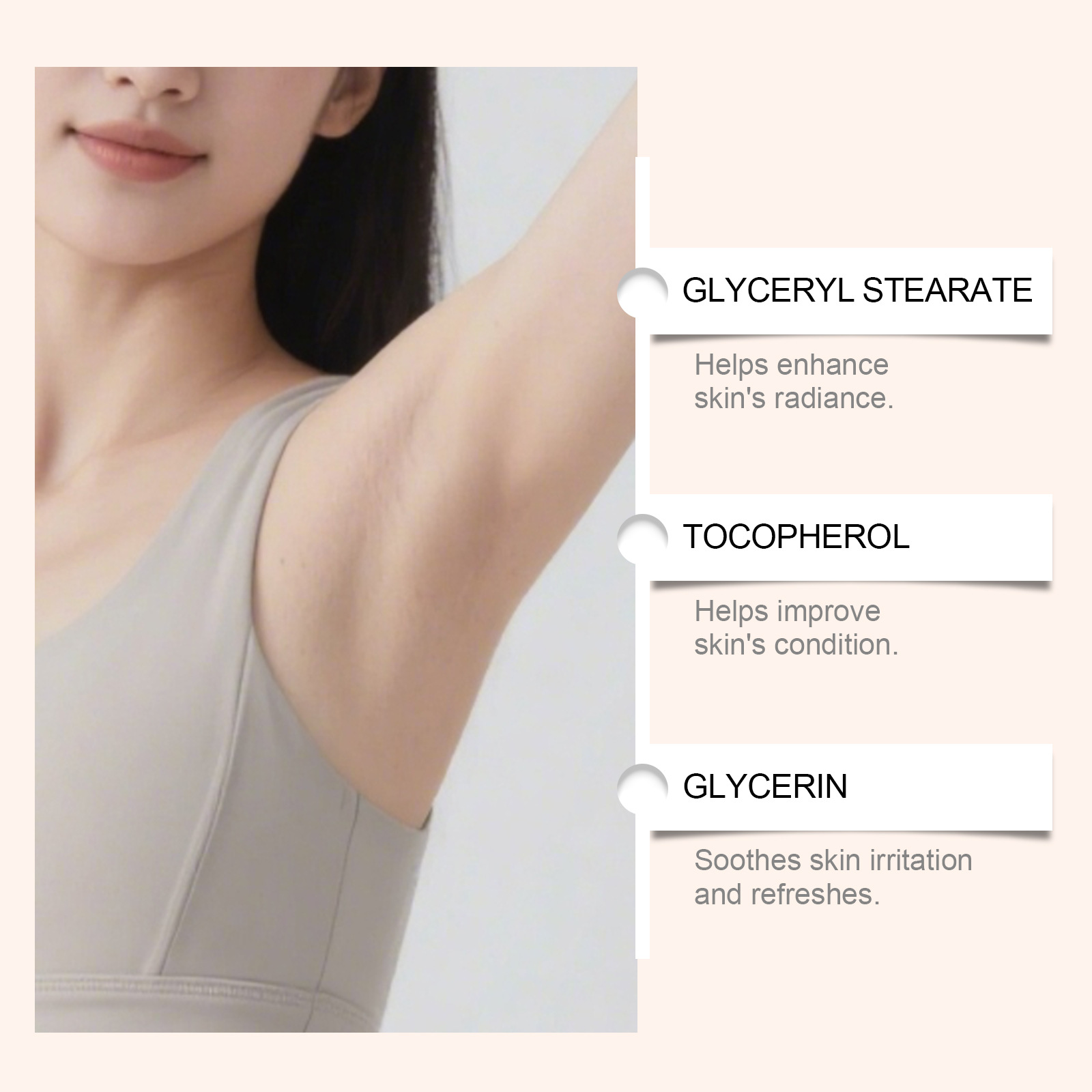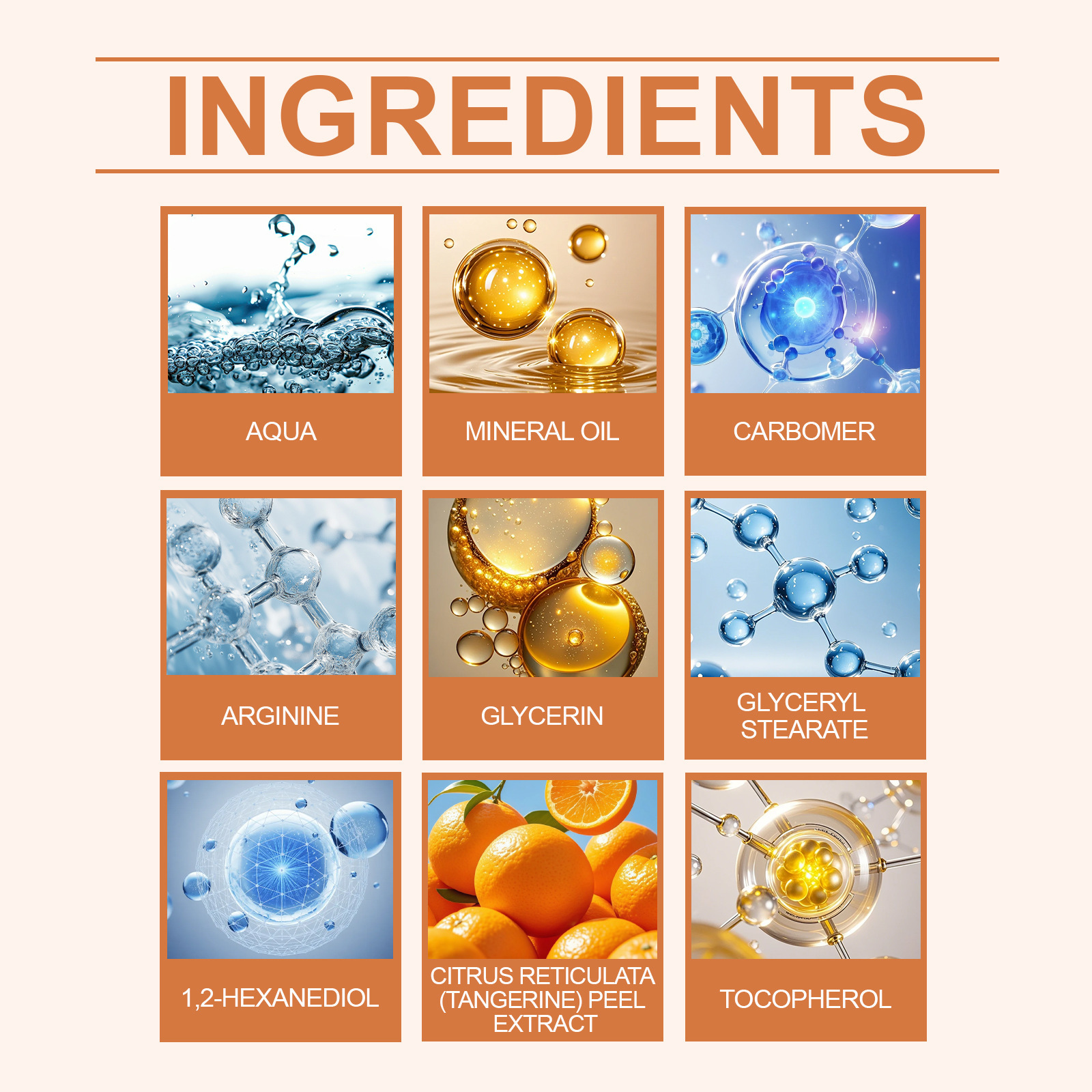 Ingredients: water, mineral oil, glycerin, glycerol stearate, 1,2-hexanediol, carbomer, arginine, tocopherol (vitamin E), citrus peel extract.