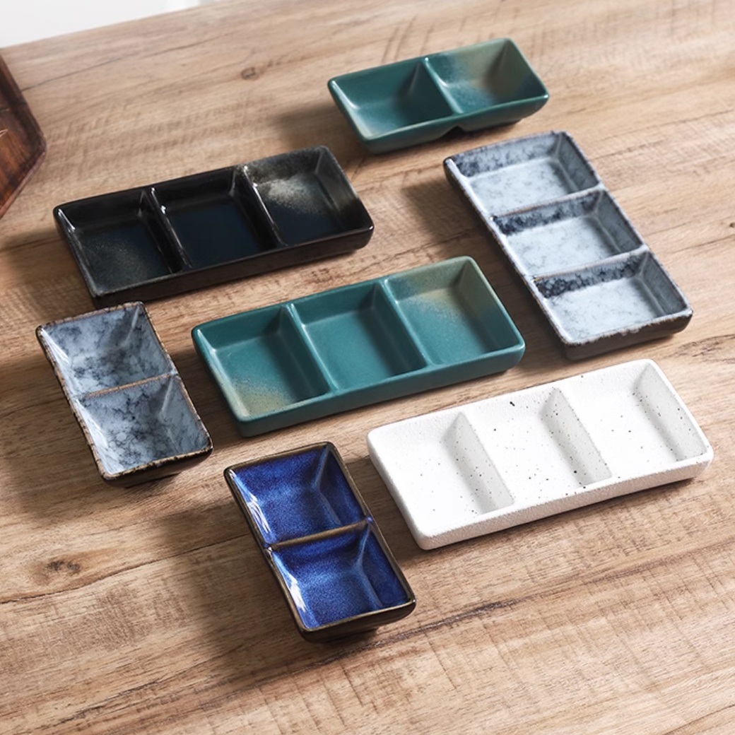 Color classification: velar three-lattice plate, rust point white three-lattice plate, peacock green three-lattice plate, marbling three-lattice plate, marbling two-grid dish, sky blue two-grid dish, peacock green two-grid dish