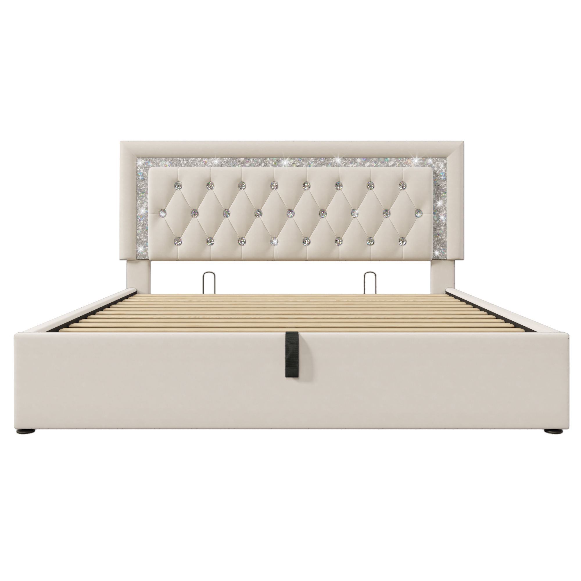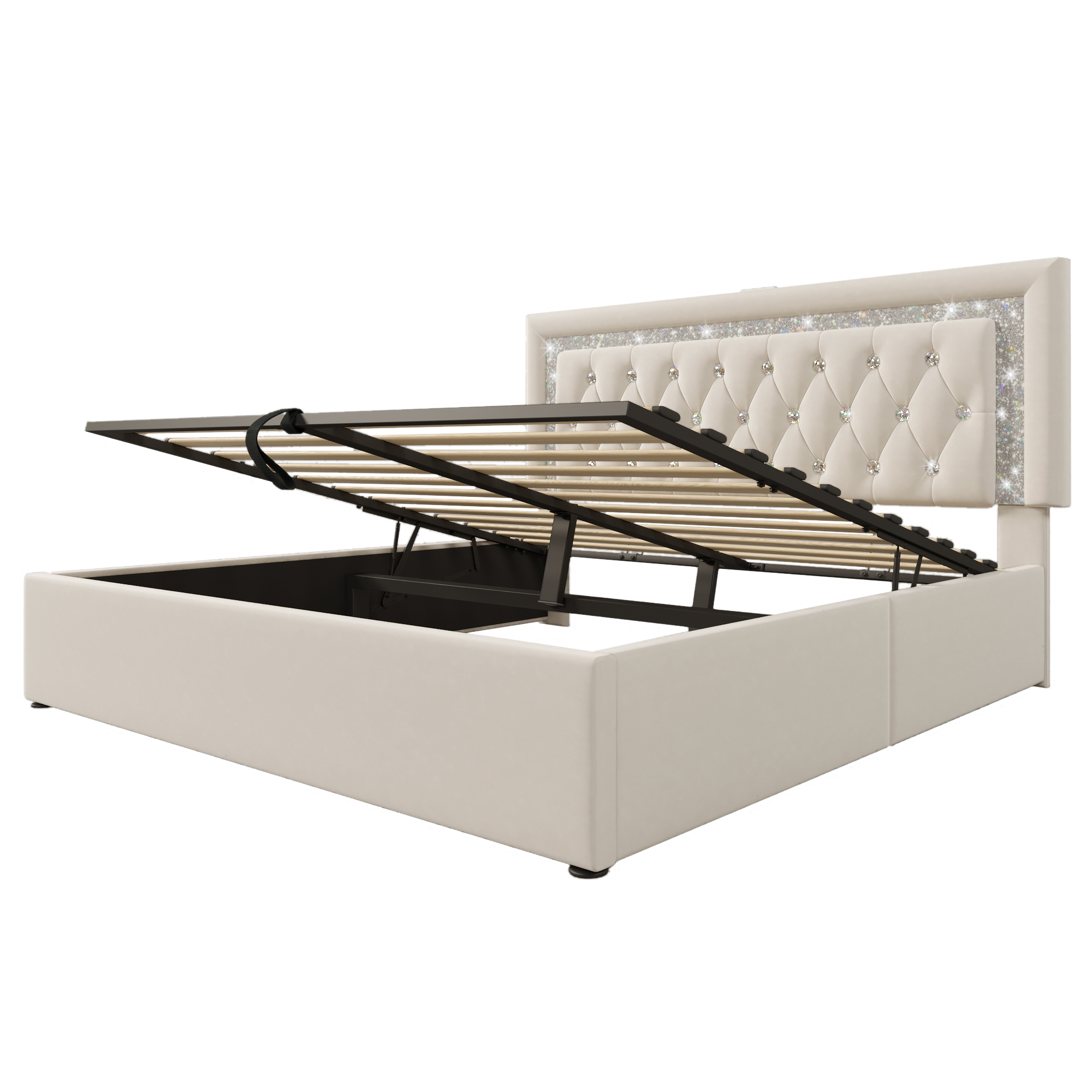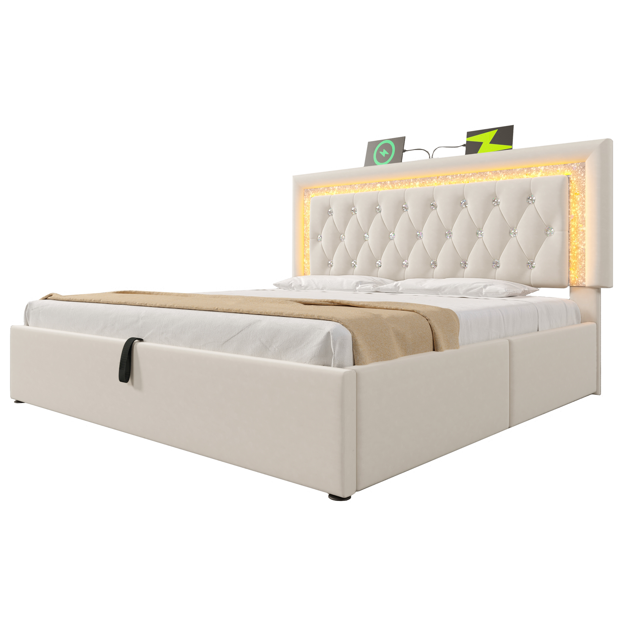 Product Name:Upholstered Bed 135 x 190 cm with LED Lighting, USB Type-C Charging, 4ft6 Hydraulic Storage Bed with Adjustable Diamond Tufted Headboard, Velvet, Beige (No Mattress)