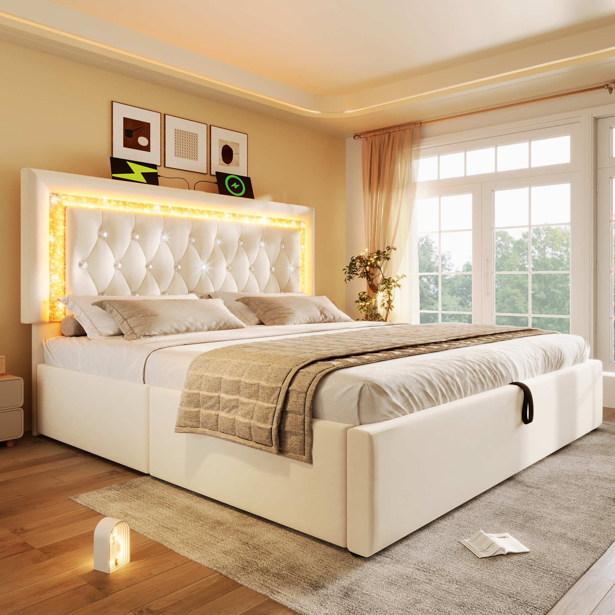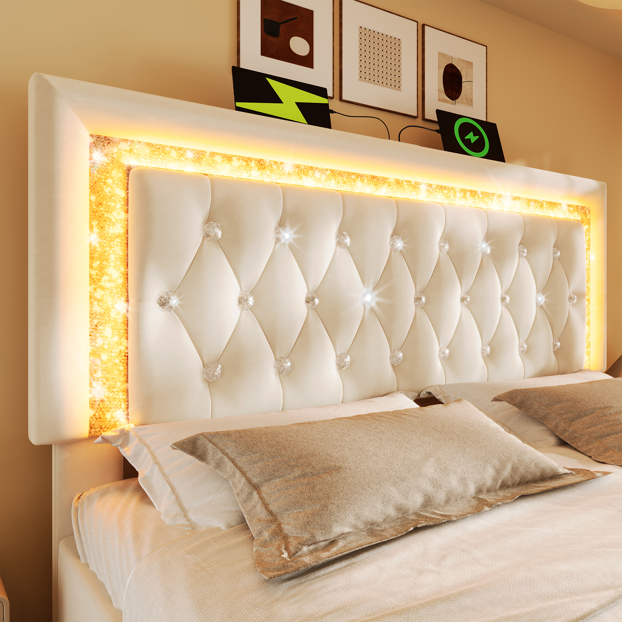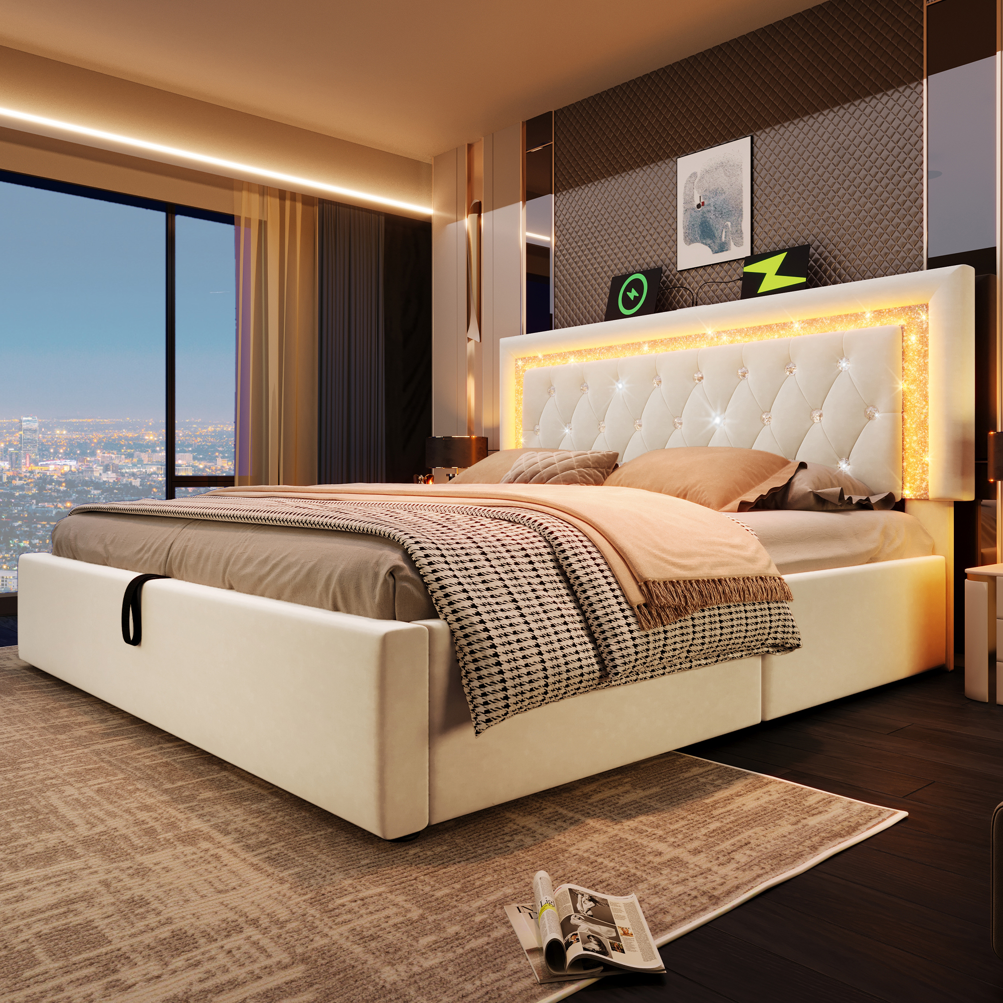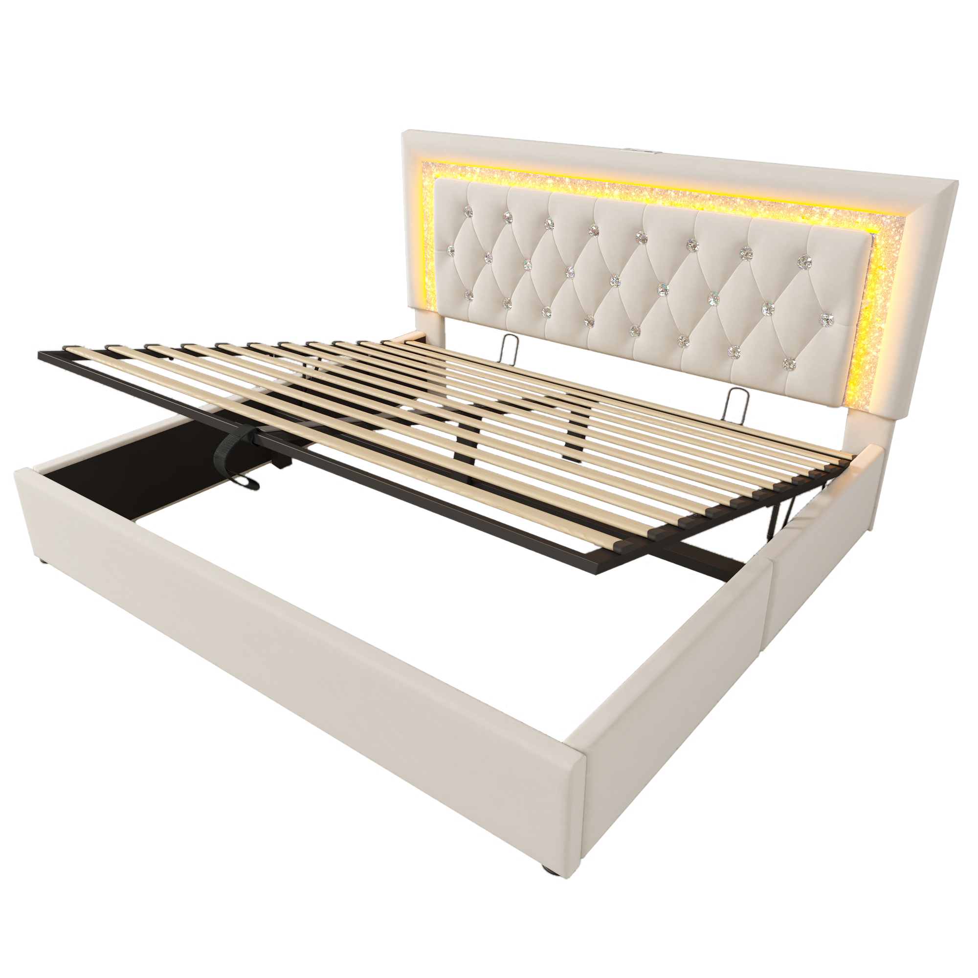 Product Name:Upholstered Bed 135 x 190 cm with LED Lighting, USB Type-C Charging, 4ft6 Hydraulic Storage Bed with Adjustable Diamond Tufted Headboard, Velvet, Beige (No Mattress)