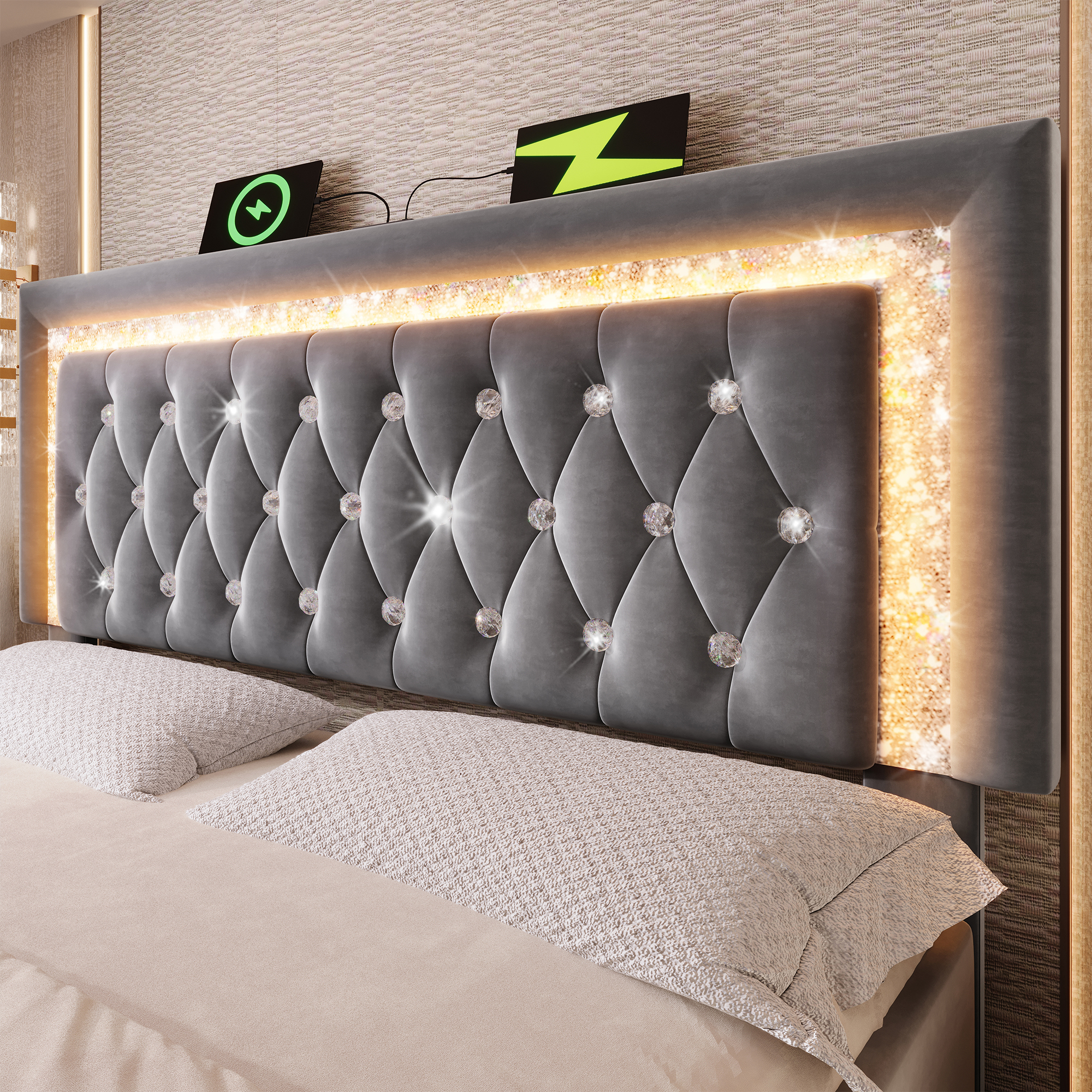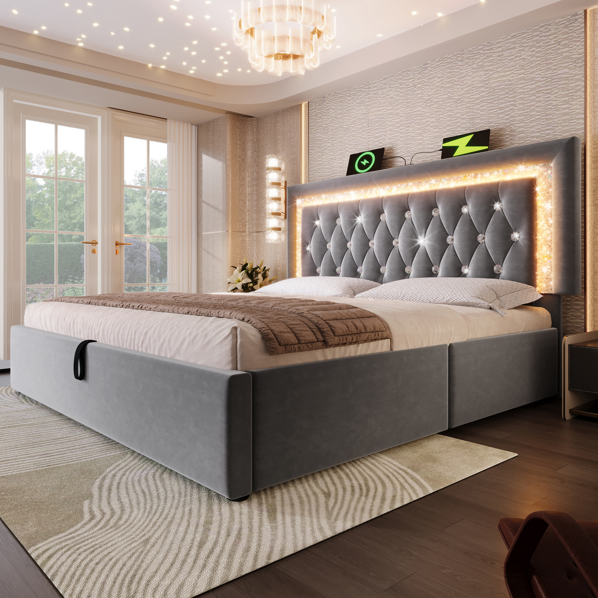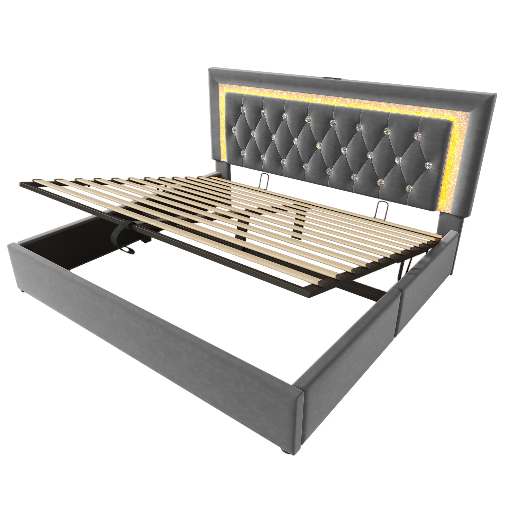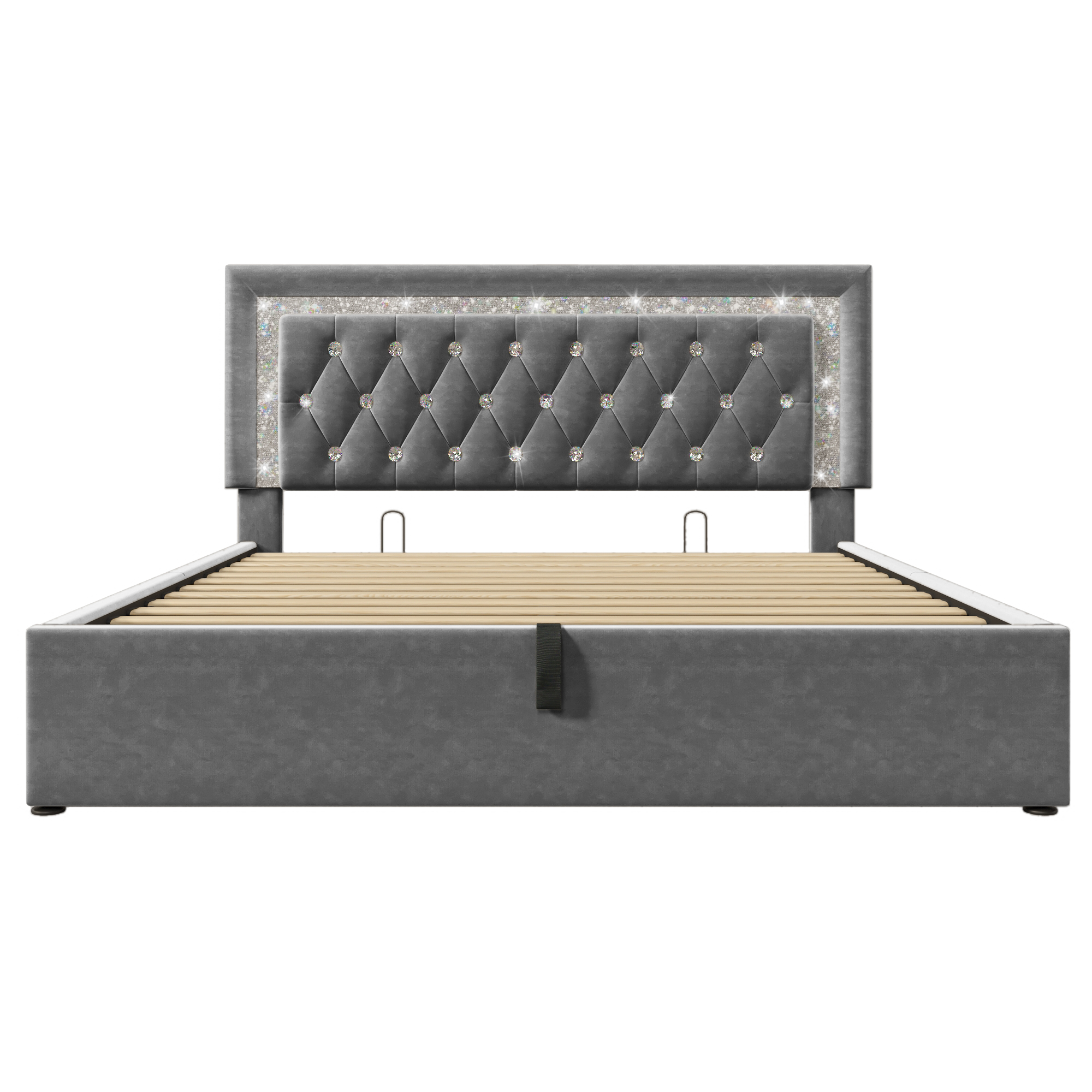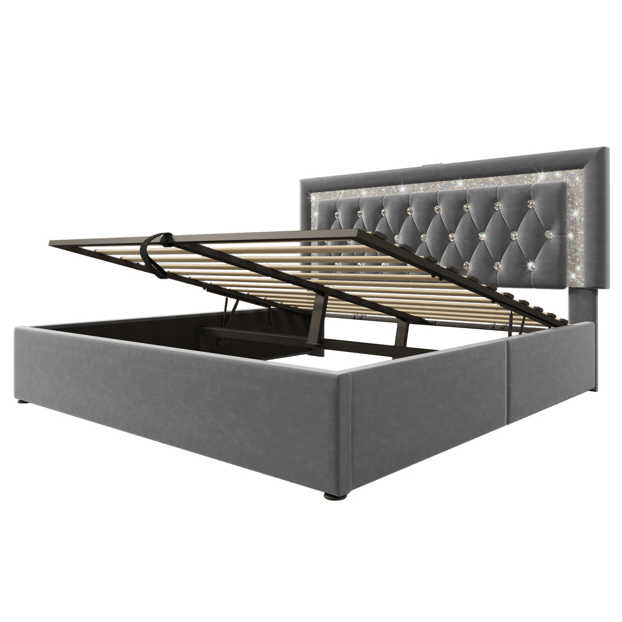 Product Name:Upholstered Bed 135 x 190 cm with LED Lighting, USB Type-C Charging, 4ft6 Hydraulic Storage Bed with Adjustable Diamond Tufted Headboard, Velvet, Grey (No Mattress)
