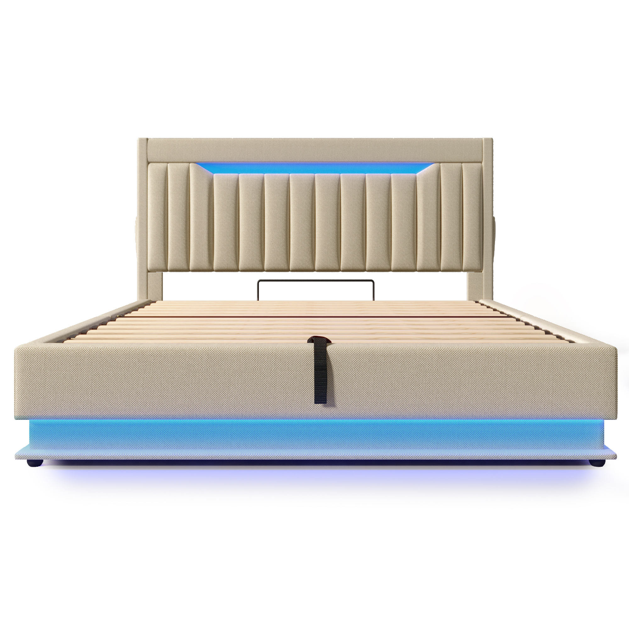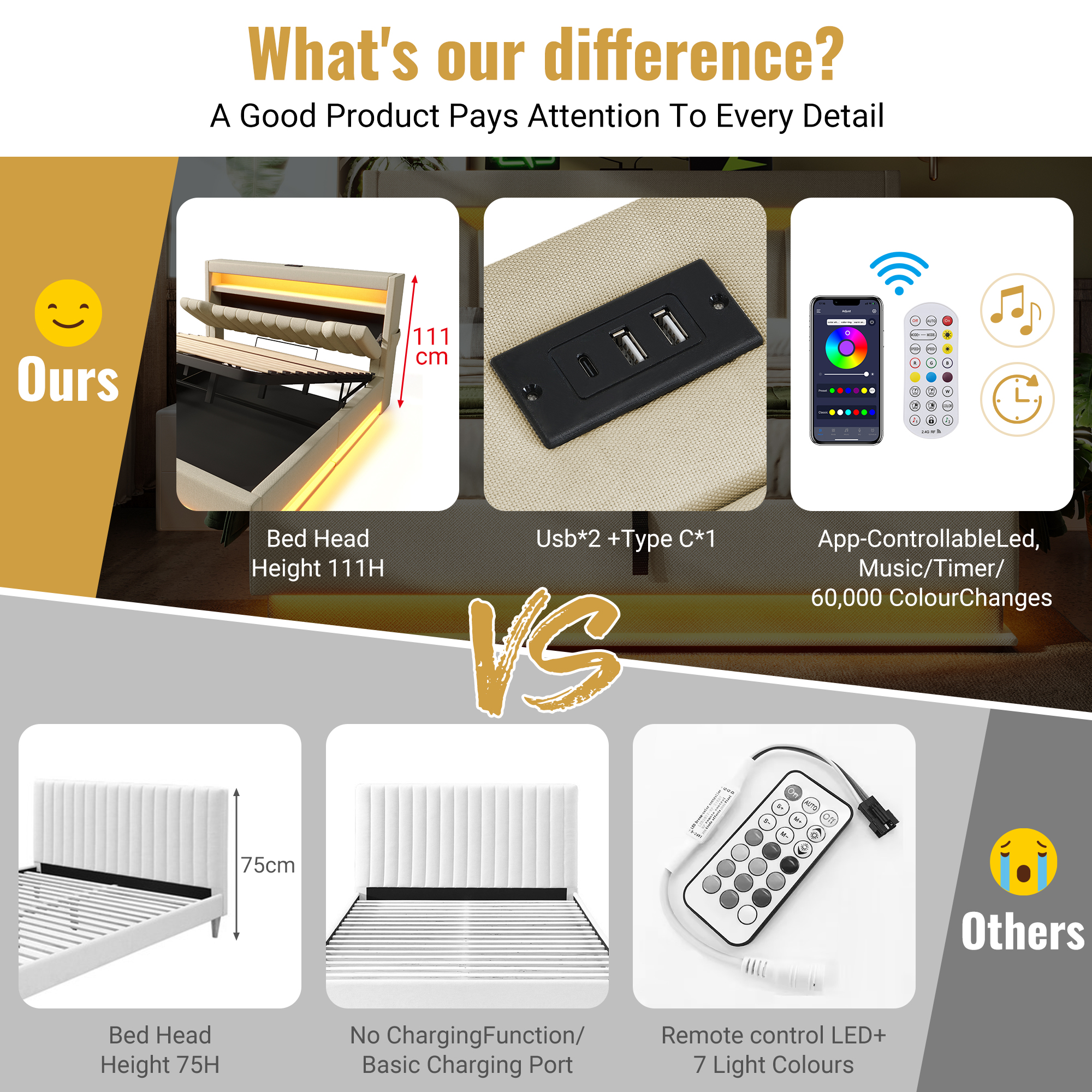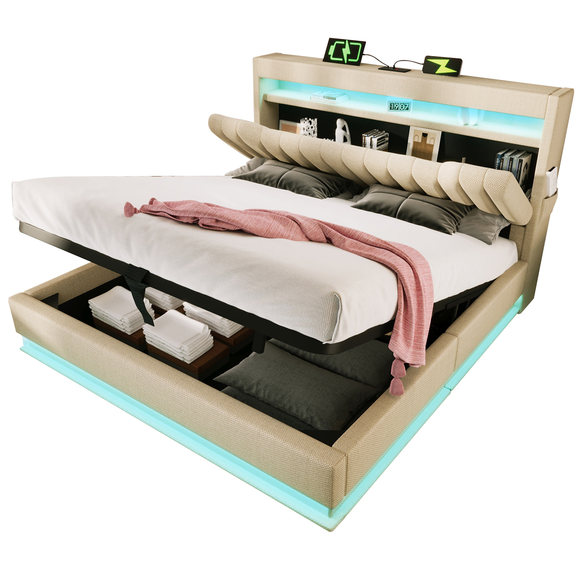 Product Name:Upholstered Bed 135 x 190 cm with LED Lighting, USB Type-C Charging, Storage Headboard for Cellphones and Tablets, 4ft6 Hydraulic Storage Bed with Metal Slatted Frame, Linen, Beige (No Mattress)