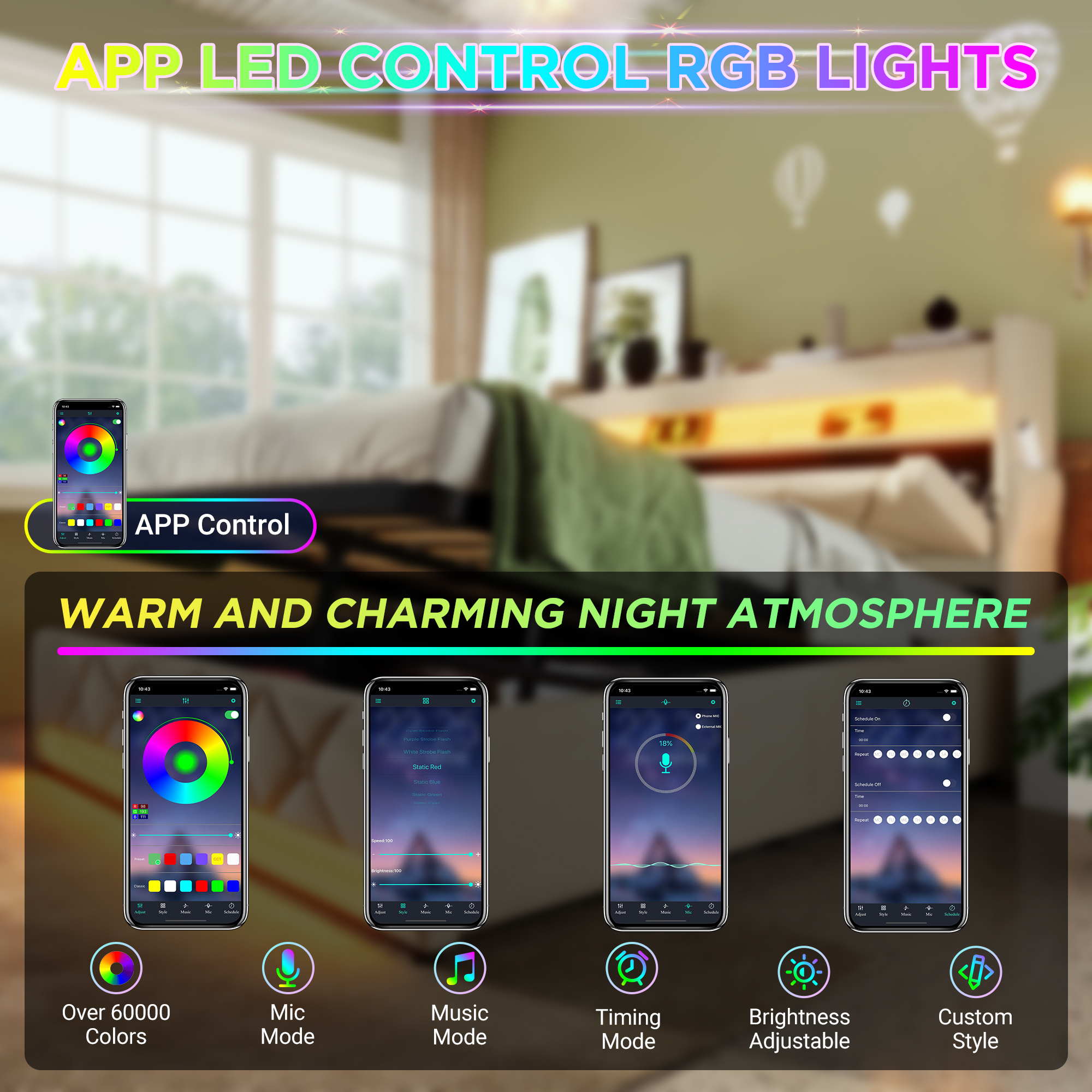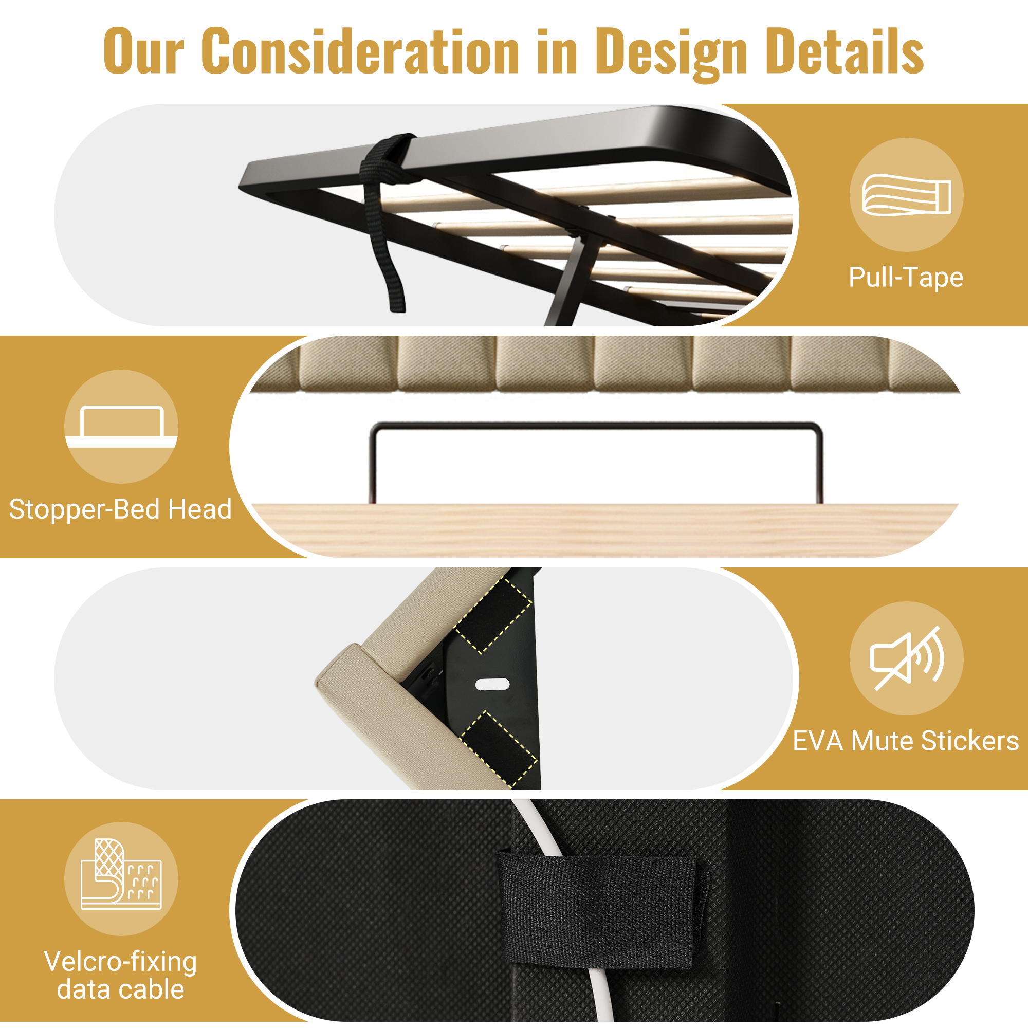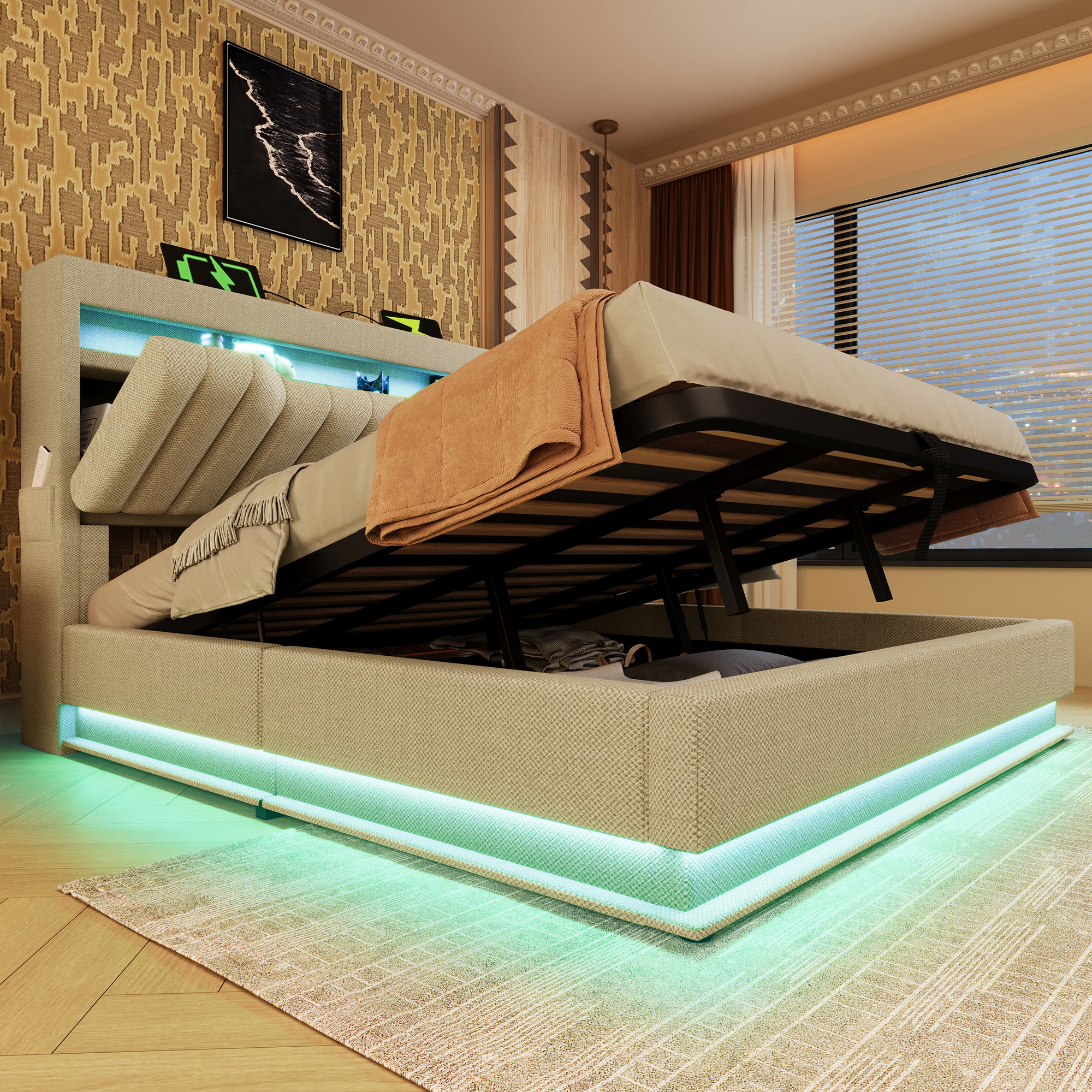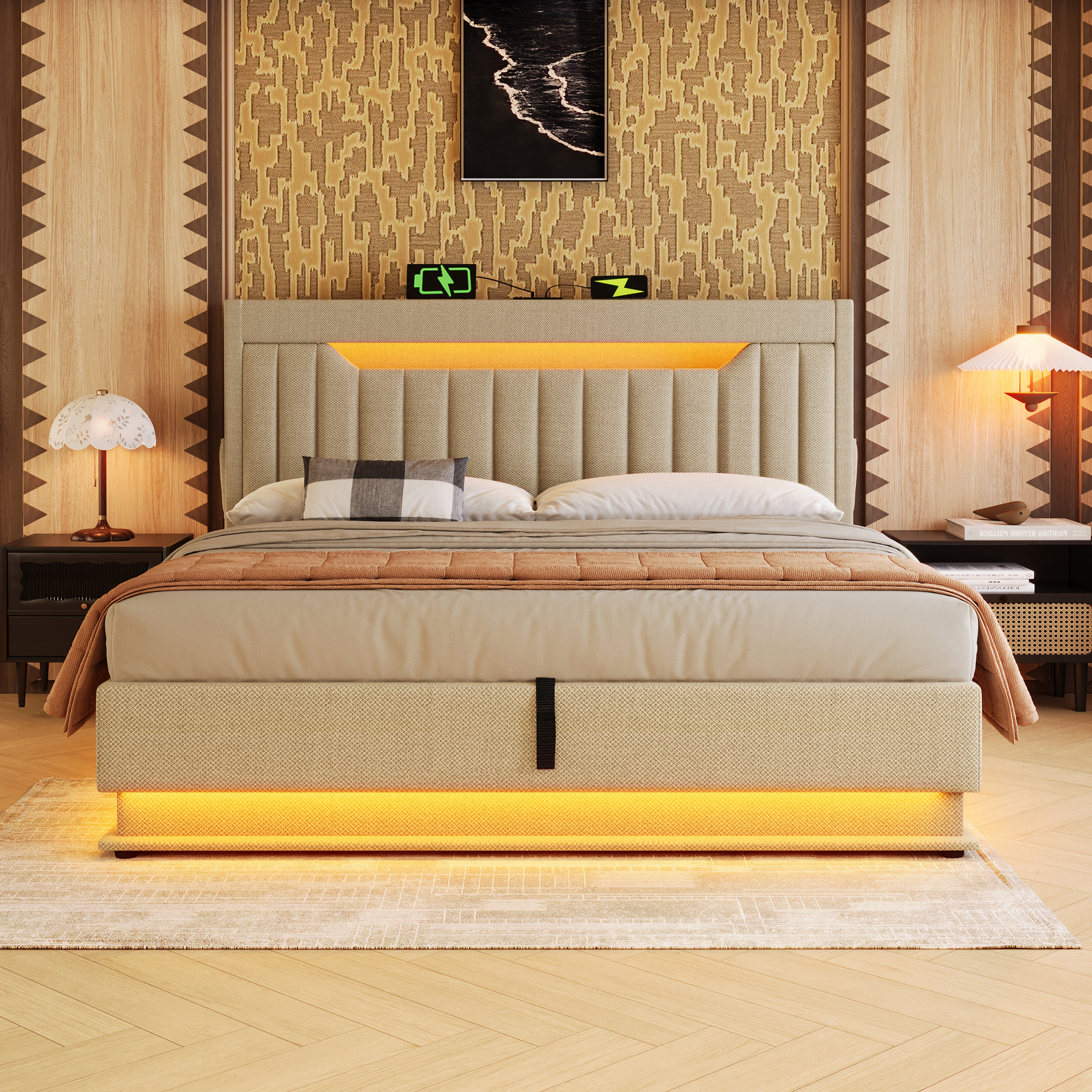 Product Name:Upholstered Bed 135 x 190 cm with LED Lighting, USB Type-C Charging, Storage Headboard for Cellphones and Tablets, 4ft6 Hydraulic Storage Bed with Metal Slatted Frame, Linen, Beige (No Mattress)