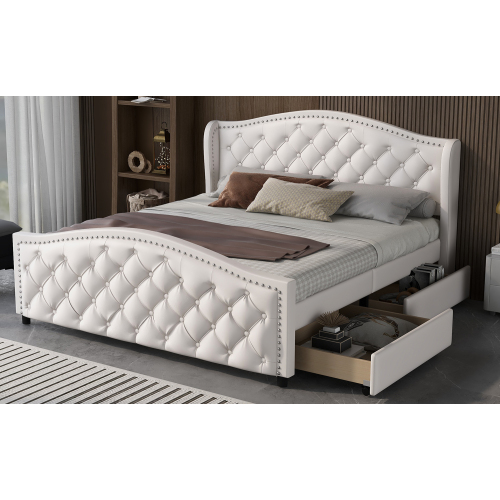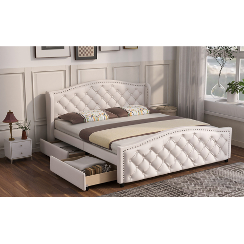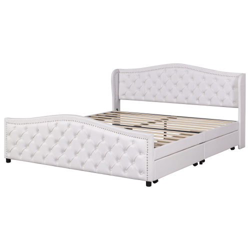 Product Name:Upholstered bed 135 x 190cm - bed with slatted frame, 2 drawers and headboard with pull point rivets - wood & faux leather - white - youth bed guest bed
