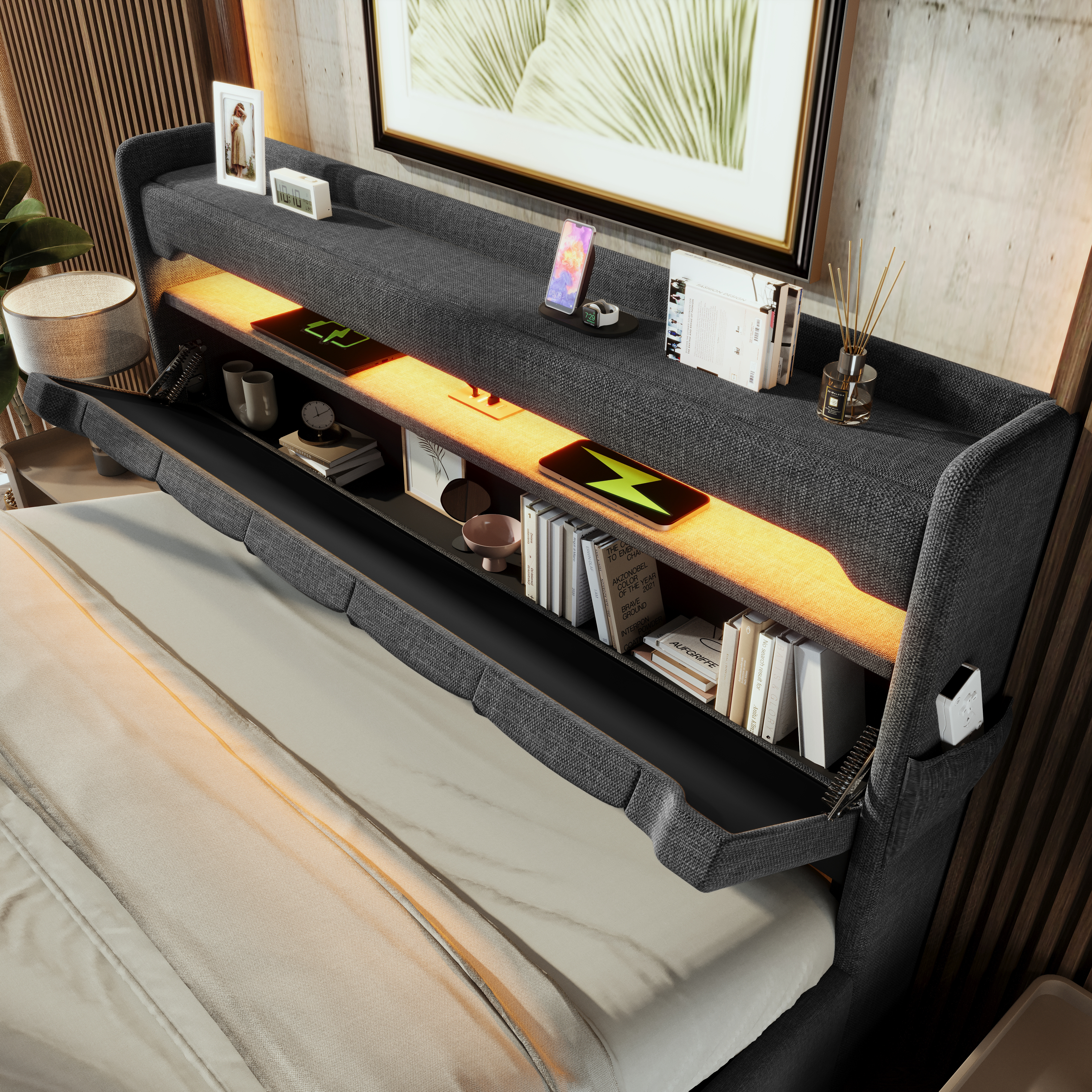 Product Name:Upholstered Bed 180 x 200 cm with LED Lighting, USB Type-C Charging, Storage Headboard for Cellphones and Tablets, 6ft Hydraulic Storage Bed with Metal Slatted Frame, Linen, Grey (No Mattress)