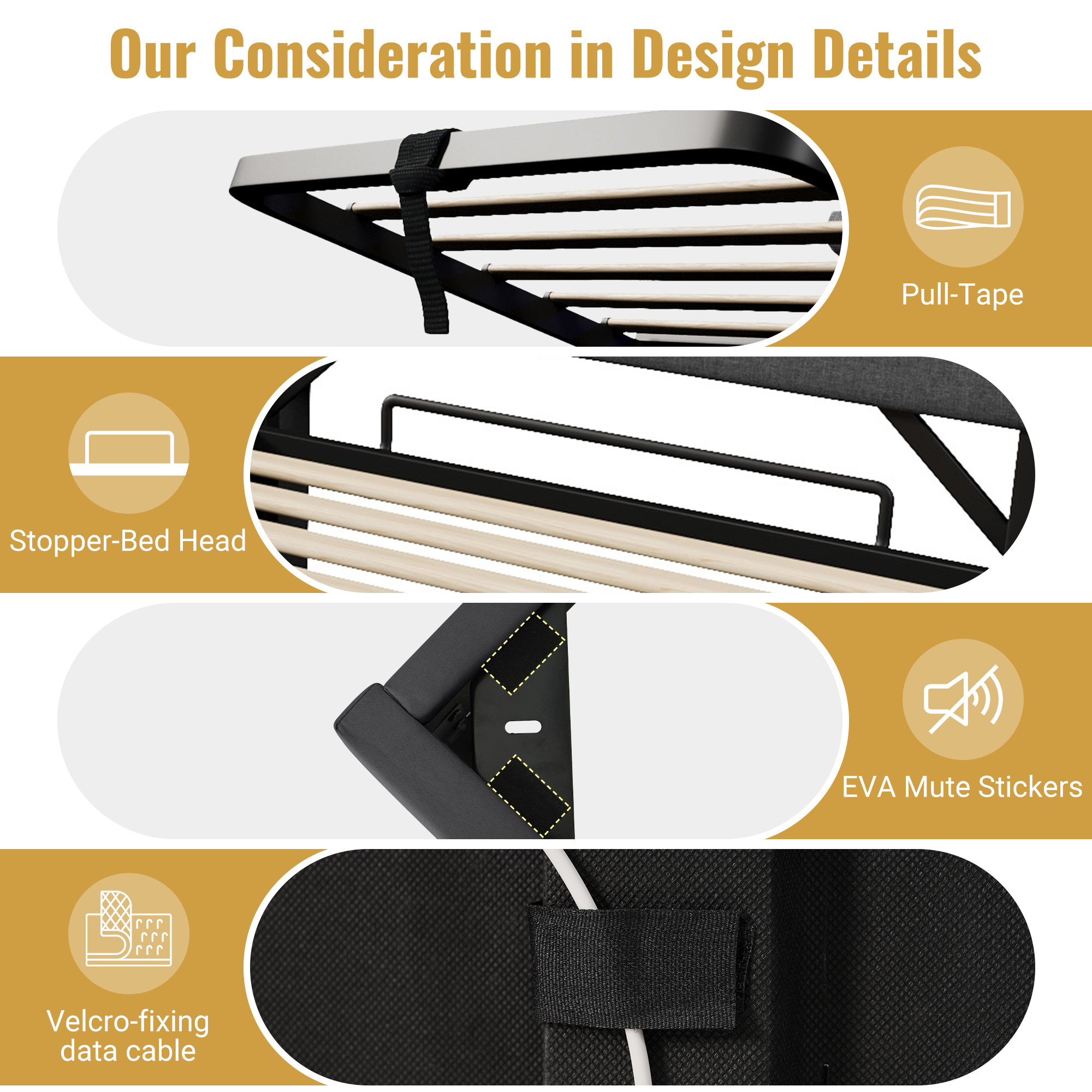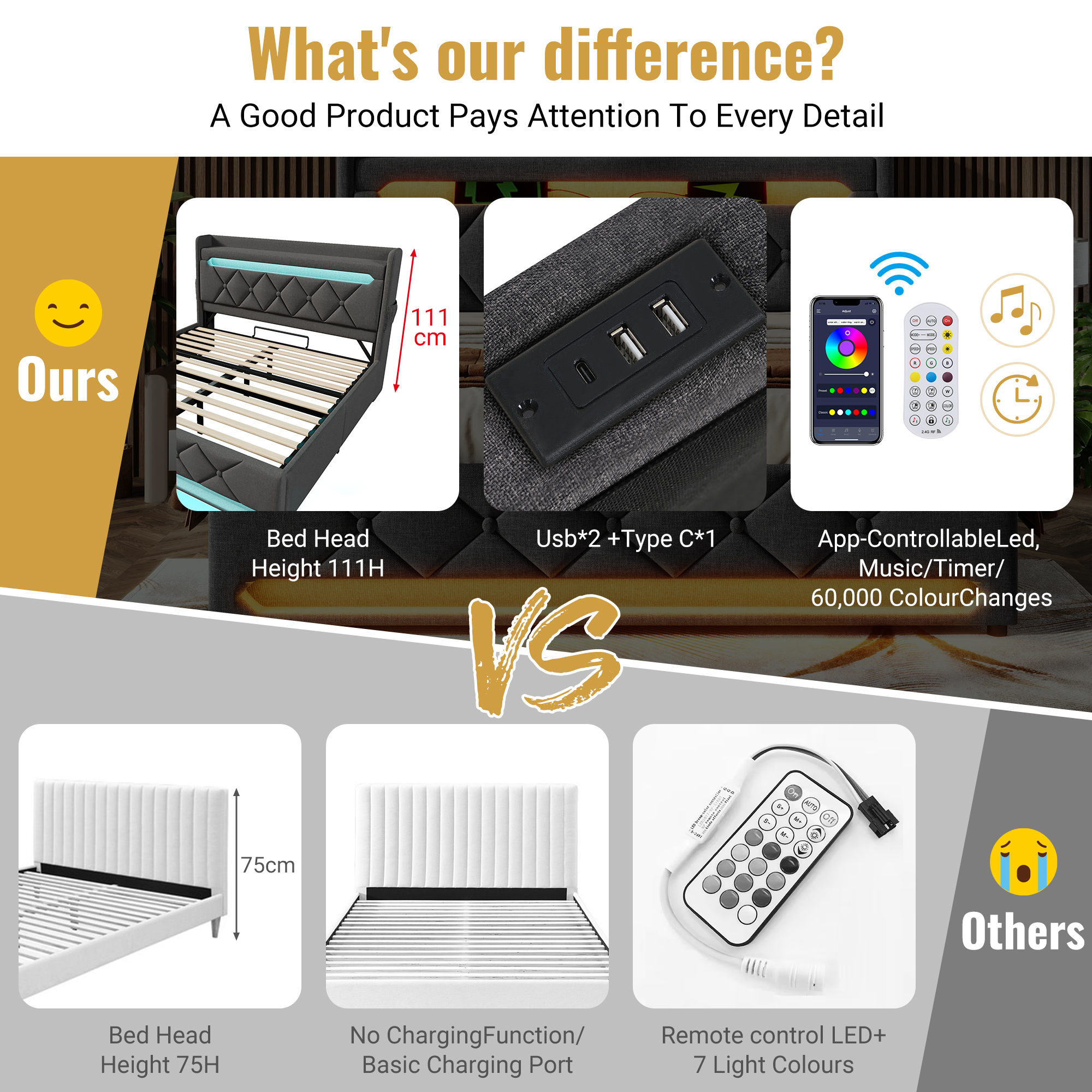 • 【INNOVATIVE LED LIGHTING】Integrated LED light strips at the head and foot of the bed support timers and multiple dynamic lighting modes. You can choose from over 60,000 light colors via an app or remote control, and the lights can even flash to the rhythm of the music. This LED light strip perfectly combines practical functionality and stylish design.