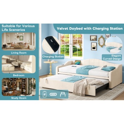 This daybed offers three convertible forms: sofa, trundle bed and daybed. With the straps and bottom wheels, it can be easily converted from a comfortable sofa to a spacious daybed. The side panel is equipped with USB and type-C ports, convenient for you to charge your cell phone, tablet or lamp at any time. It padded with high resilience sponge and covered soft velvet to give you better support when reading and relaxing. It elegant curved design that help to blend in with different life scenarios. It will be the highlight of your home, bringing style and comfort to your home. Whether you're watching your favorite shows or hosting friends, this space-saving couch provides the perfect balance of functionality and comfort. Special Features: - Type-C port and USB ports for charging - Three convertible forms: sofa, trundle bed and daybed - Soft velvet fabric - Sturdy metal-wood support - Elegant curved design suitable for various life scenarios - Easy assembly and care