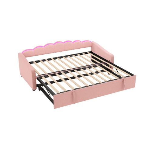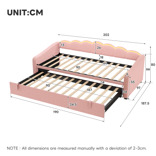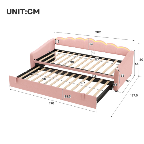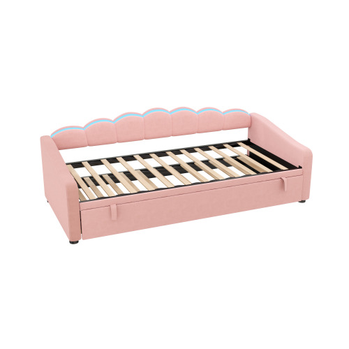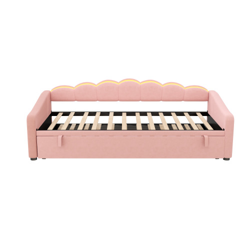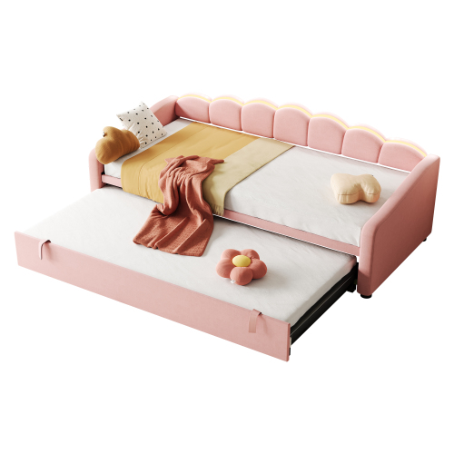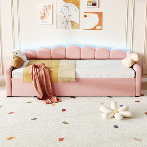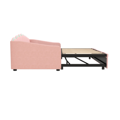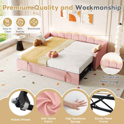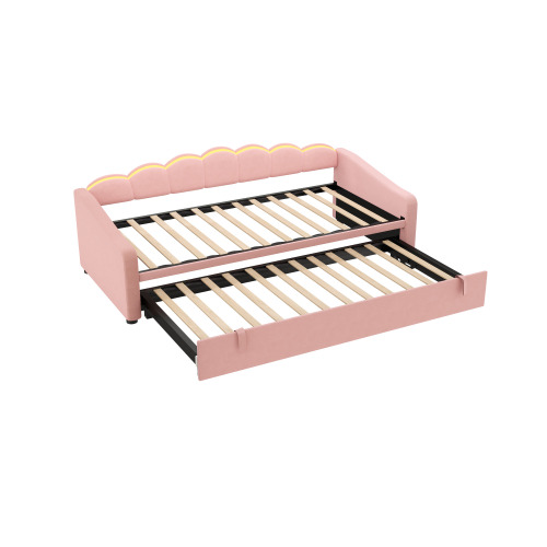 Product Name:Upholstered Bed 90x190cm, Daybed, Sofa Bed with RGB LED Lighting, 3ft Petal Shape Single Bed with Trundle,Pull out Trundle Bed for Living Room/ Bedroom/ Study Room, Velvet, Pink (No Mattress)