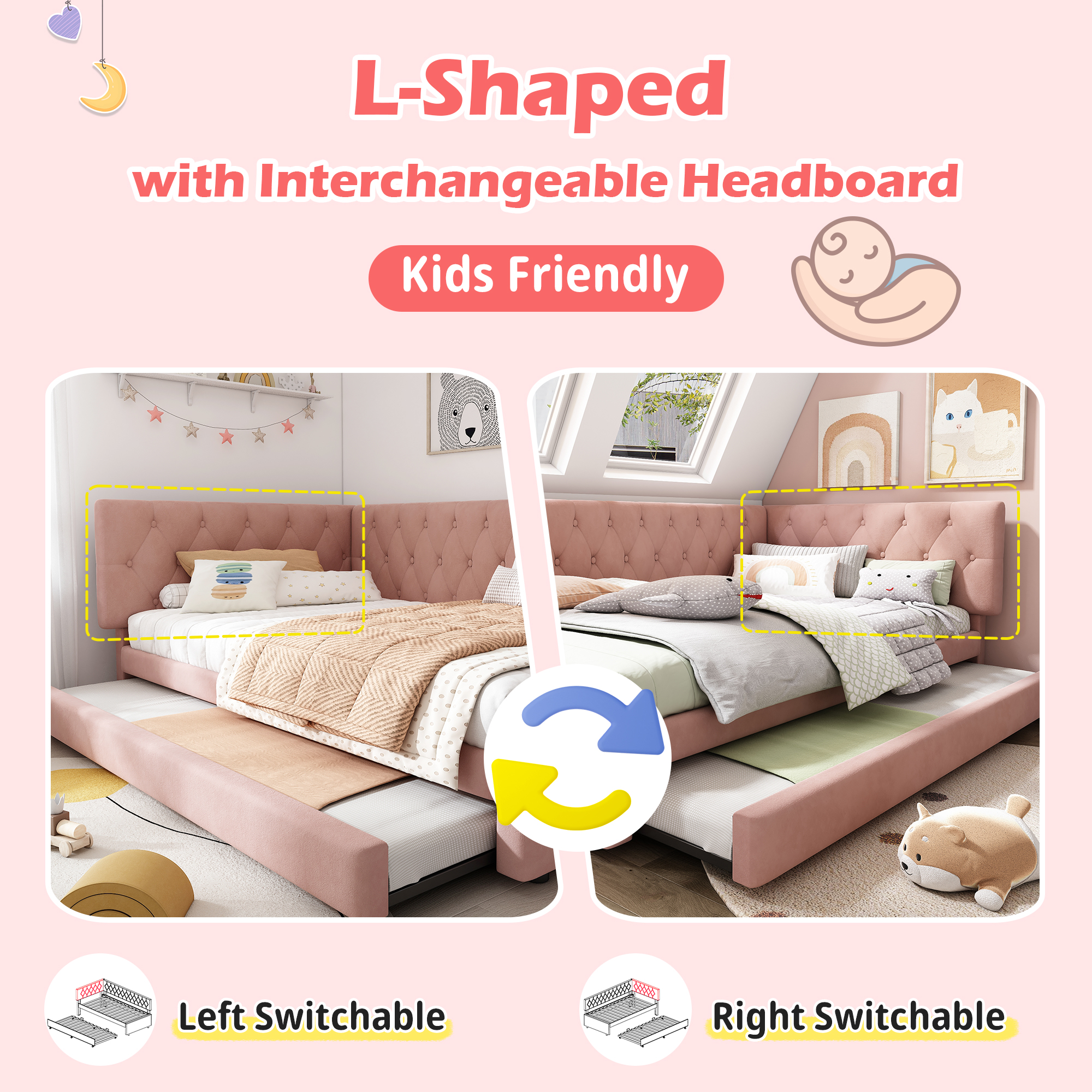 • 【Flexible Adaptation to Various Room Configurations】The headboard of the bed offers two different mounting options and can be positioned either left or right. This makes it ideal for adapting to various room configurations and thus meets the individual needs of different living spaces.