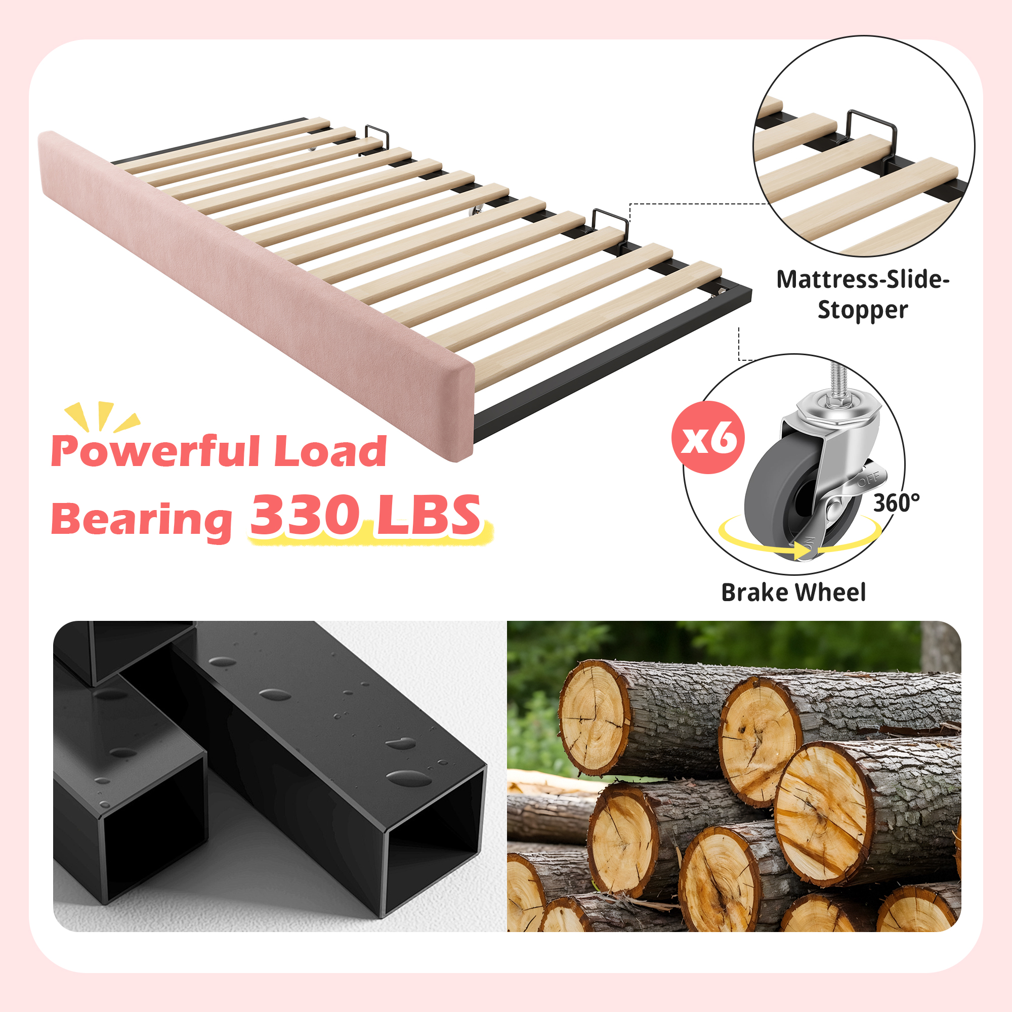 • 【Sturdy and Comfortable】 The iron tubular bed frame is durable and stable. Sound-absorbing cotton at the metal contact points reduces noise and friction, extending the lifespan of the bed. The pull-out bed features six casters with brakes for added safety and also equipped with two U-shaped bars to prevent the mattress from shifting, ensuring stability during use.