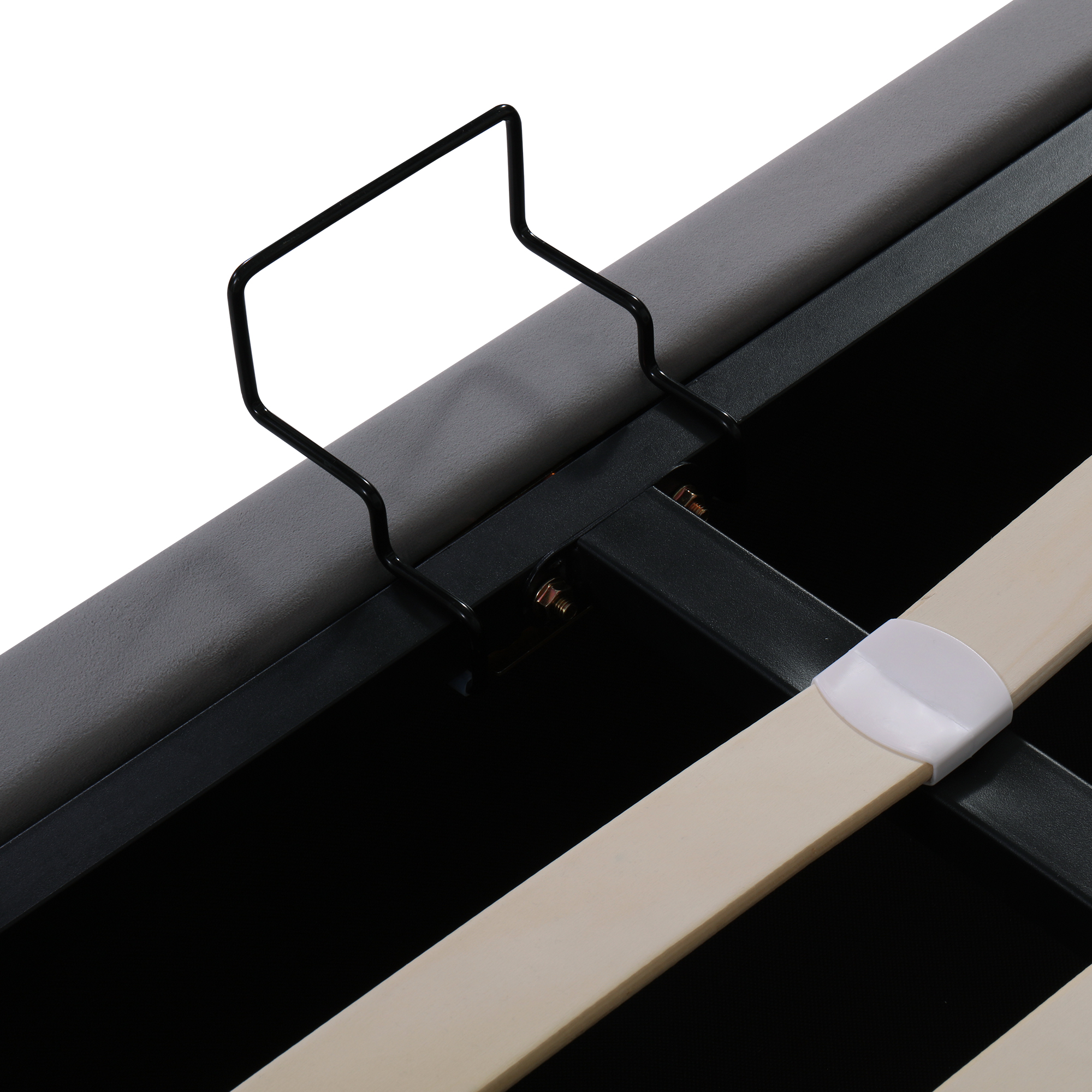 The upholstered bed is equipped with a hydraulic system that raises the lower part of the bed frame and allows storage space underneath. This hydraulic system allows the bed to be raised and lowered easily.