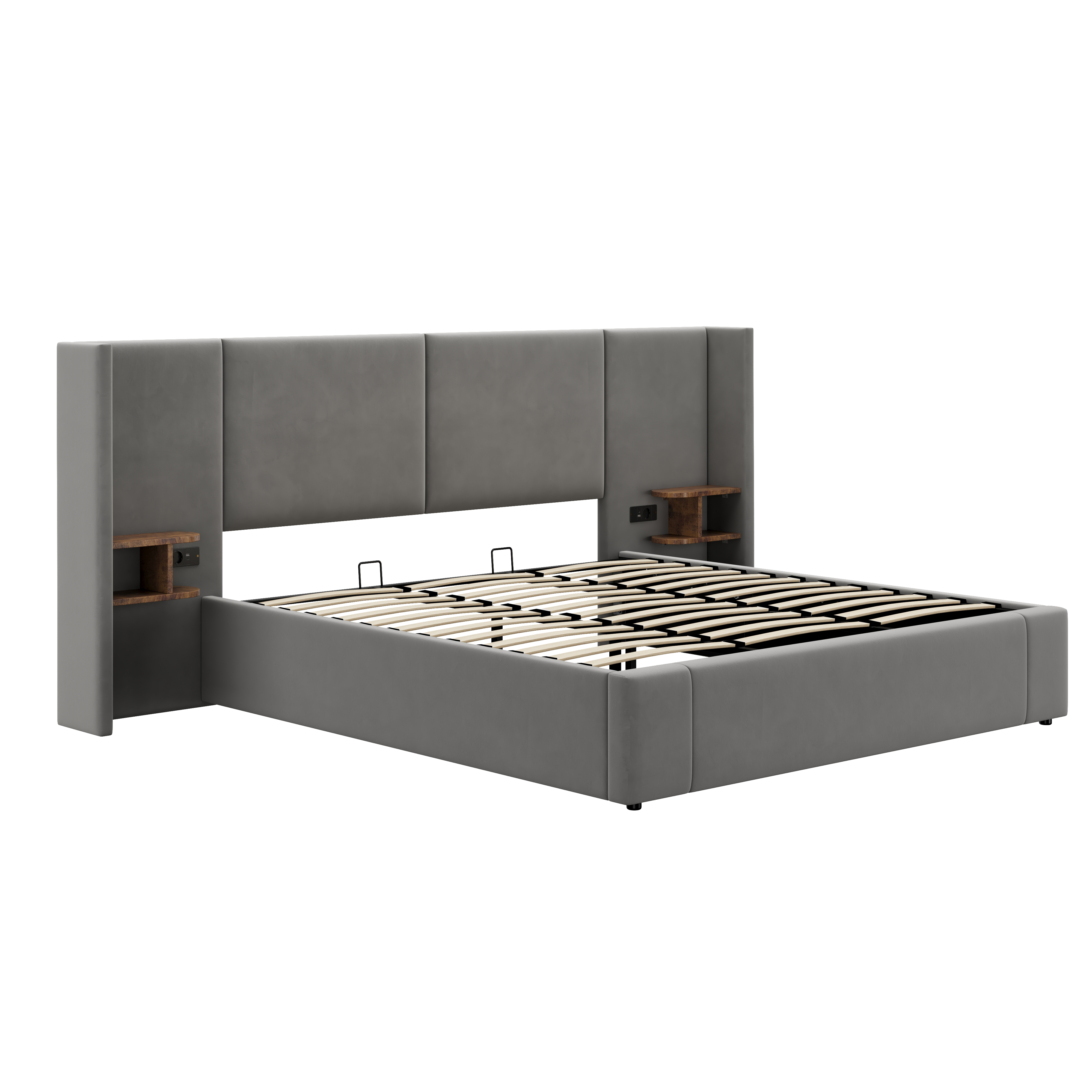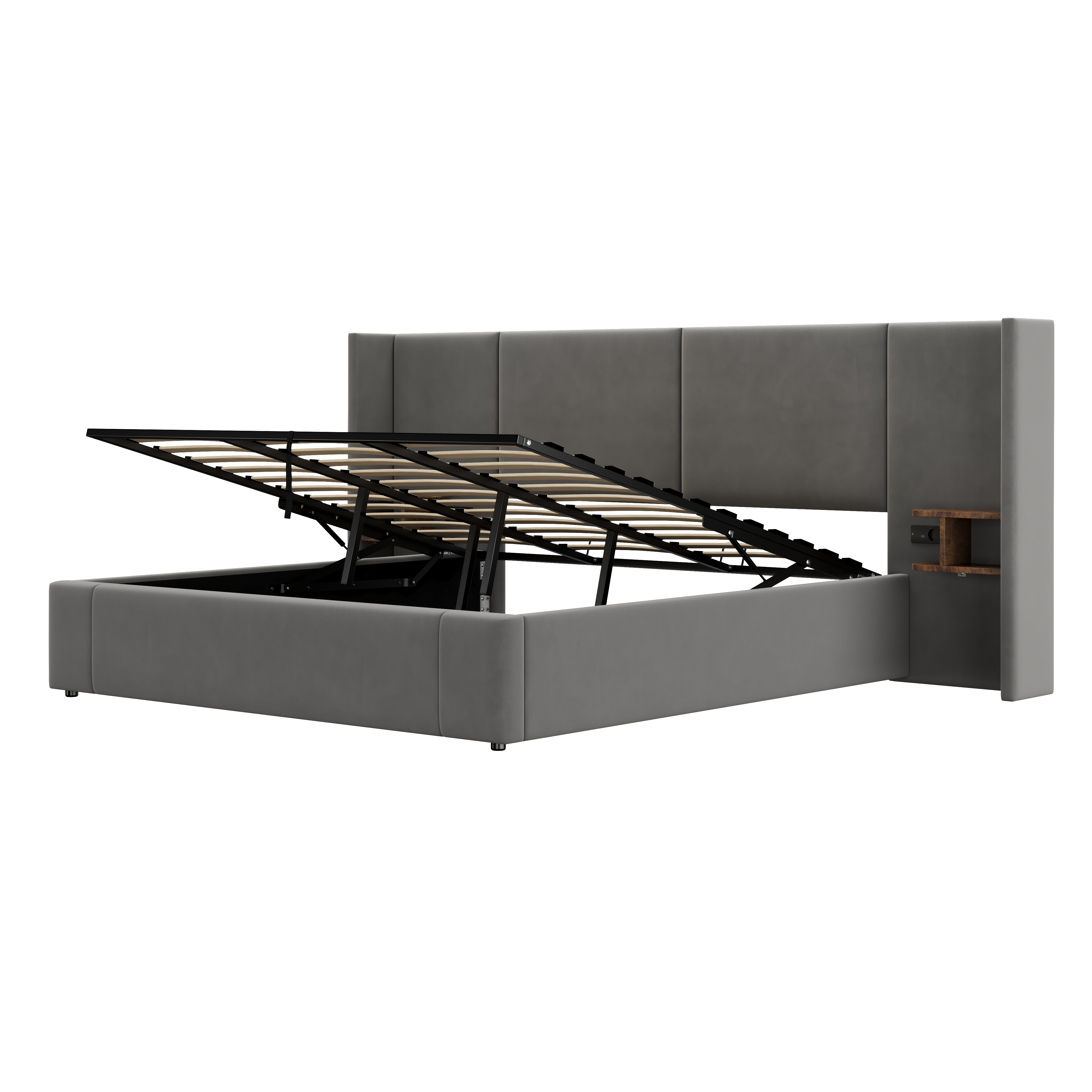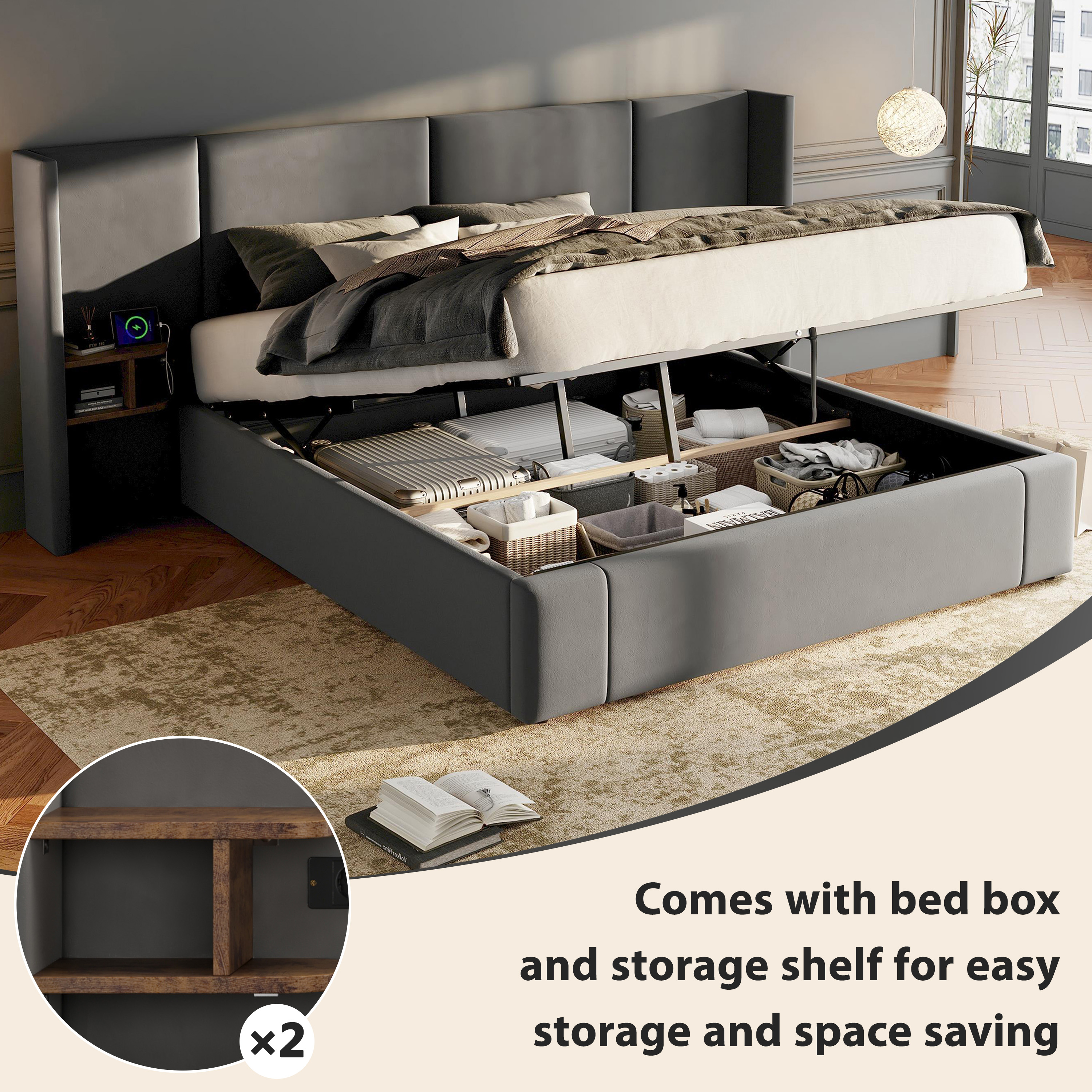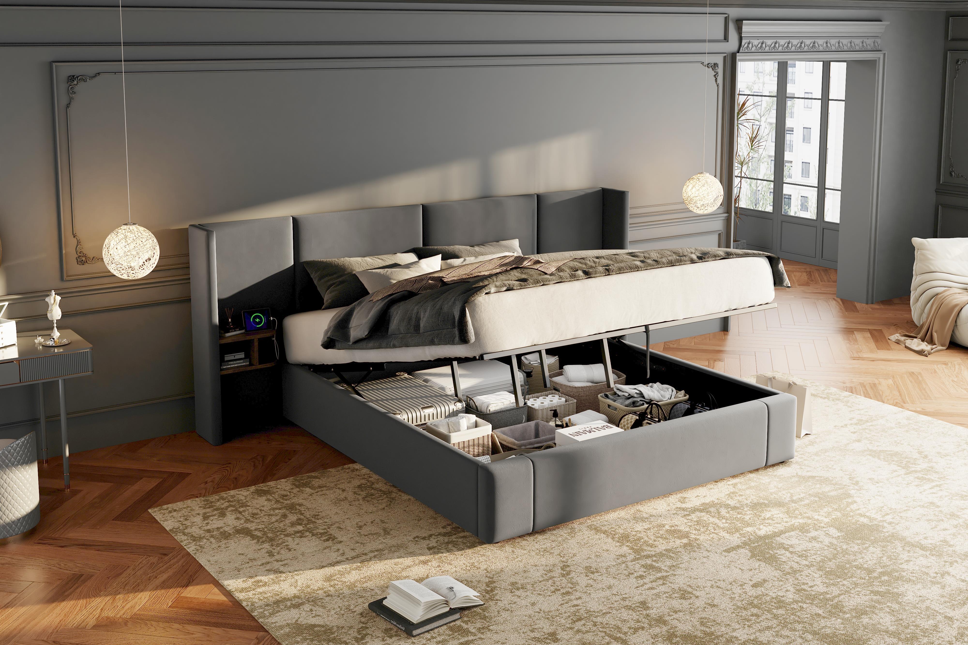Product Name:Upholstered bed, Super King Size Bed-6ft(180*200cm),Velvet Ottoman Lift Up Super King Size Bed Frame, hydraulic wide-ear bed with USB connection, with sockets, with two bedside tables,No mattre,grey