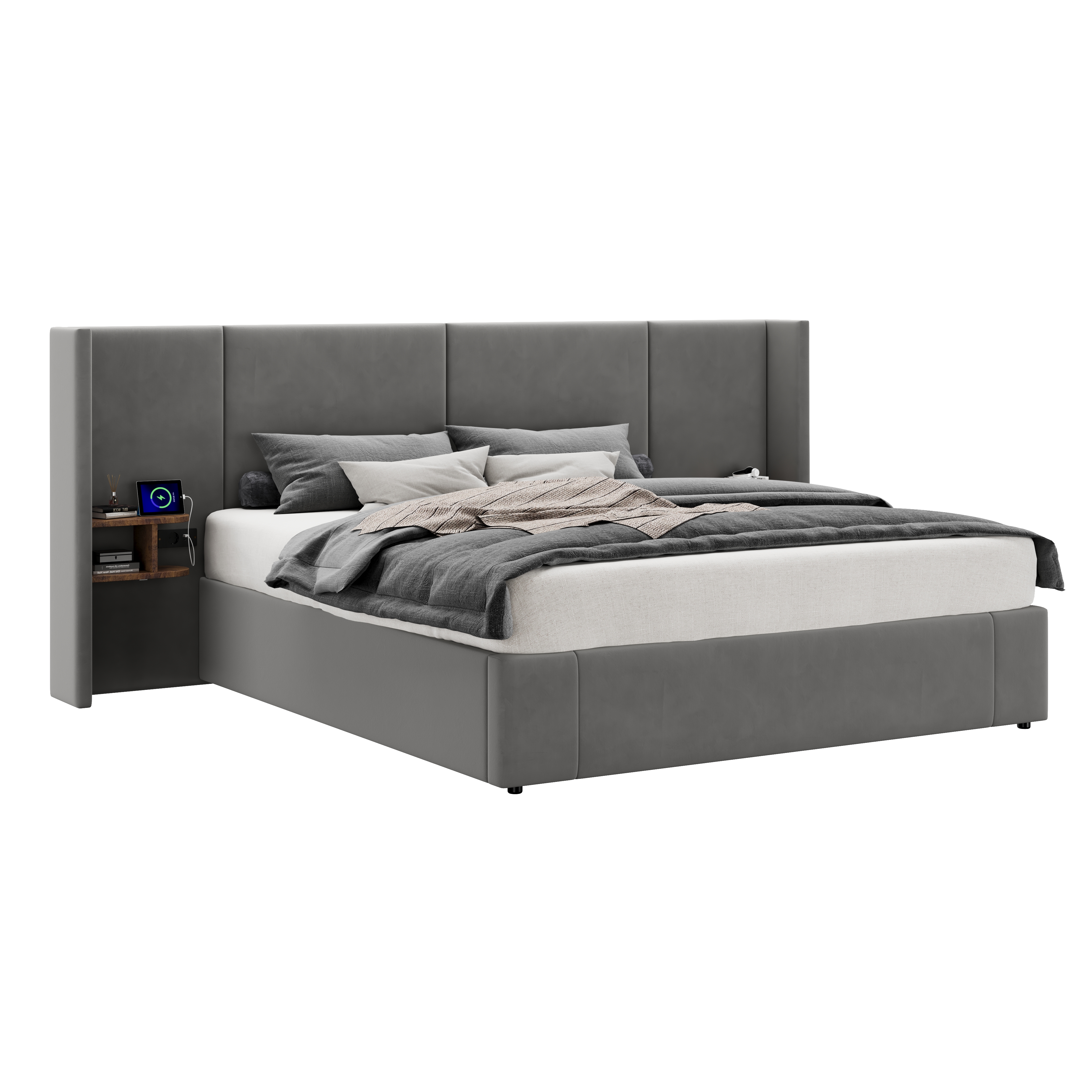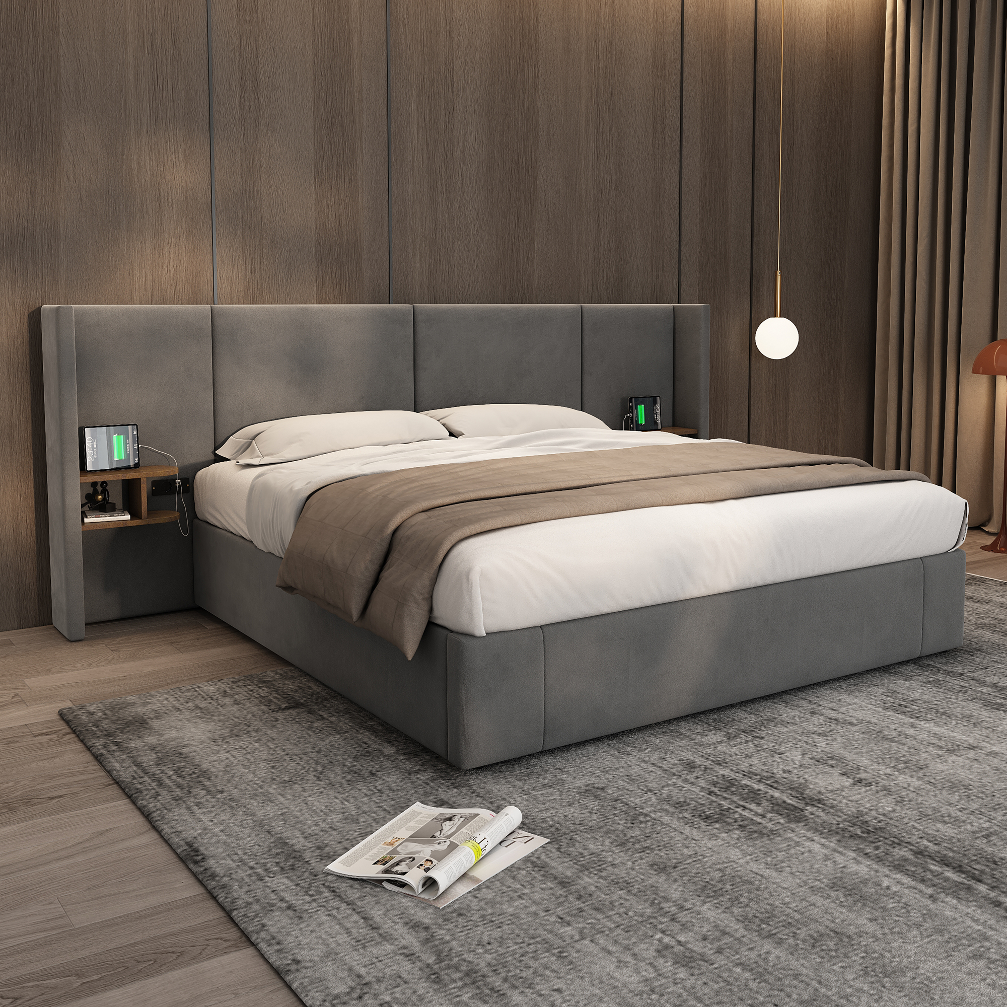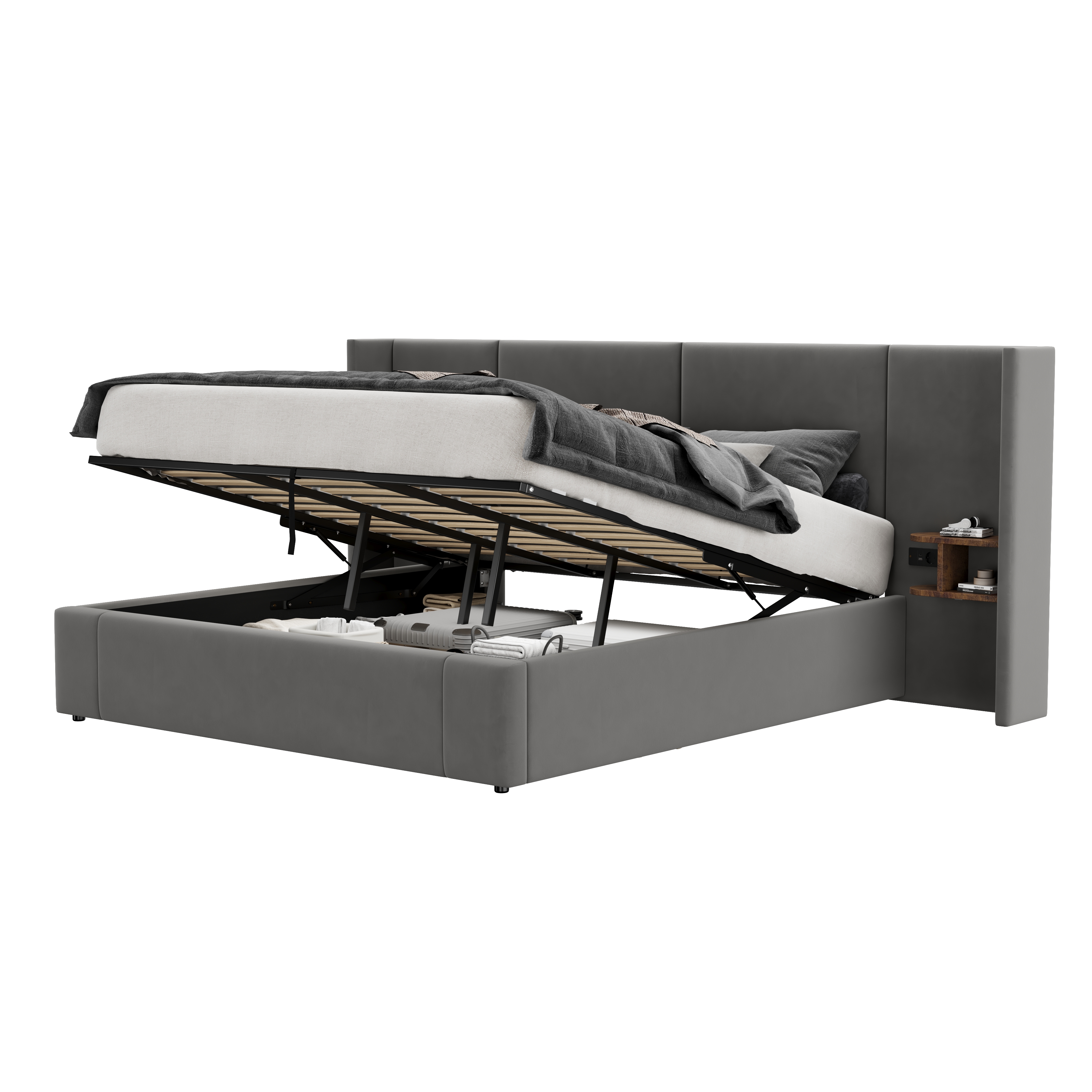 Product Name:Upholstered bed, Super King Size Bed-6ft(180*200cm),Velvet Ottoman Lift Up Super King Size Bed Frame, hydraulic wide-ear bed with USB connection, with sockets, with two bedside tables,No mattre,grey