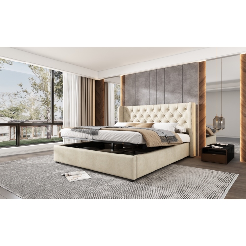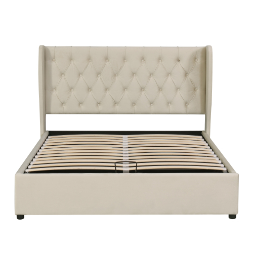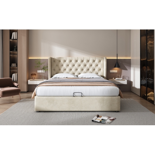 Product Name:Upholstered bed, with hydraulic lever, functional bed from storage, 135 x 190 cm, without mattress, velvet, beige