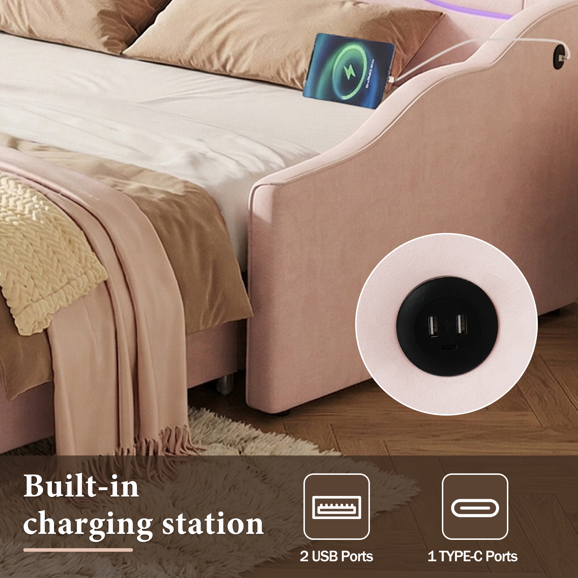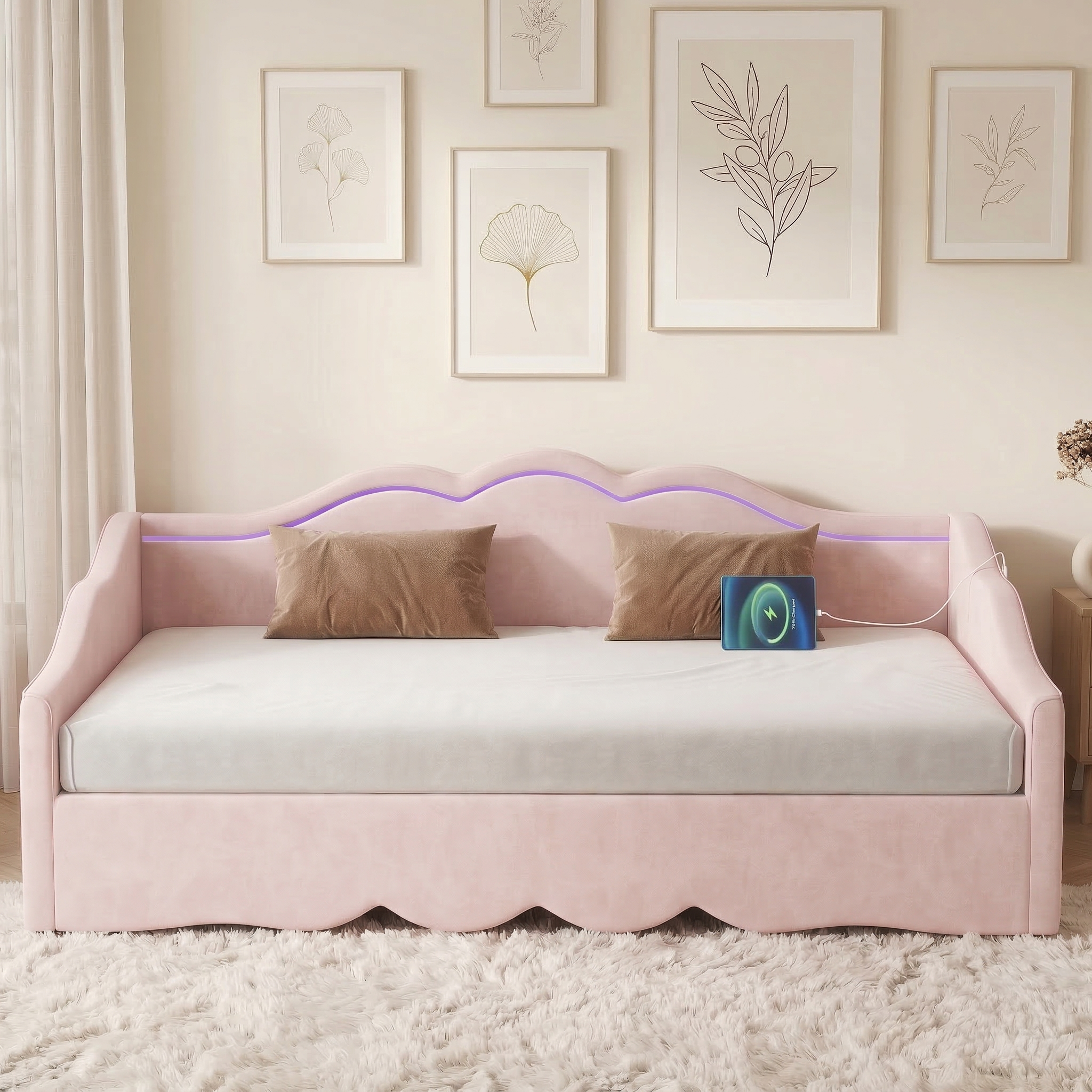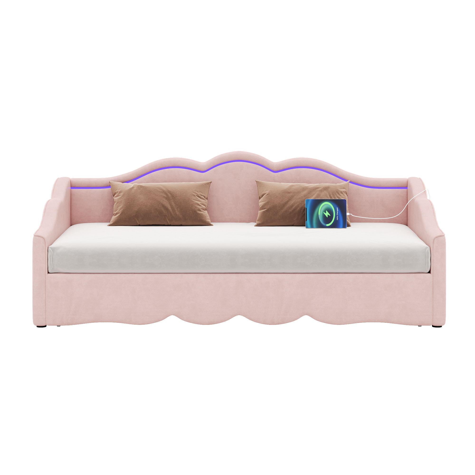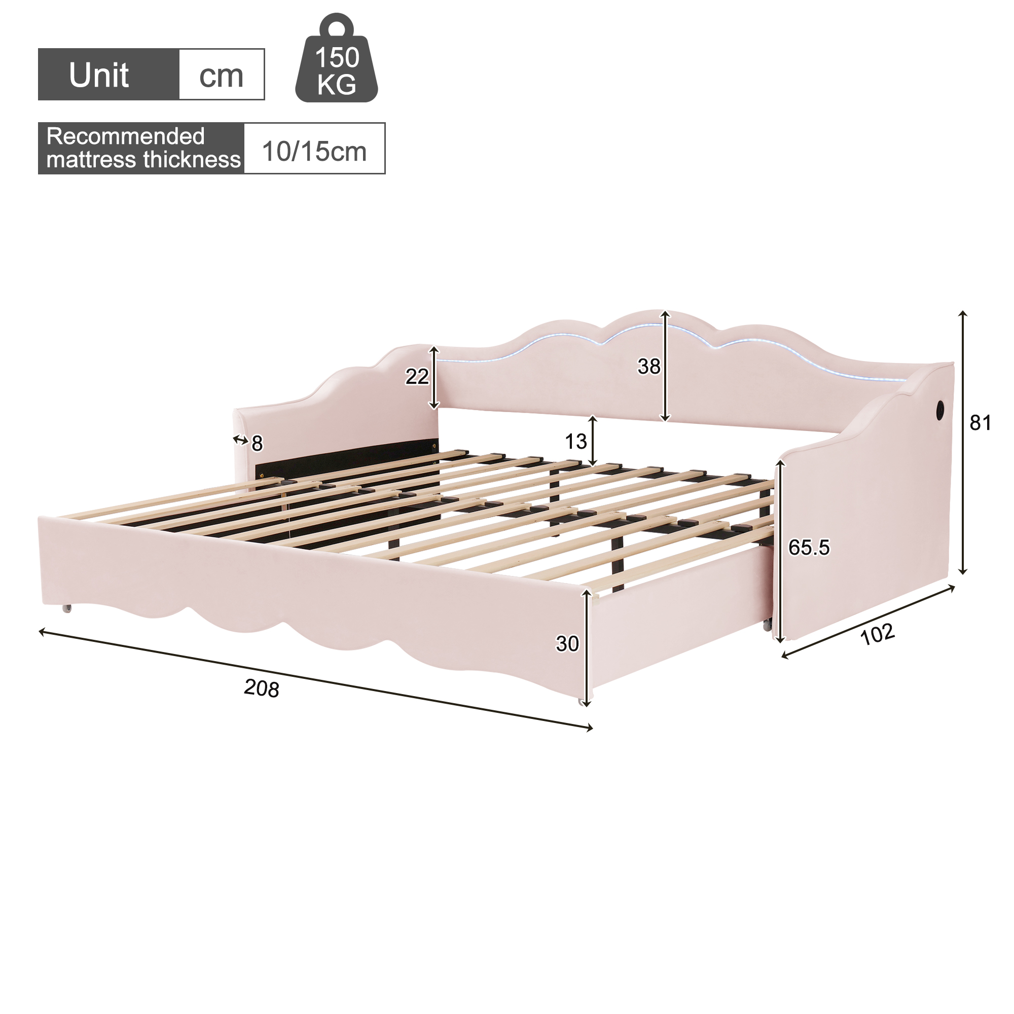 Product Name:Upholstered Daybed, Sofa Bed, 90x190 cm, Extendable to 180 cm, with LED Lighting and USB Port, pink Velvet