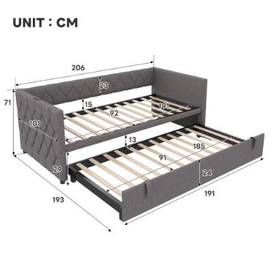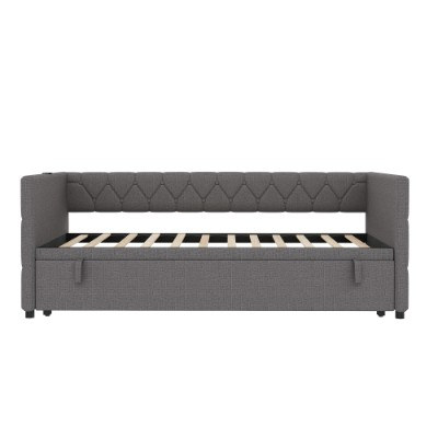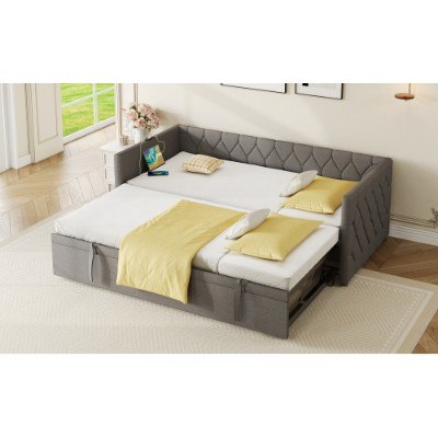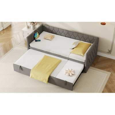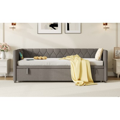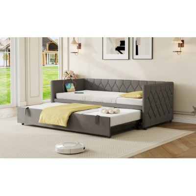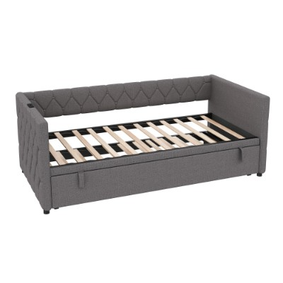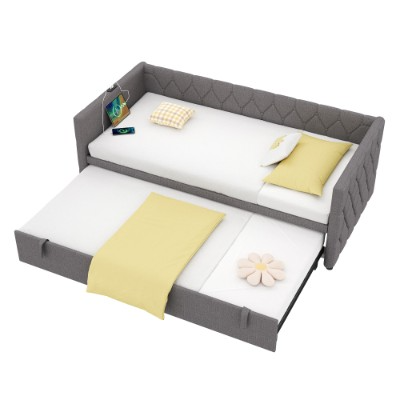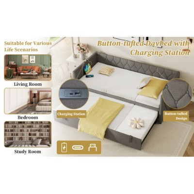 Product Name:Upholstered Daybed, Sofa Bed with Charging Station, 3ft Single Button-tufted Bed with USB and Type - C Ports, Pull out Trundle Bed for Living Room/ Bedroom/ Study Room, Linen, Grey (No Mattress)