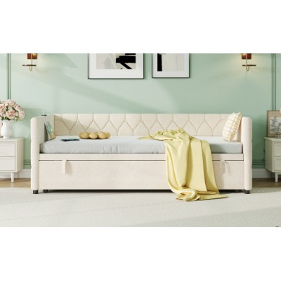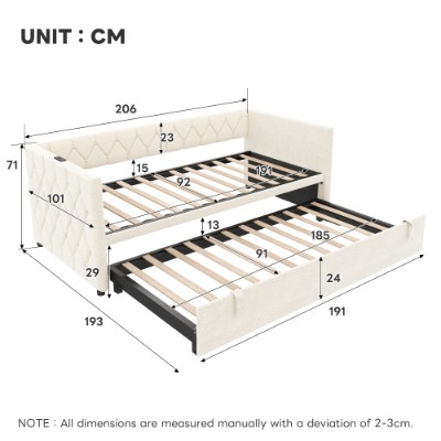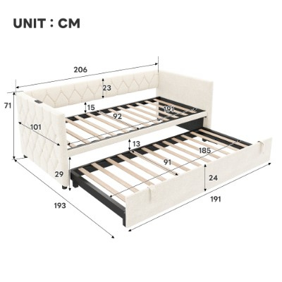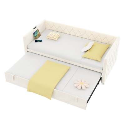 This daybed offers three convertible forms: sofa, trundle bed and daybed. With the straps and bottom wheels, it can be easily converted from a comfortable sofa to a spacious daybed. The side panel is equipped with USB and type-C ports, convenient for you to charge your cell phone, tablet or lamp at any time. It padded with high resilience sponge and covered soft velvet to give you better support when reading and relaxing. It button-tufted design that help to blend in with different life scenarios. It will be the highlight of your home, bringing style and comfort to your home. Whether you're watching your favorite shows or hosting friends, this space-saving couch provides the perfect balance of functionality and comfort. Special Features: - Type-C port and USB ports for charging - Three convertible forms: sofa, trundle bed and daybed - Wear-resistant linen fabric - Sturdy metal-wood support - Button-tufted design suitable for various life scenarios - Easy assembly and care