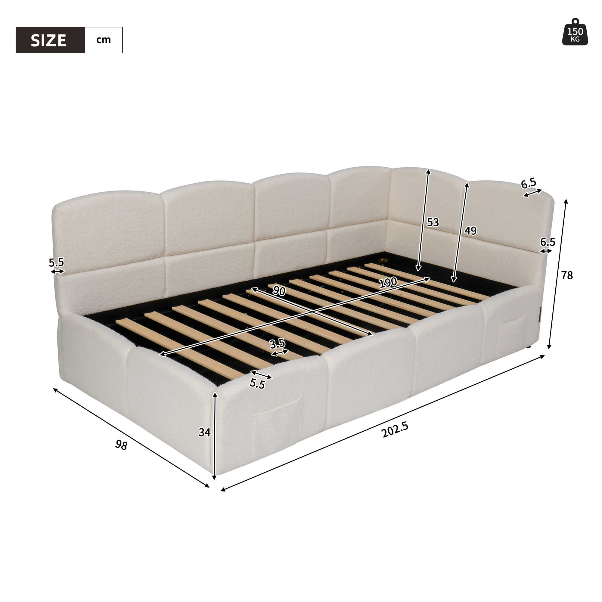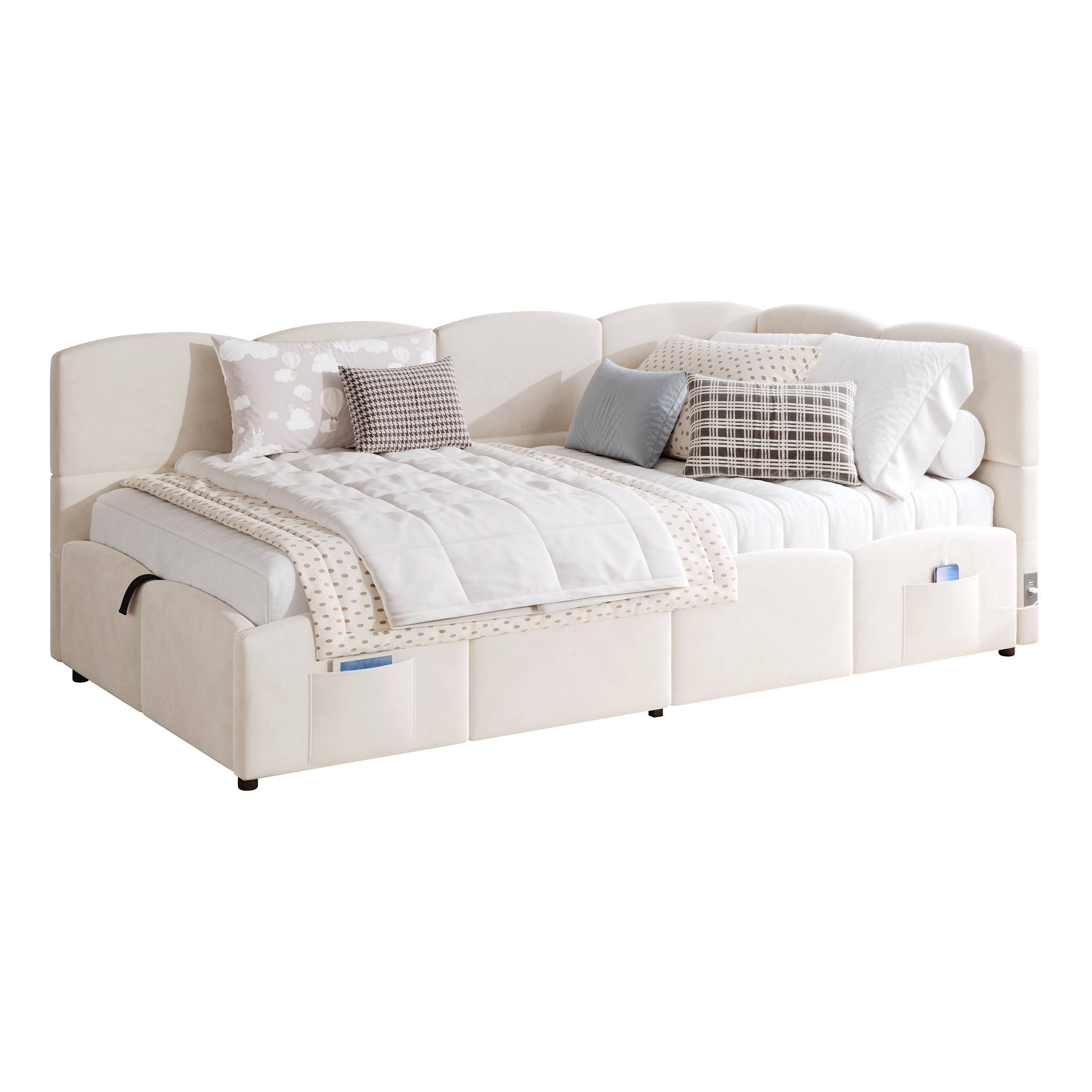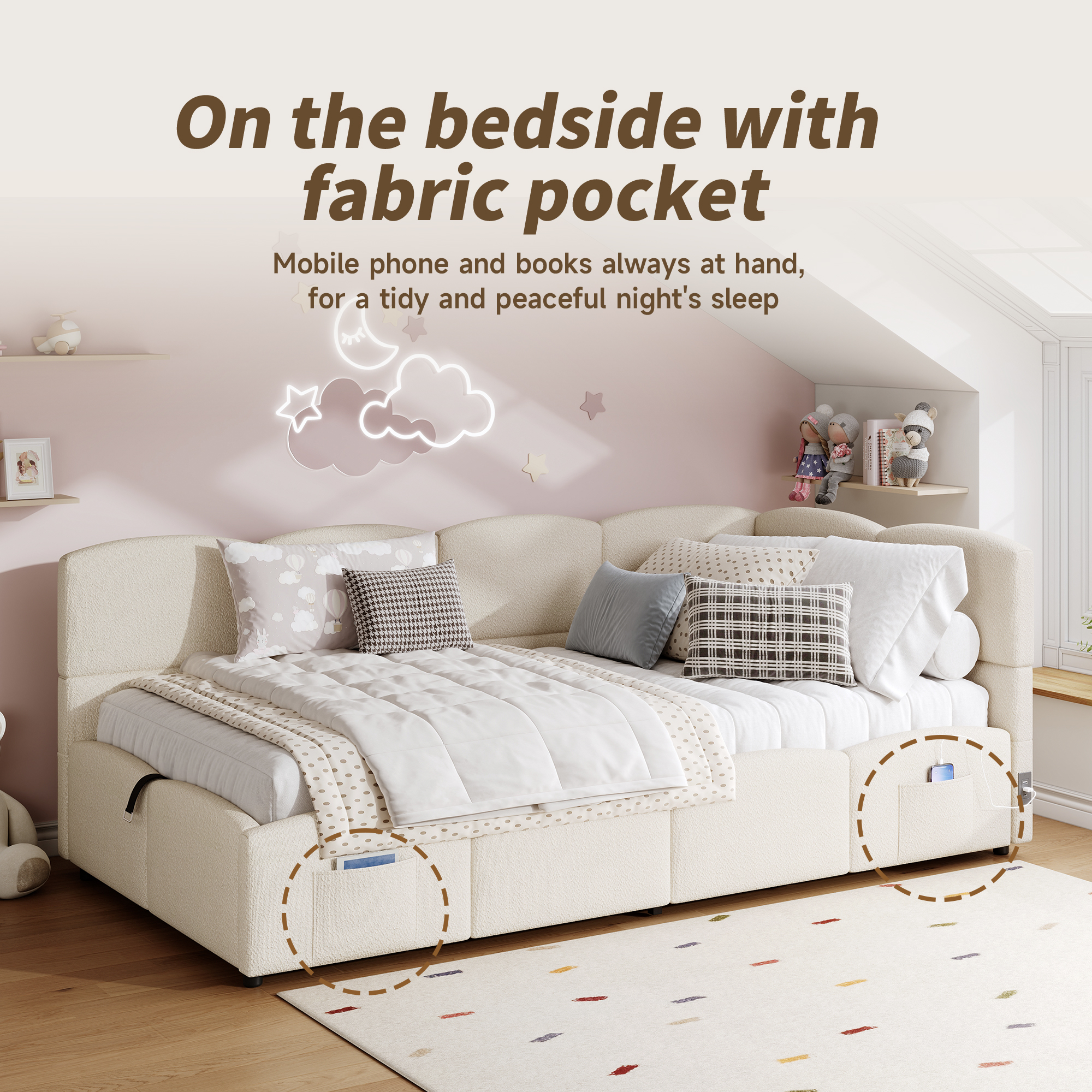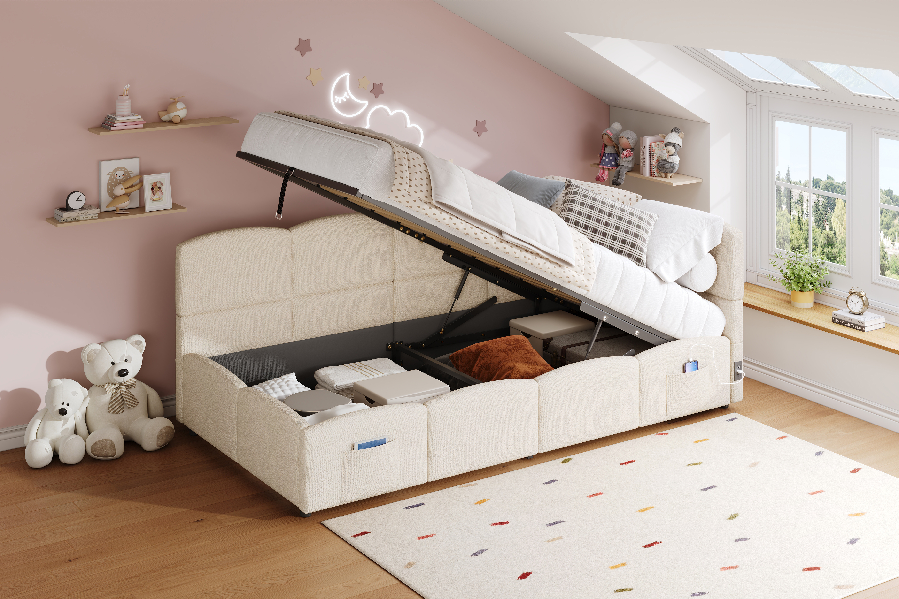 Product Name:Upholstered sofa bed 90 x 190 cm, 3-ft single daybed, children's bed, single sofa bed with slatted frame, hydraulic storage, USB charging, boucle, beige(without mattress)