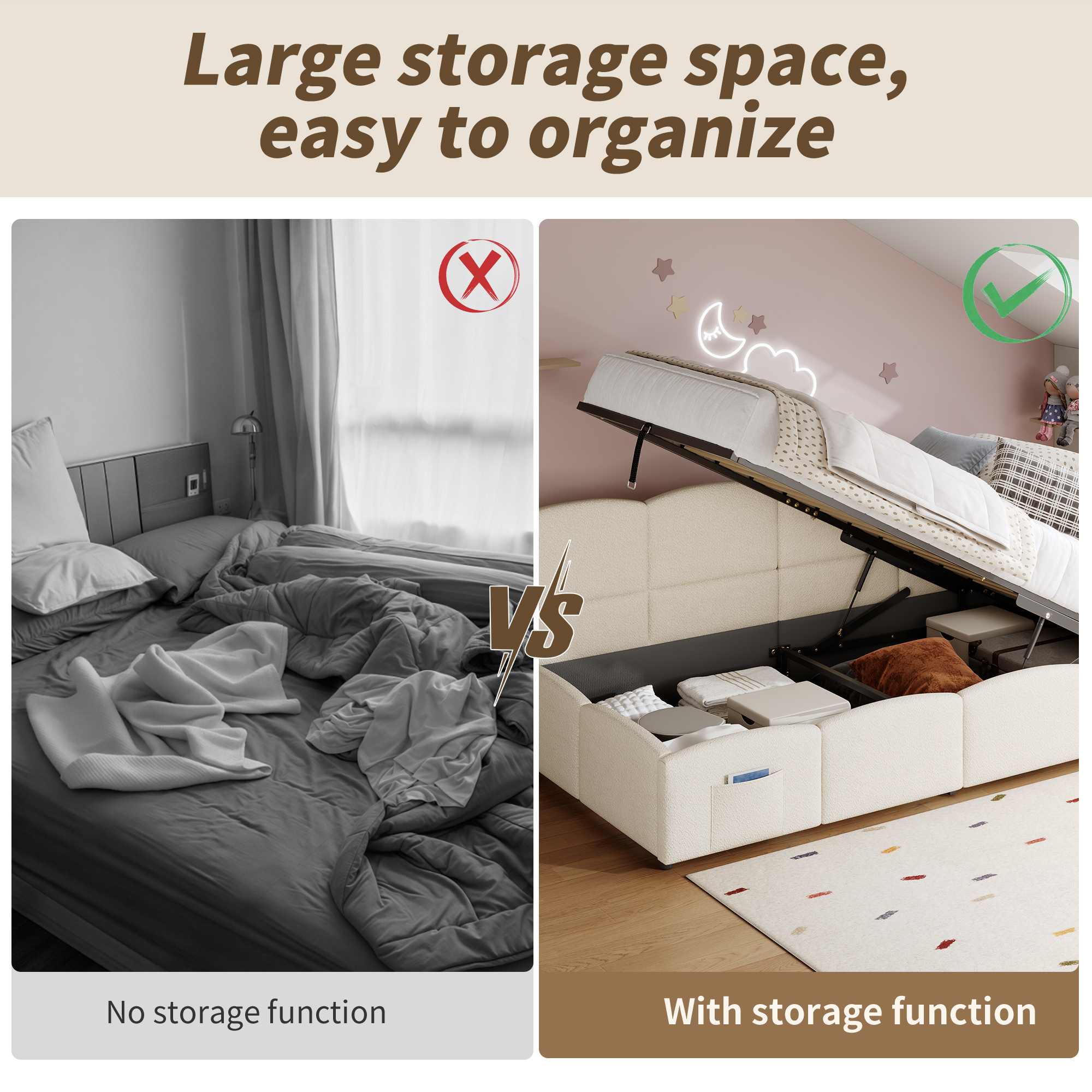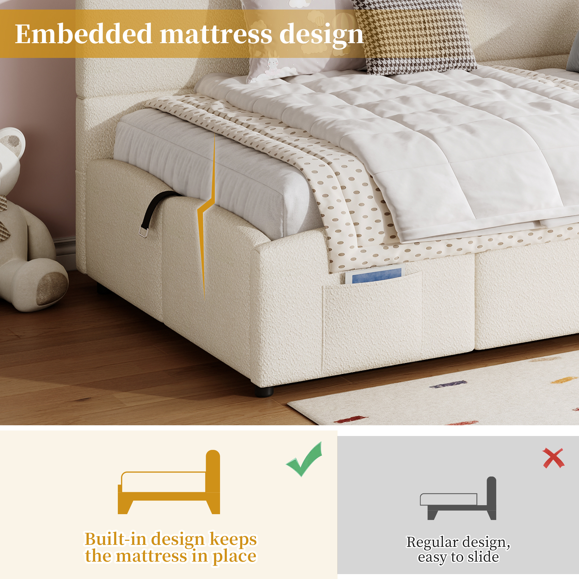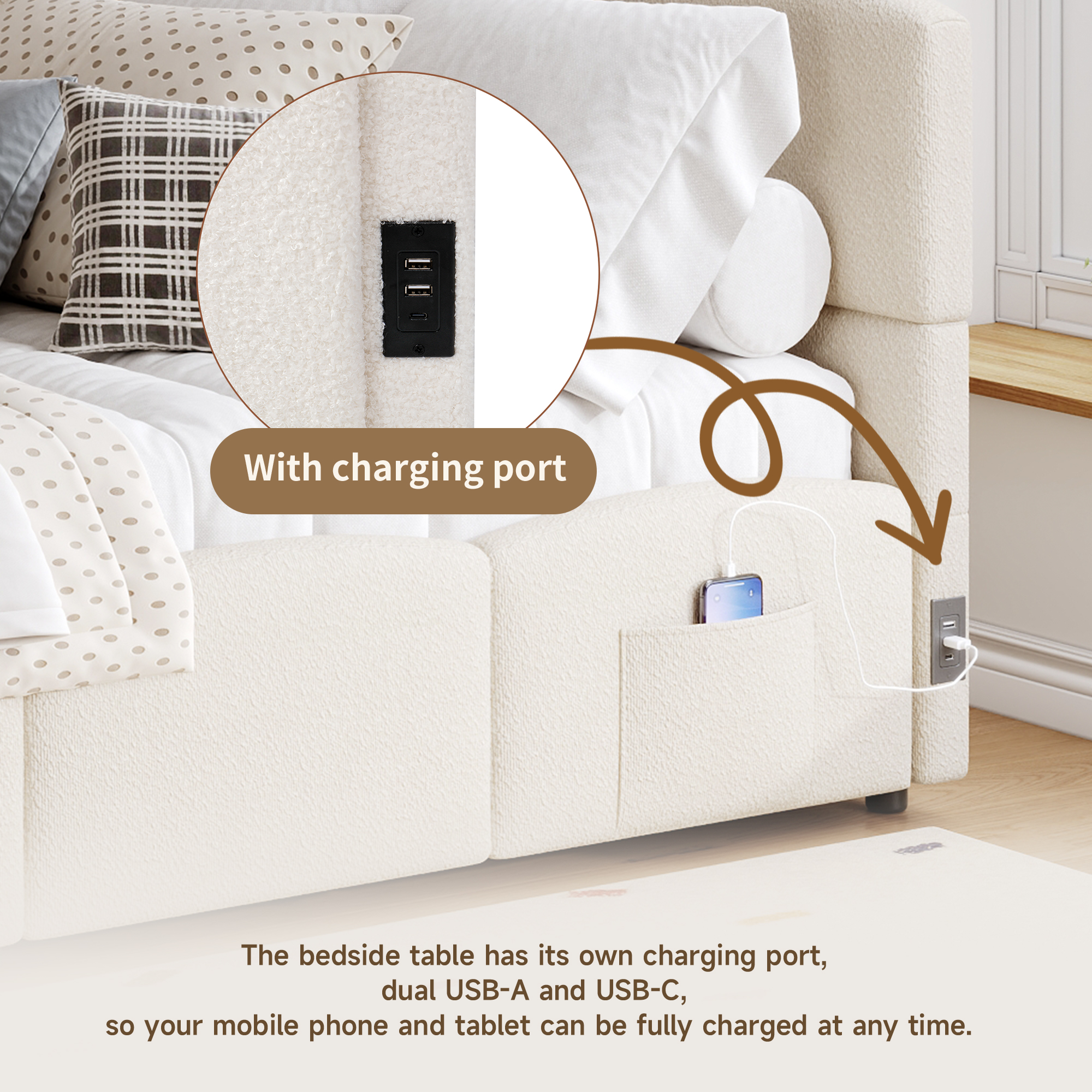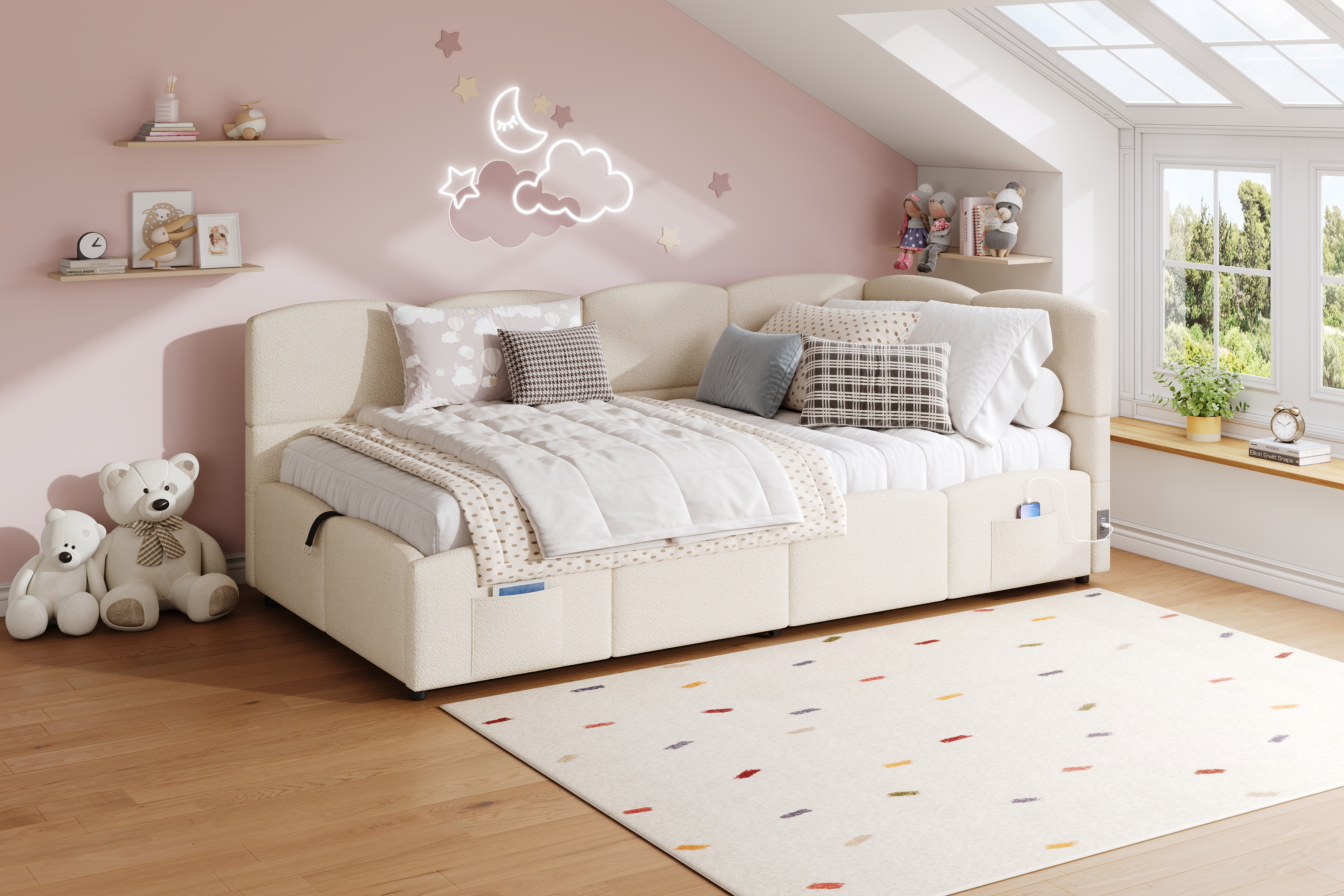 Product Name:Upholstered sofa bed 90 x 190 cm, 3-ft single daybed, children's bed, single sofa bed with slatted frame, hydraulic storage, USB charging, boucle, beige(without mattress)
