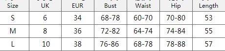 | Size | UK | EUR | Bust | Waist | Hip | Length |
