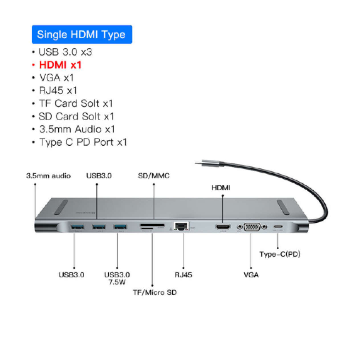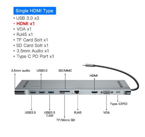 -Function:USB 3.0,HDMI,VGA,RJ45,SD/TF Card Reader,PD Charging USB HUB