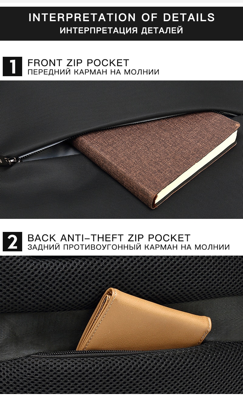 Package internal structure: ID bag, mobile phone bag, laminated zipper bag, zipper pocket, computer pocket