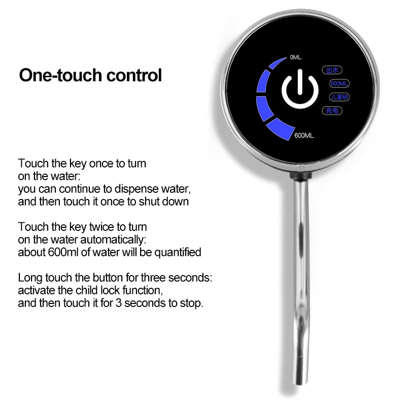 Touch the button once to turn on the water: you can continue to dispense water, then touch once to turn off;