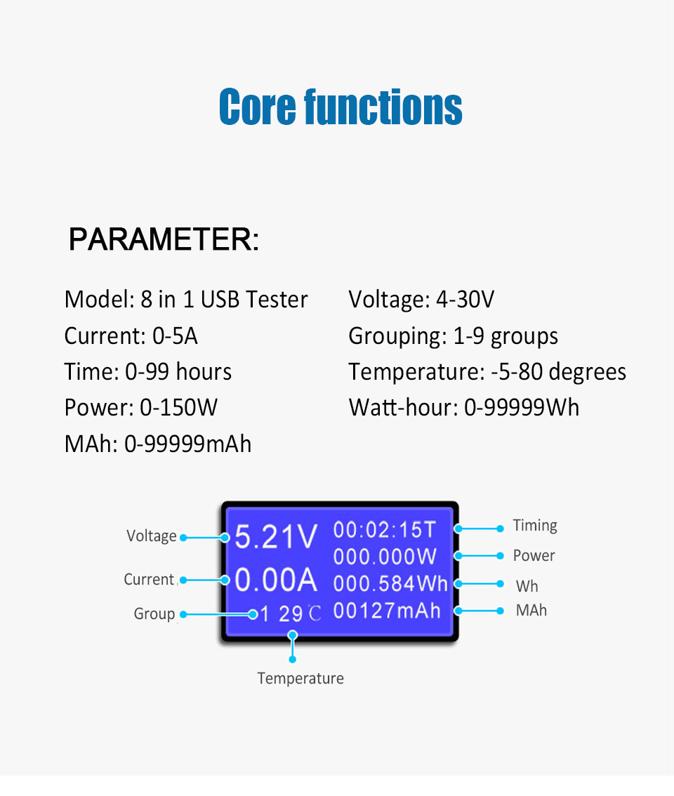 Page: 1 it can easily measure the USB port (USB, mobile phone charger, car charger, mobile power supply, etc.) and the operating current and output voltage of the device, as well as the charging and discharging capacity and performance of the cable charging equipment. This tester can meet the requirements!