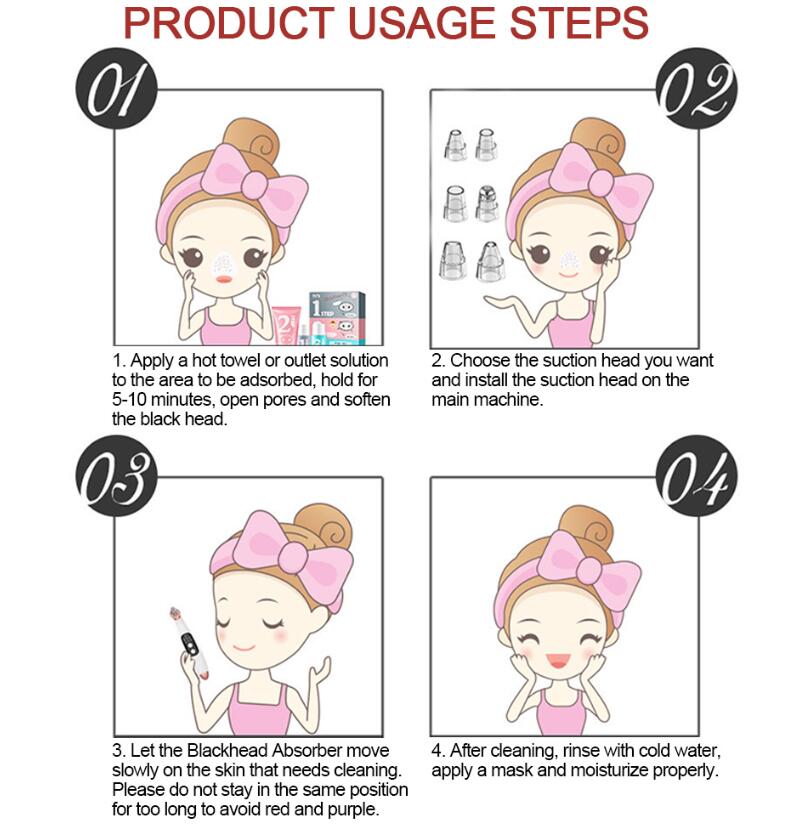 2. Multi-functional Cleaning Beauty Instrument --- Strong suction with Vacuum Extraction, Refine coarse pore, 3. Exfoliate dead skin, Blackhead Acne Remover, reduce Grease, Dermabrasion, Skin Rejuvenation. Effectively and deeply cleansing for different types of skin.