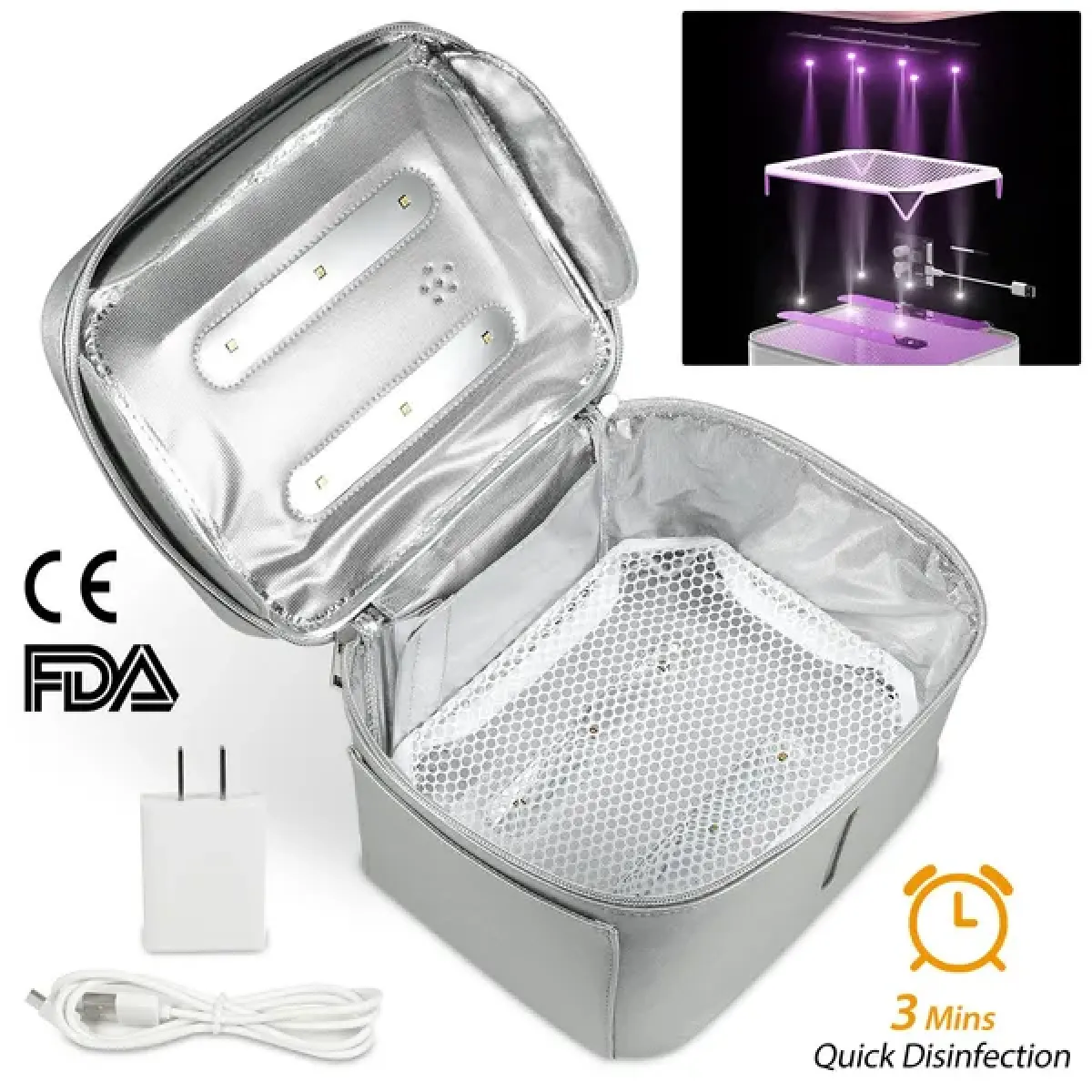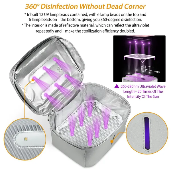*Advanced LED UV Lights*:12 UV lamp brads contained,with 6 lamp beads on the top of the box and 6 lamp beads on the bottom,giving you 360-degree disinfection. Assuming that it is 3 minutes each time and 60 times a day,that is 3 hours a day. In this way,the bulbs can be used for about 9 year. Moreover,the intensity of the 12 deep ultraviolet disinfection lamps is equal to more than 20 times of the intensity of the sun that states the effective sterilization rate was 99.9%. *Safe and Healthy*:The UV wave length is from 260nm to 280nm. It can effectively kill bacteria,fungi,molds viruses,etc.. And there is no any residual generated throughout the process. Built-in particular safety design,the LED UV light will be shut off once the sterilization bag is opened. Completely safe and environmentally friendly approved by CE,RoHS,FCC official certification. *Multi-Purpose Disinfection with About 20L Capacity*:It can be used widely and the storage is enough to disinfect several objects at once time,used in the bathroom,kitchen or nursery. For headphones / hearing aids / stethoscopes / dentures / toothbrushes / beauty tools / feeding bottles / forks / knife / glasses / keys/baby products/ Underwear/ Jewelry/ children’s toys etc.. *Portable & User-Friendly*:Size 9.8" x 7.9" x 6.3" and Weighs only 1.34lb,perfect for travel. Powered by USB port,just plug it into the USB port on PC,power bank or USB charger and ready for sterilization. One-button operation and automatic shutdown function is easy for use and there’s a little window on the front of the unit that let you know the UV is working. *Widely Used*:Home and travel essential disinfection tool. Adult underwear,baby clothes,towels and all kinds of small items that can be put in can be disinfected. A perfect gift for lovers,wives parents and friends,etc.. *Specifications*: