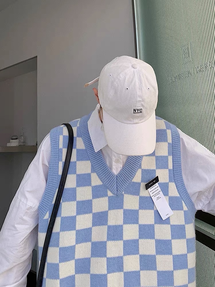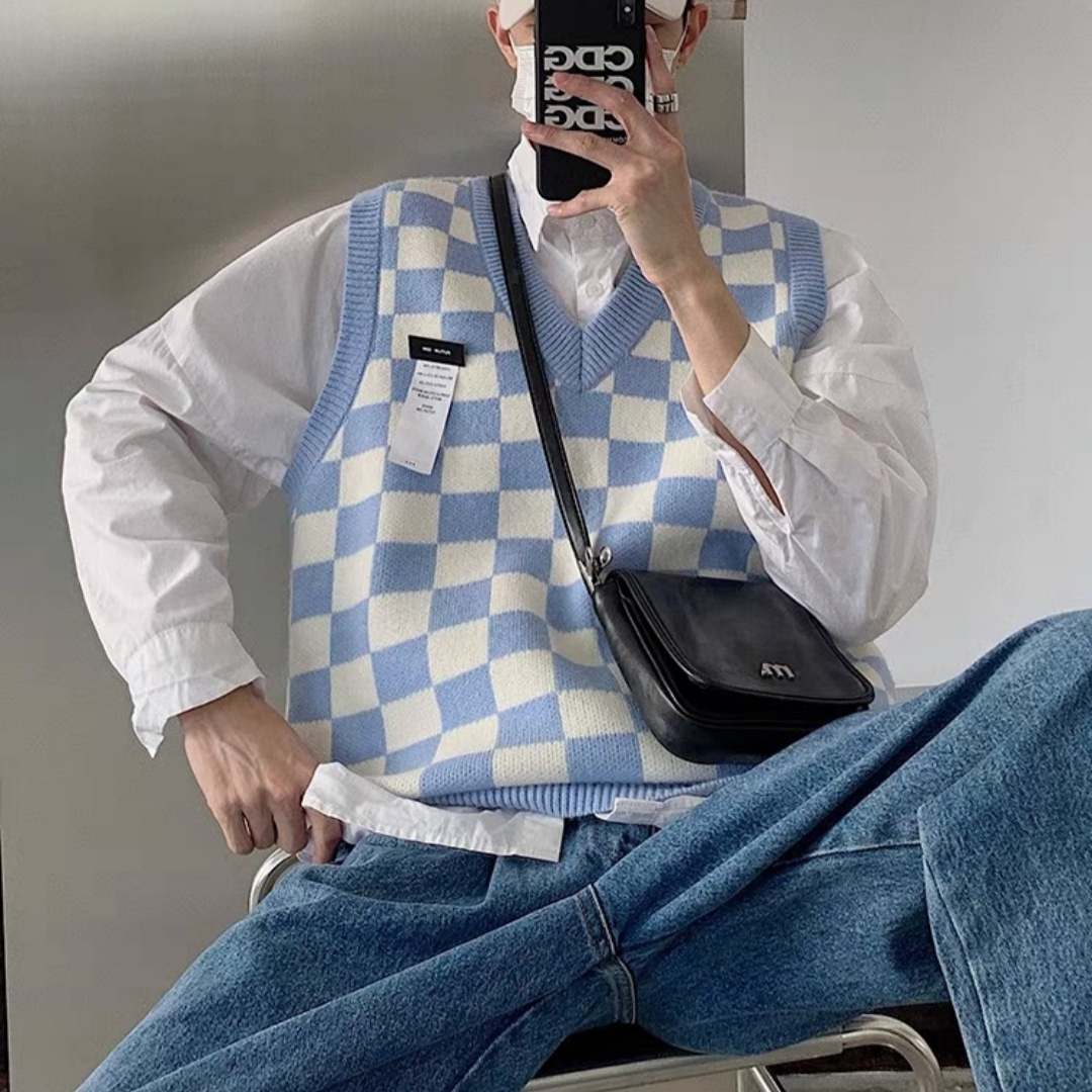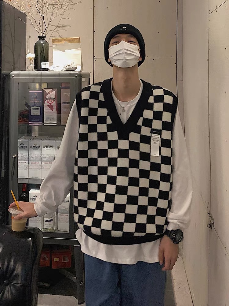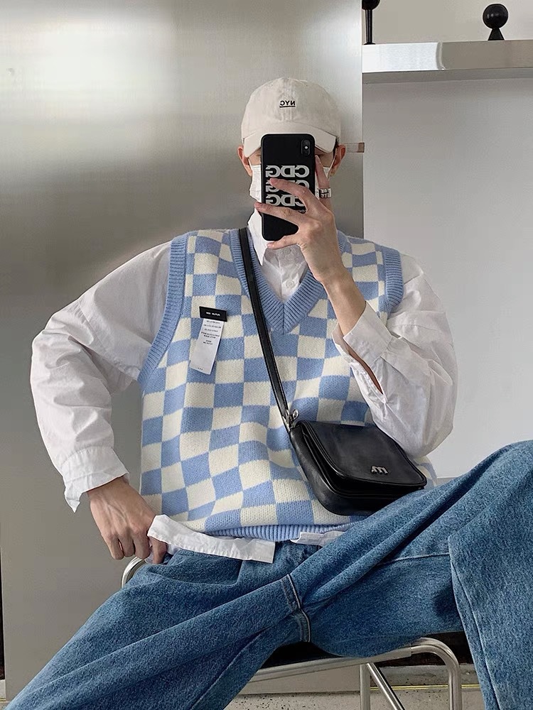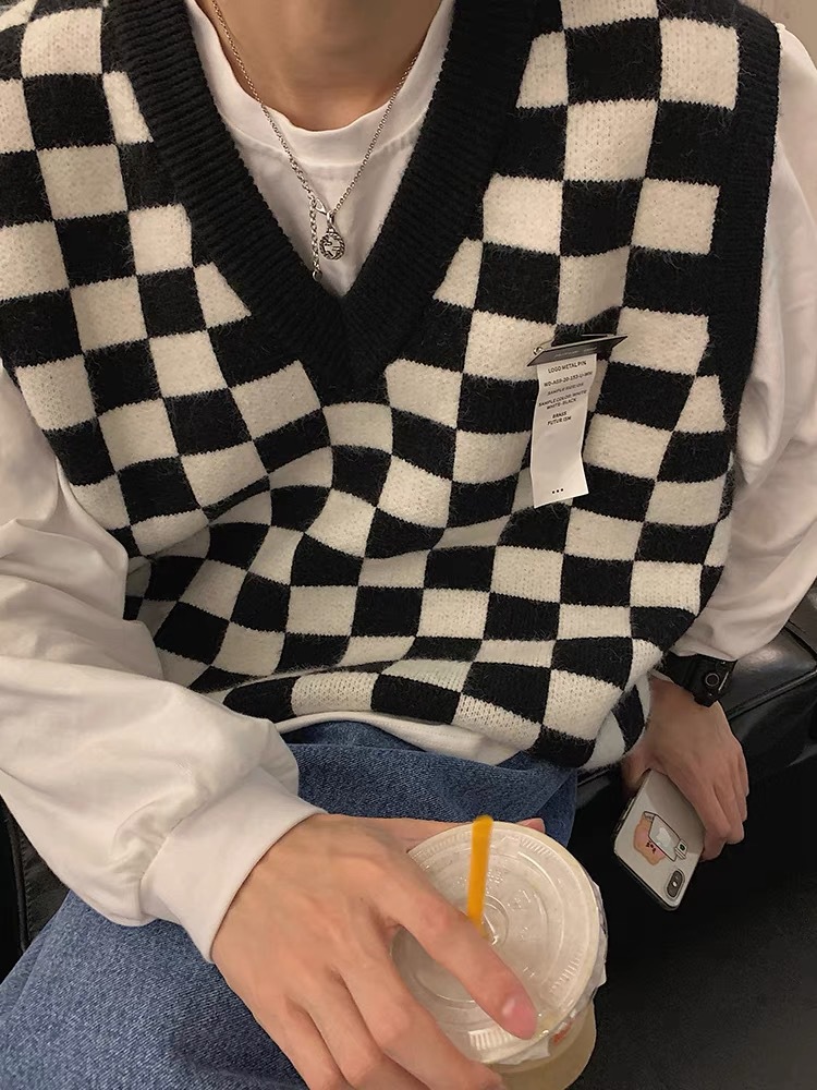 V-collar Preppy Style Chessboard Plaid Sweater Vest Knitted Sweater Men