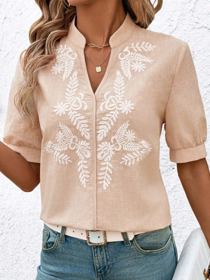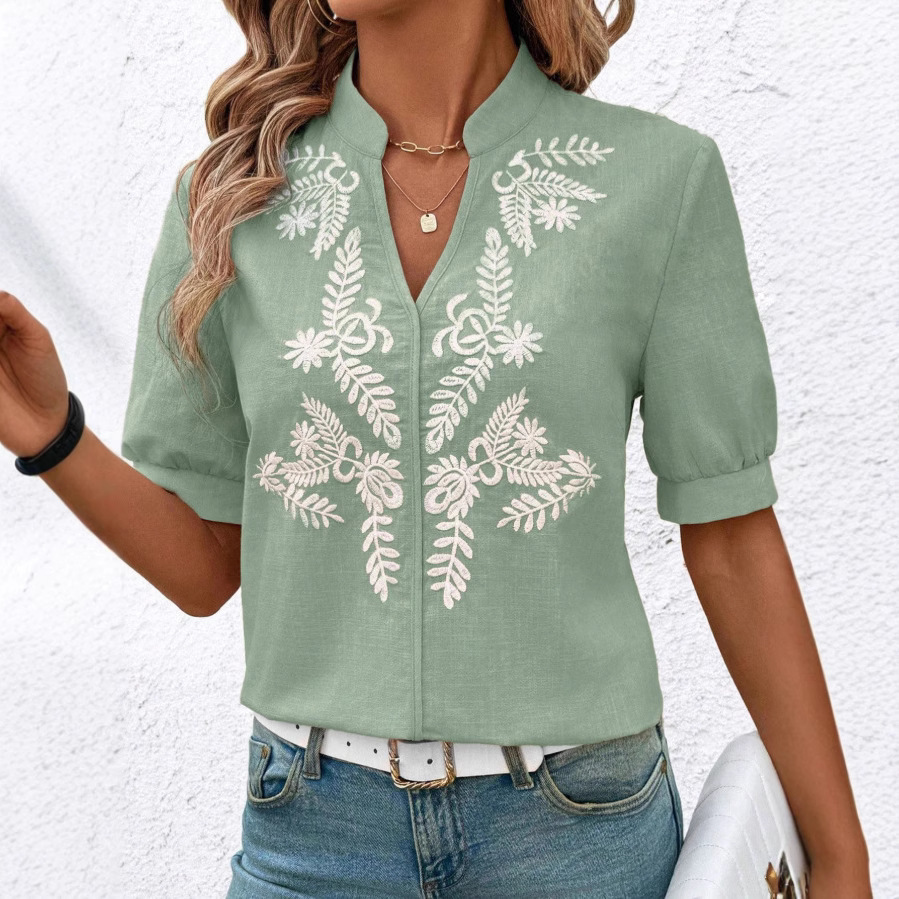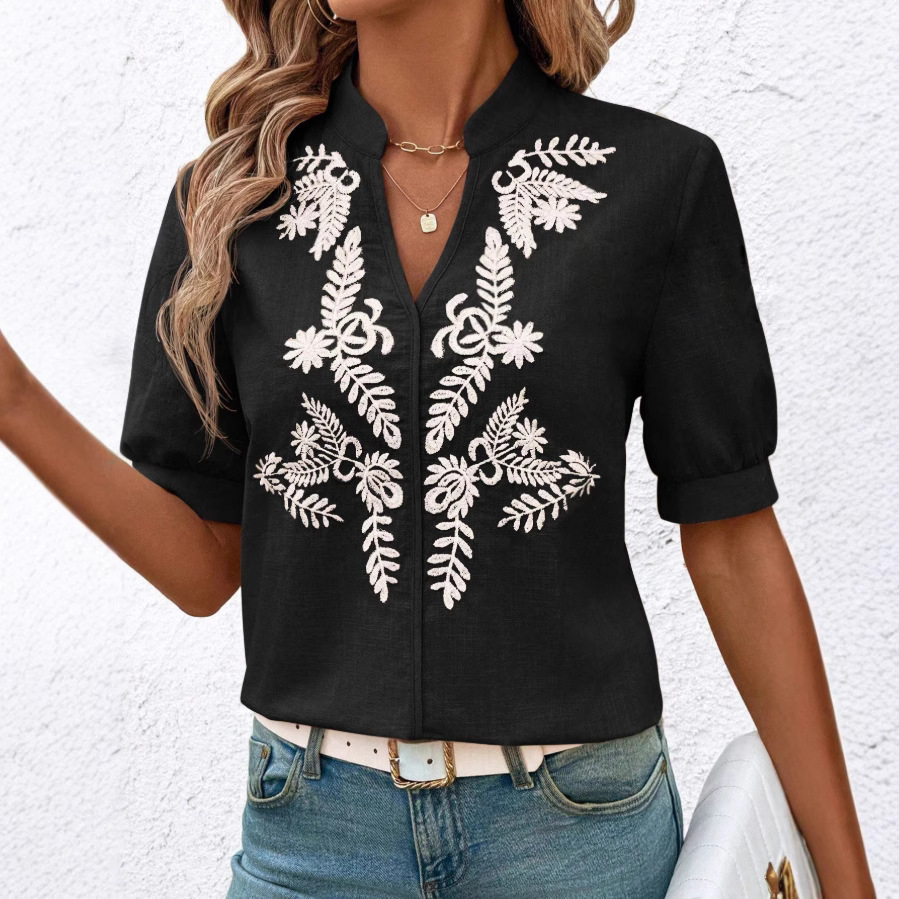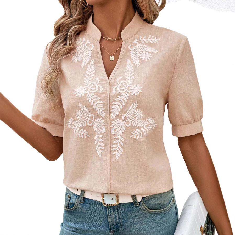 V-neck Fashion Pure Cotton Embroidery Short-sleeved Casual Shirt For Women