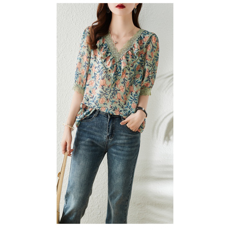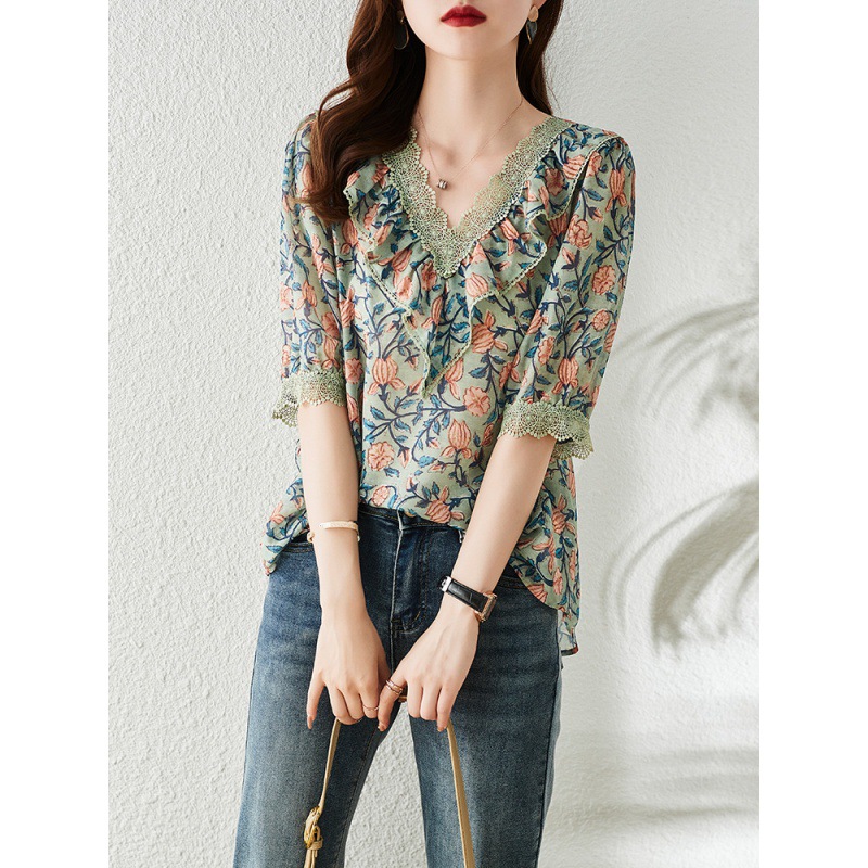 V-neck Floral Chiffon Shirt For Women