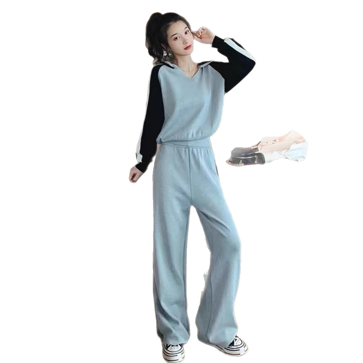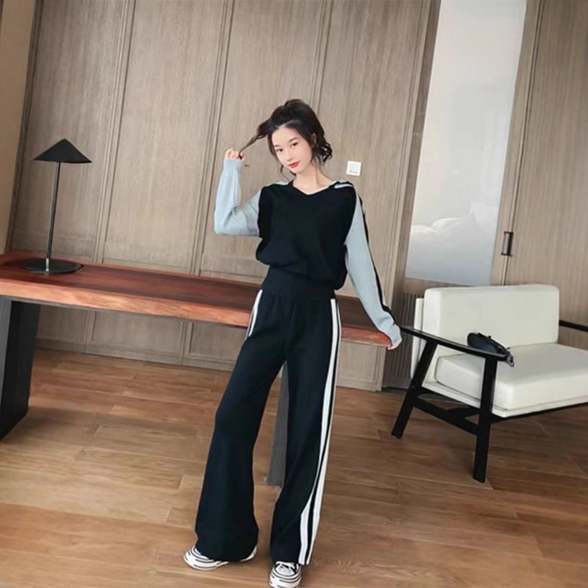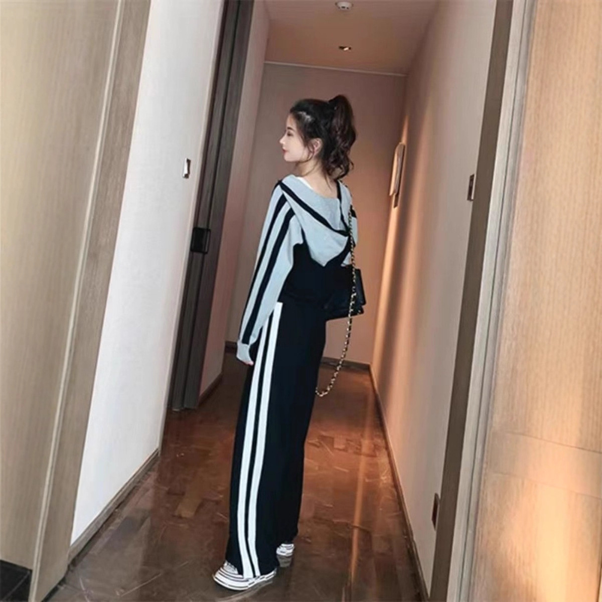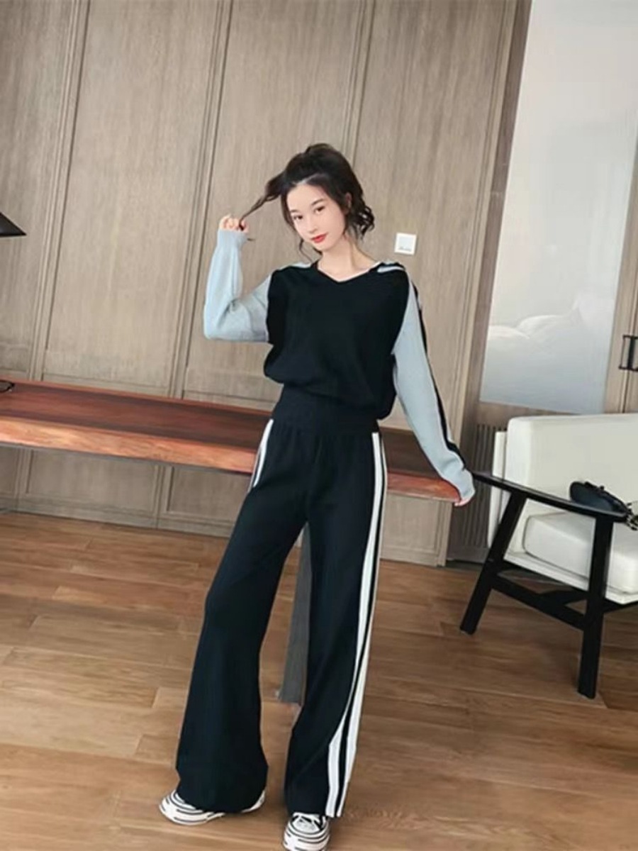 Color: gray coat black pants, black top and gray pants