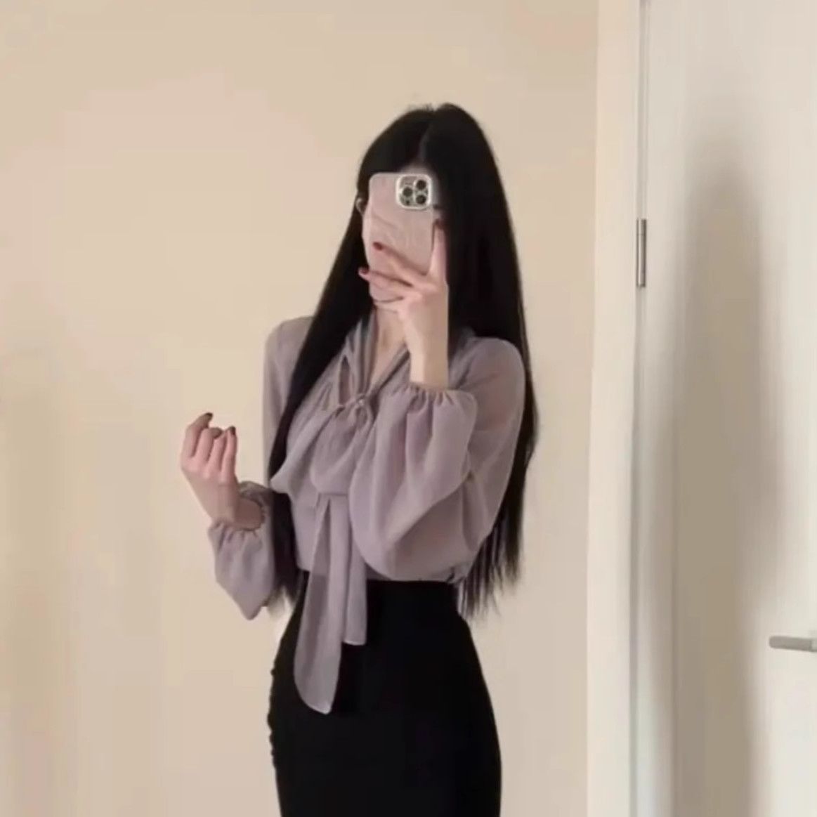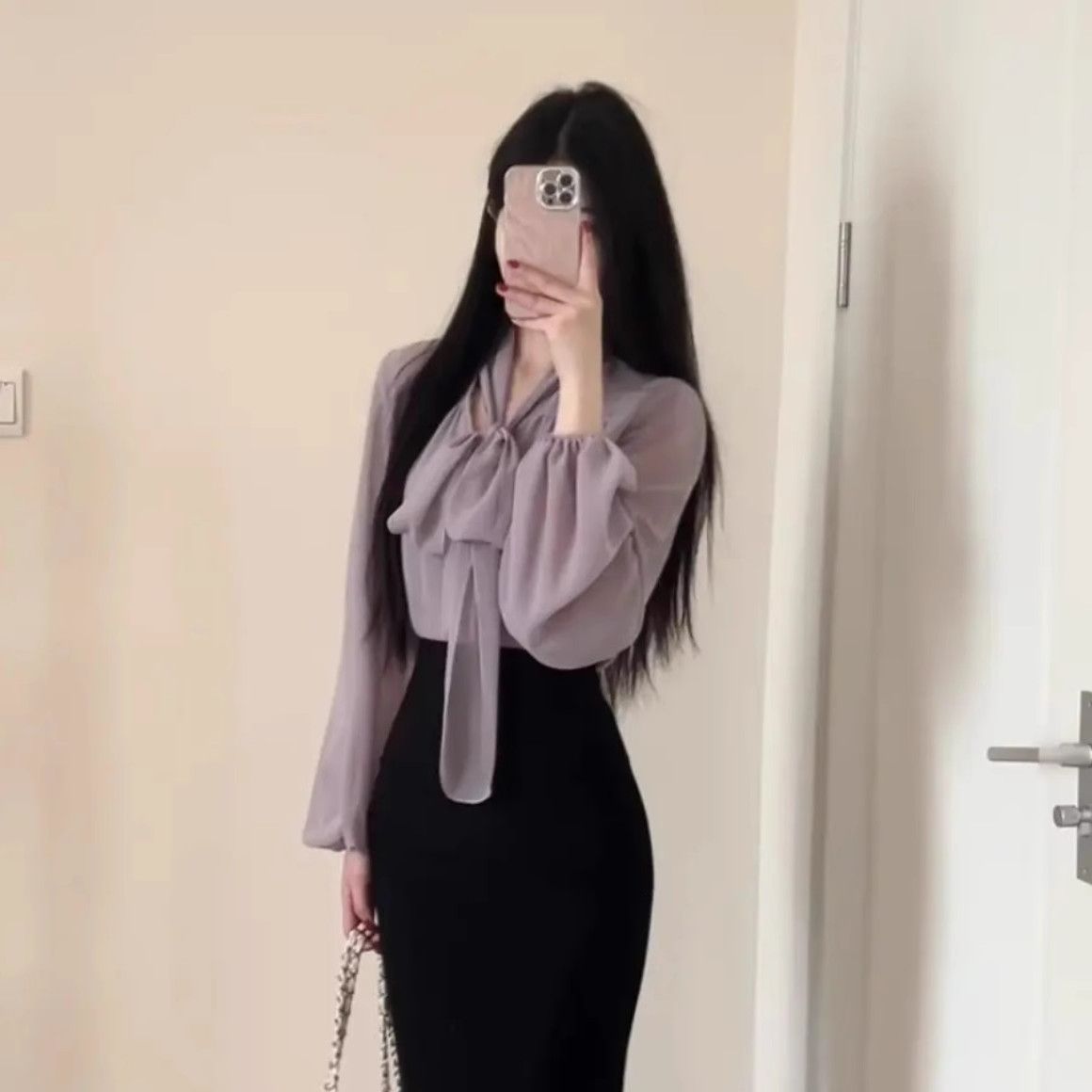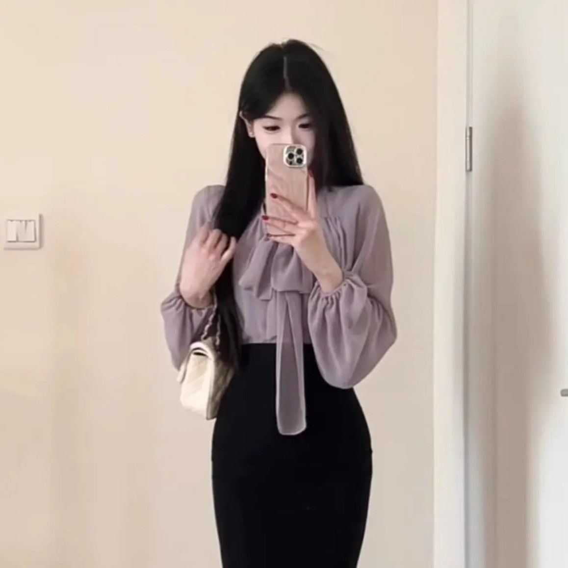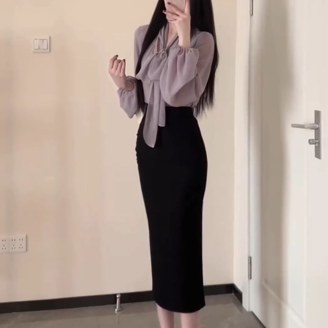 V-neck Lace-up Shirt Paired With A Bodycon Skirt Two-piece Set