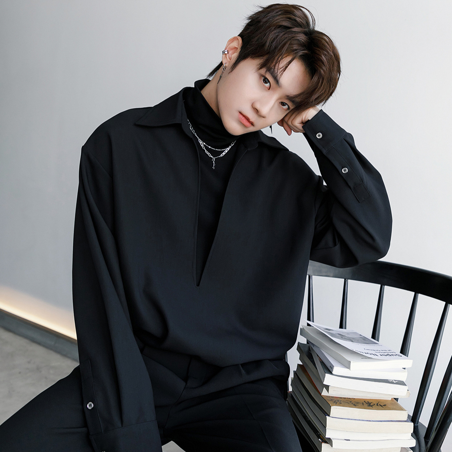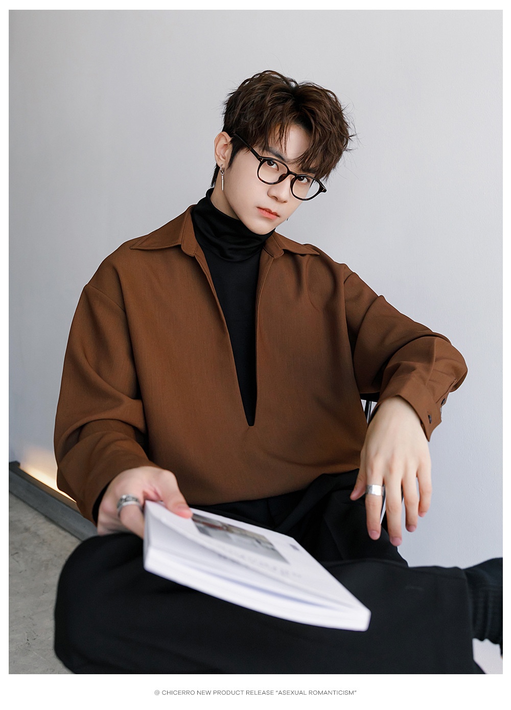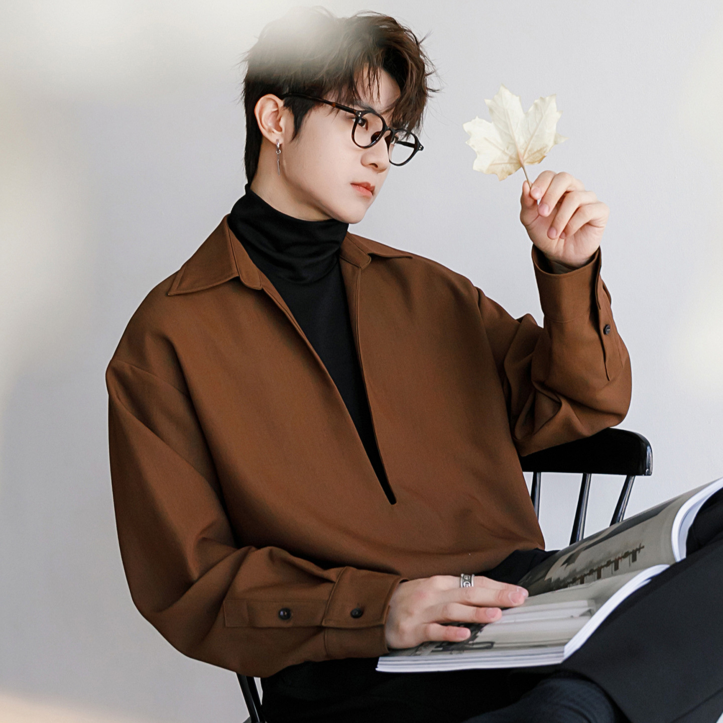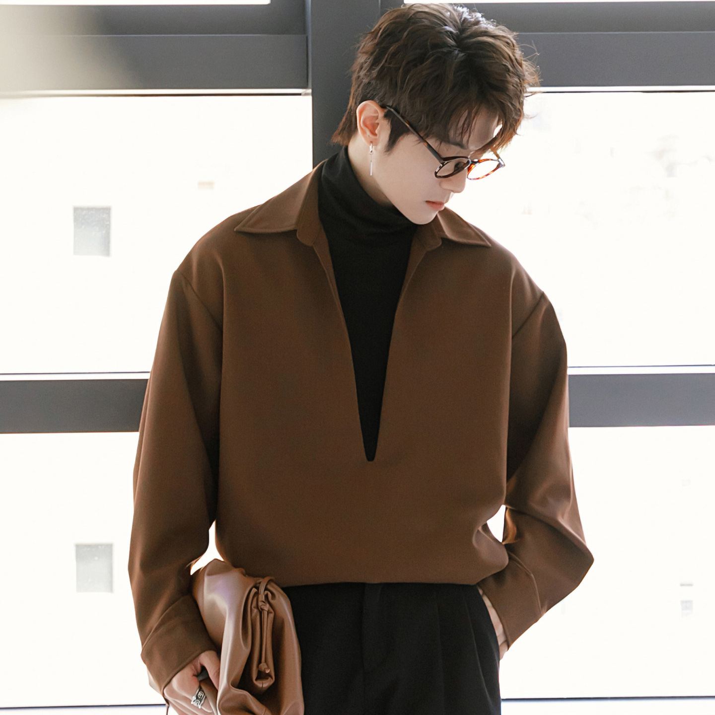 V-neck Long-sleeve Faux Two-piece Patchwork Contrast-color Pullover Shirt