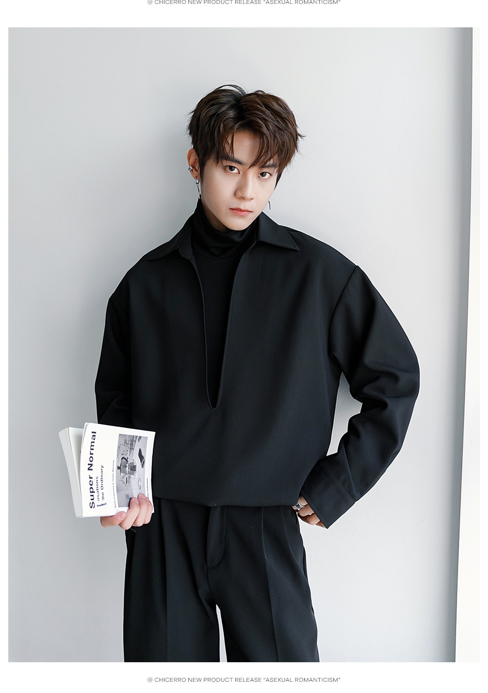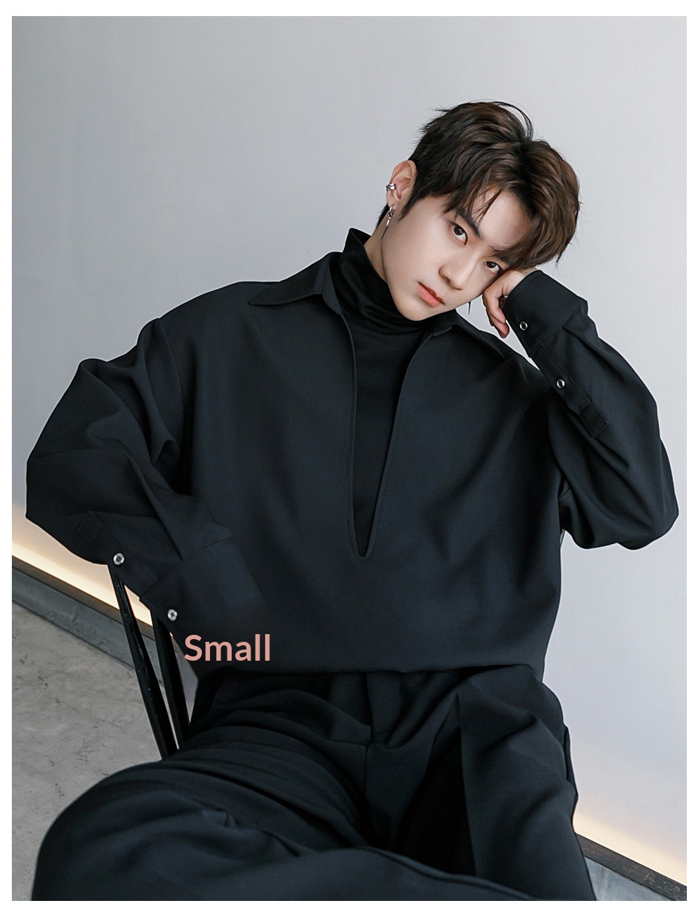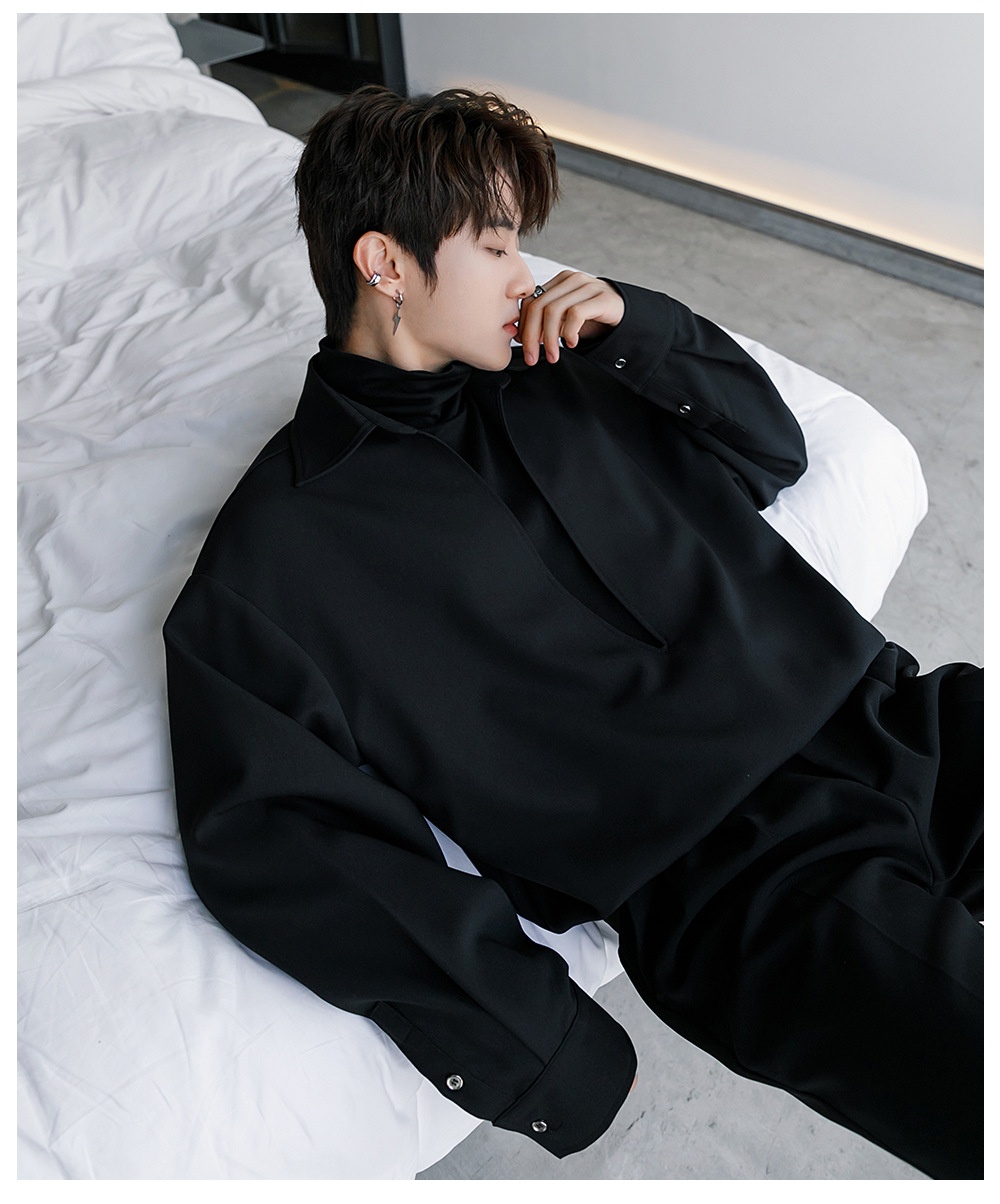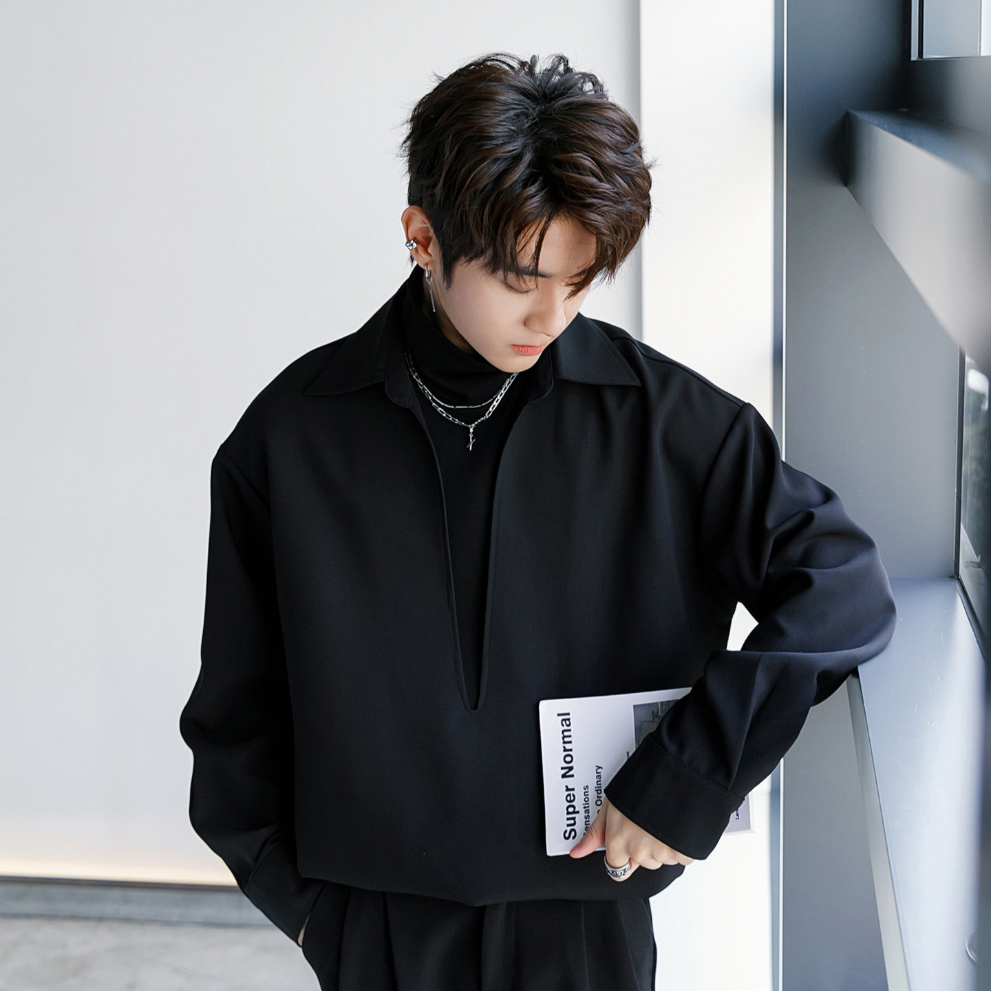 V-neck Long-sleeve Faux Two-piece Patchwork Contrast-color Pullover Shirt